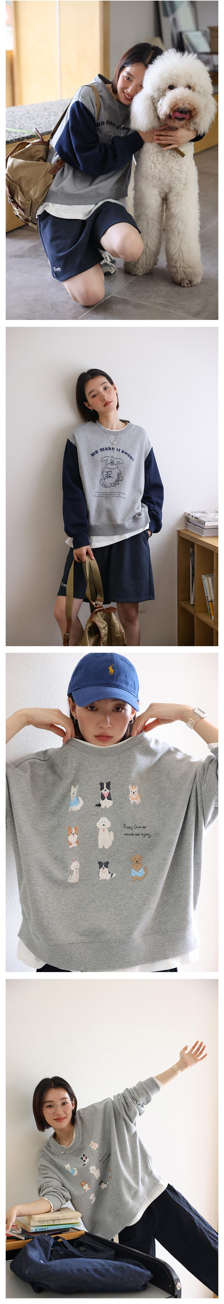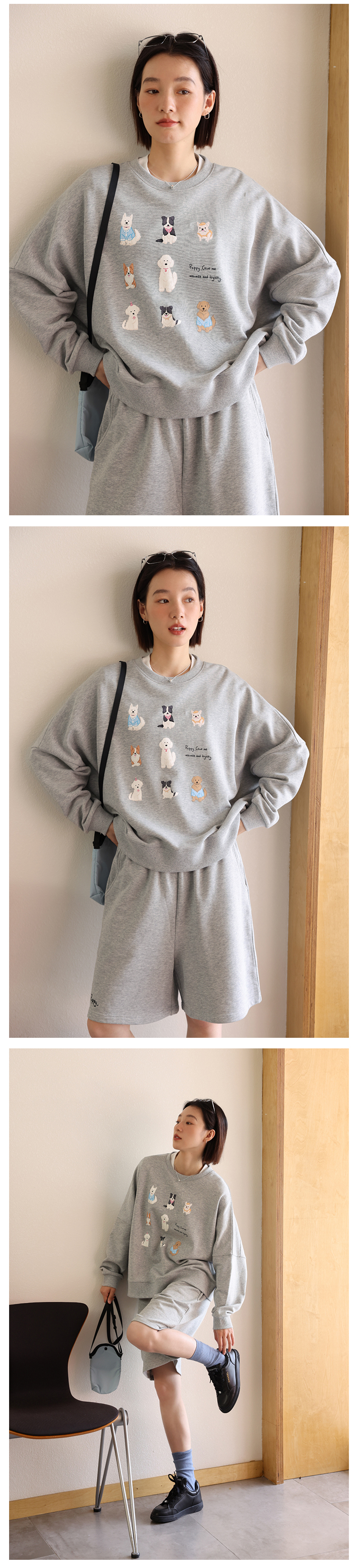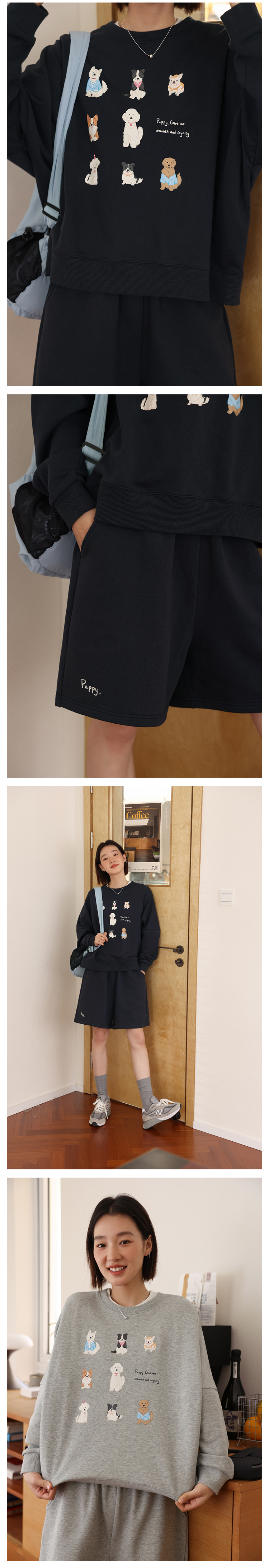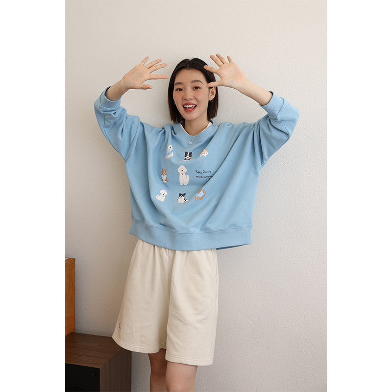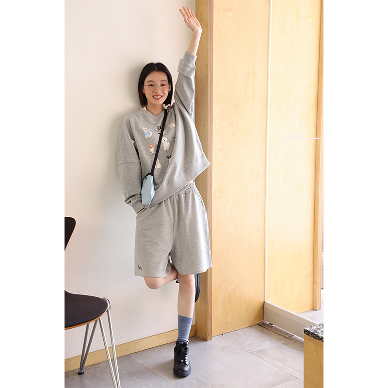 敘舊oldtimes 手繪狗狗印花灰色圓領厚棉T女寬鬆套裝秋季 W5456