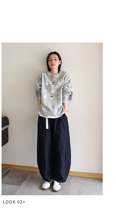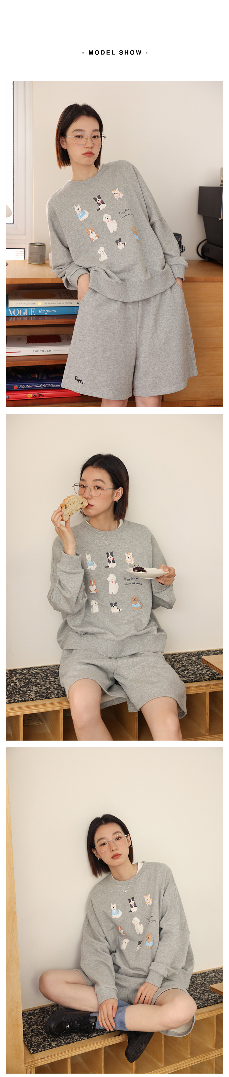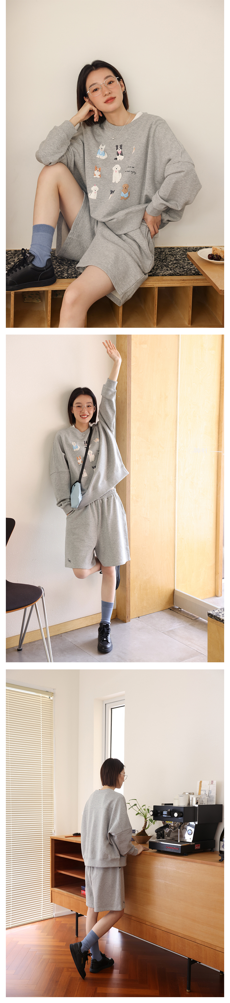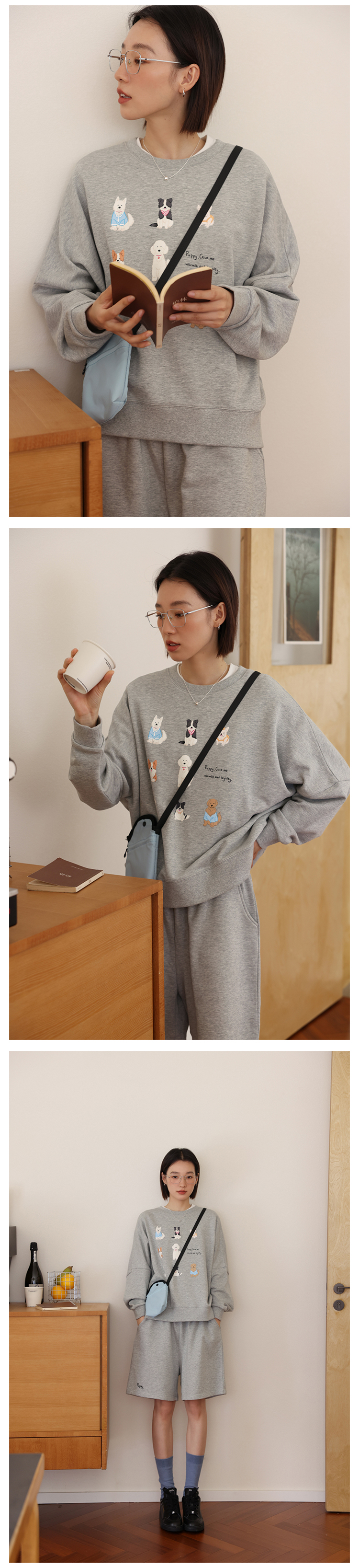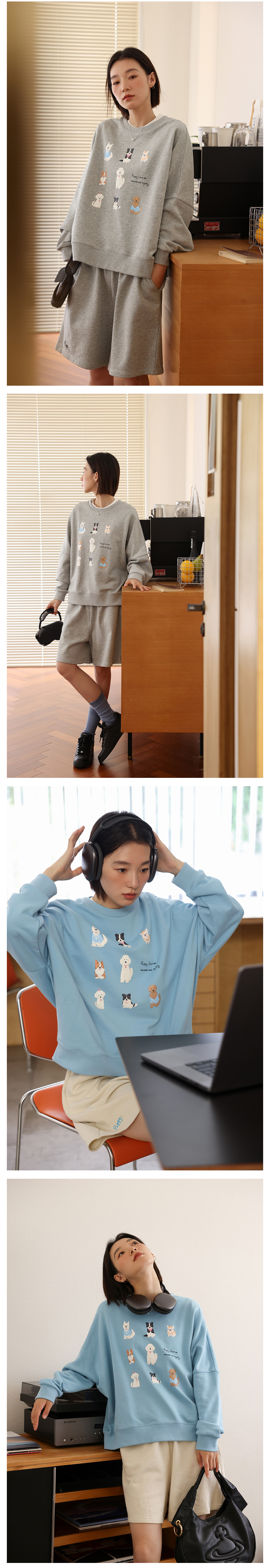 敘舊oldtimes 手繪狗狗印花灰色圓領厚棉T女寬鬆套裝秋季 W5456