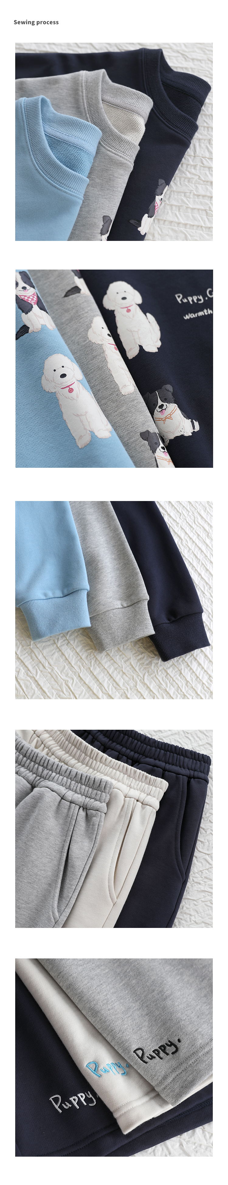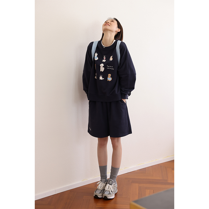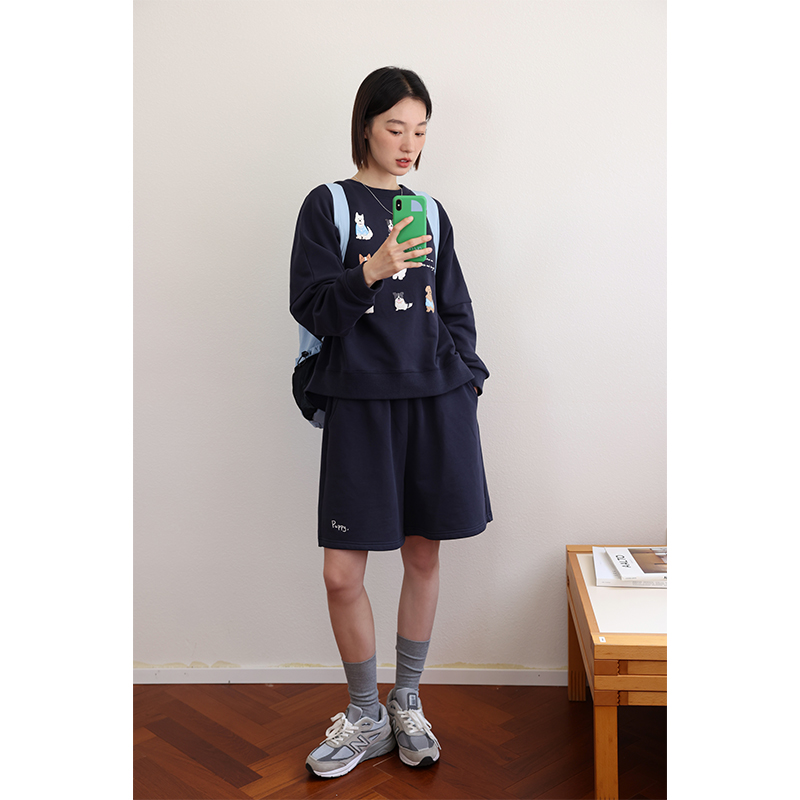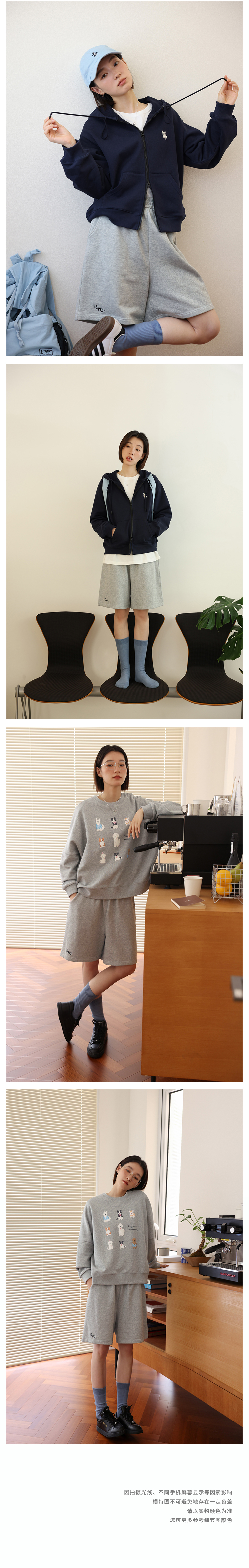 顏色分類 天藍色(衛衣),淺花灰(衛衣),藏青色(衛衣),米白色(短褲),淺花灰(短褲),藏青色(短褲)
