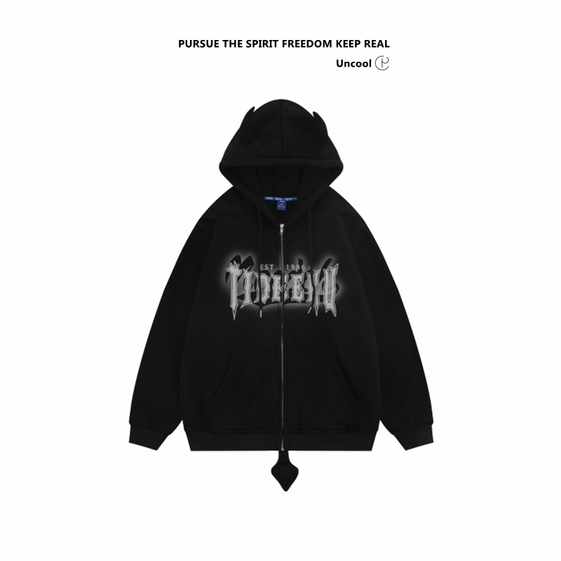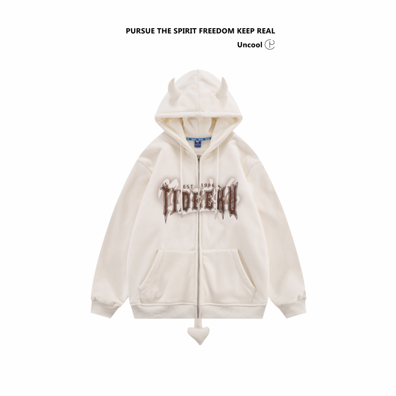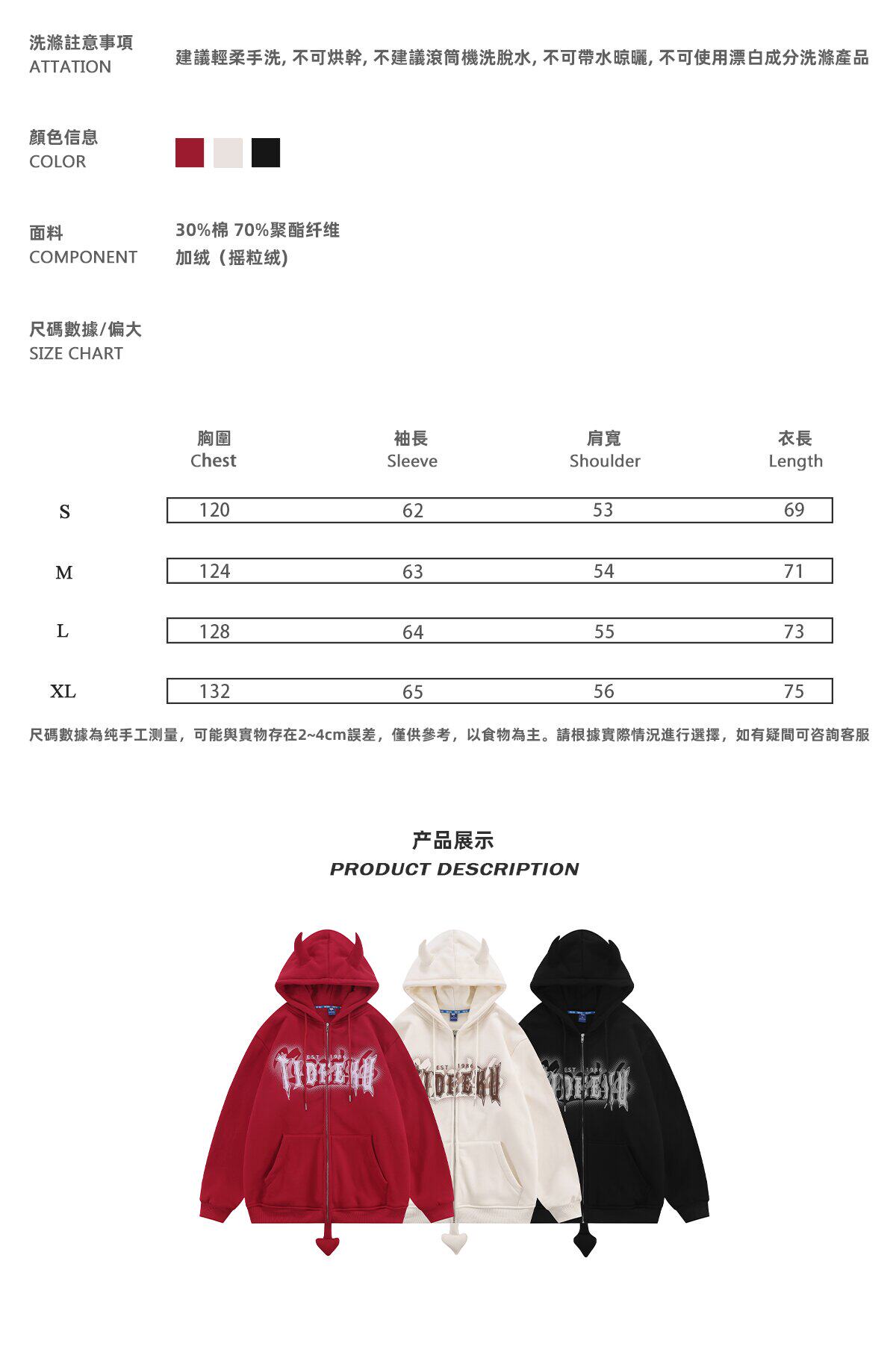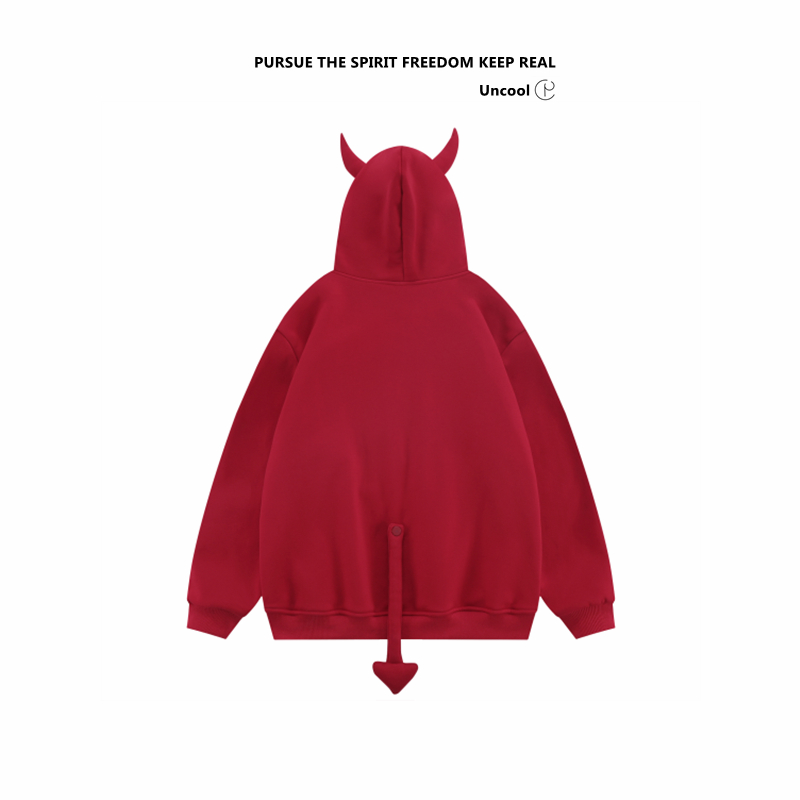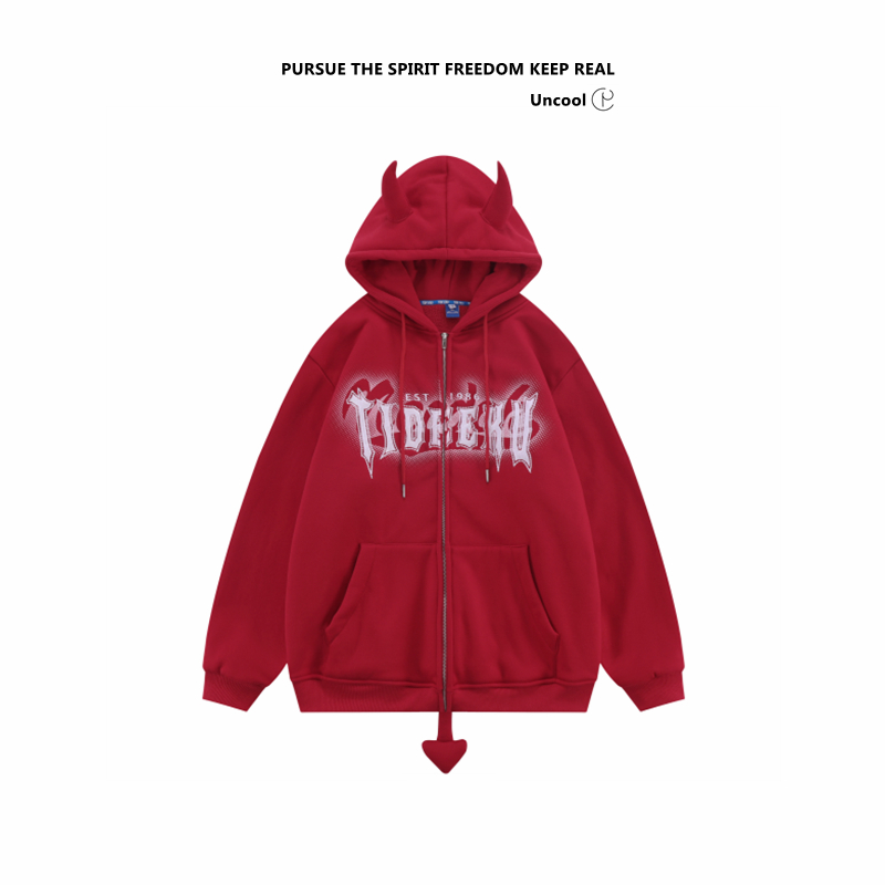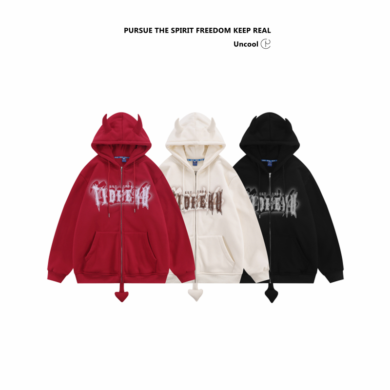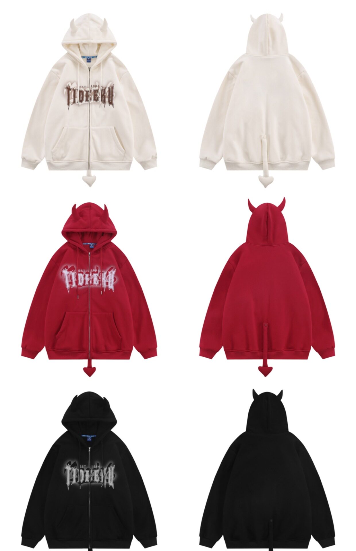 怪P 美式小眾惡魔牛角帽開衫厚棉T男女秋冬加絨寬鬆上衣外套潮