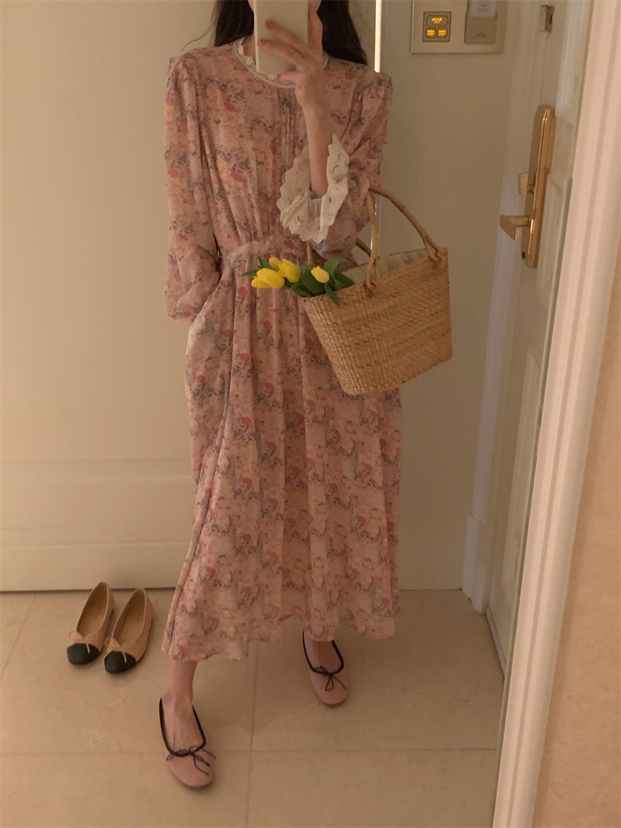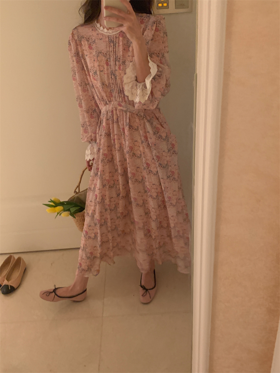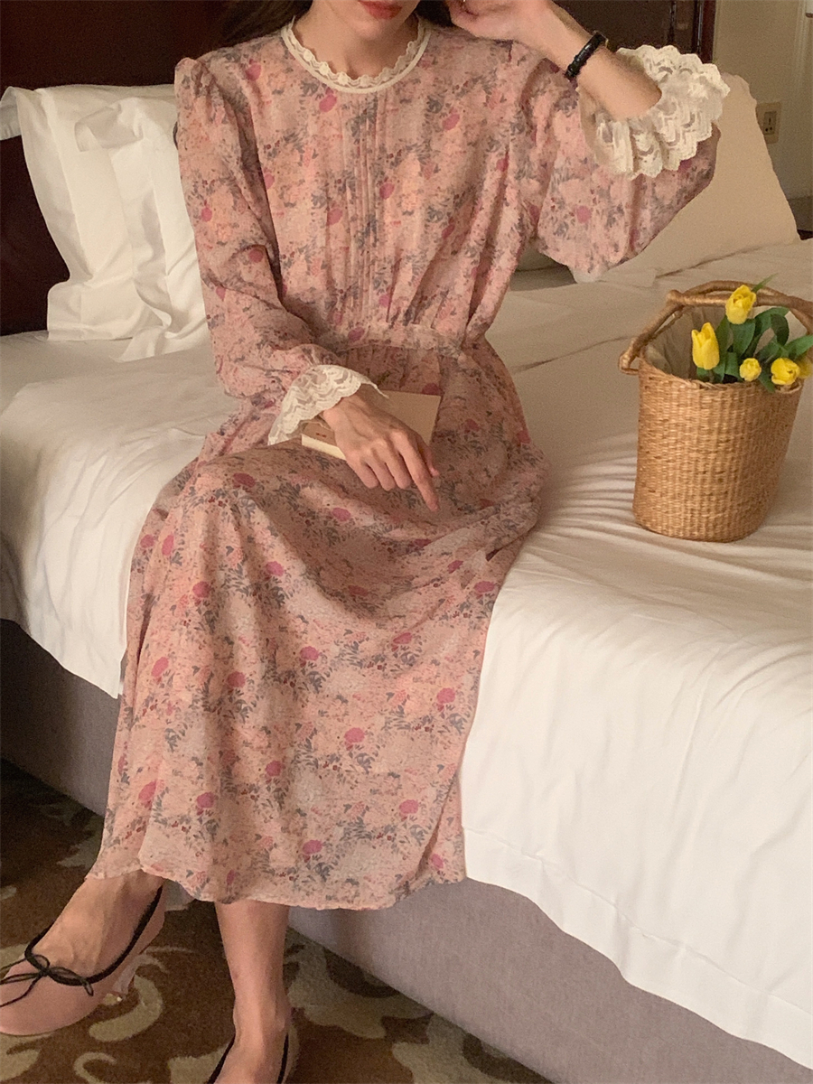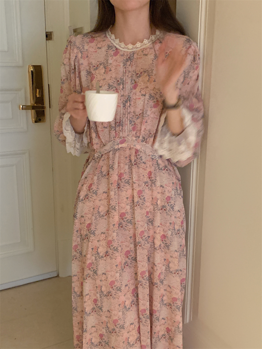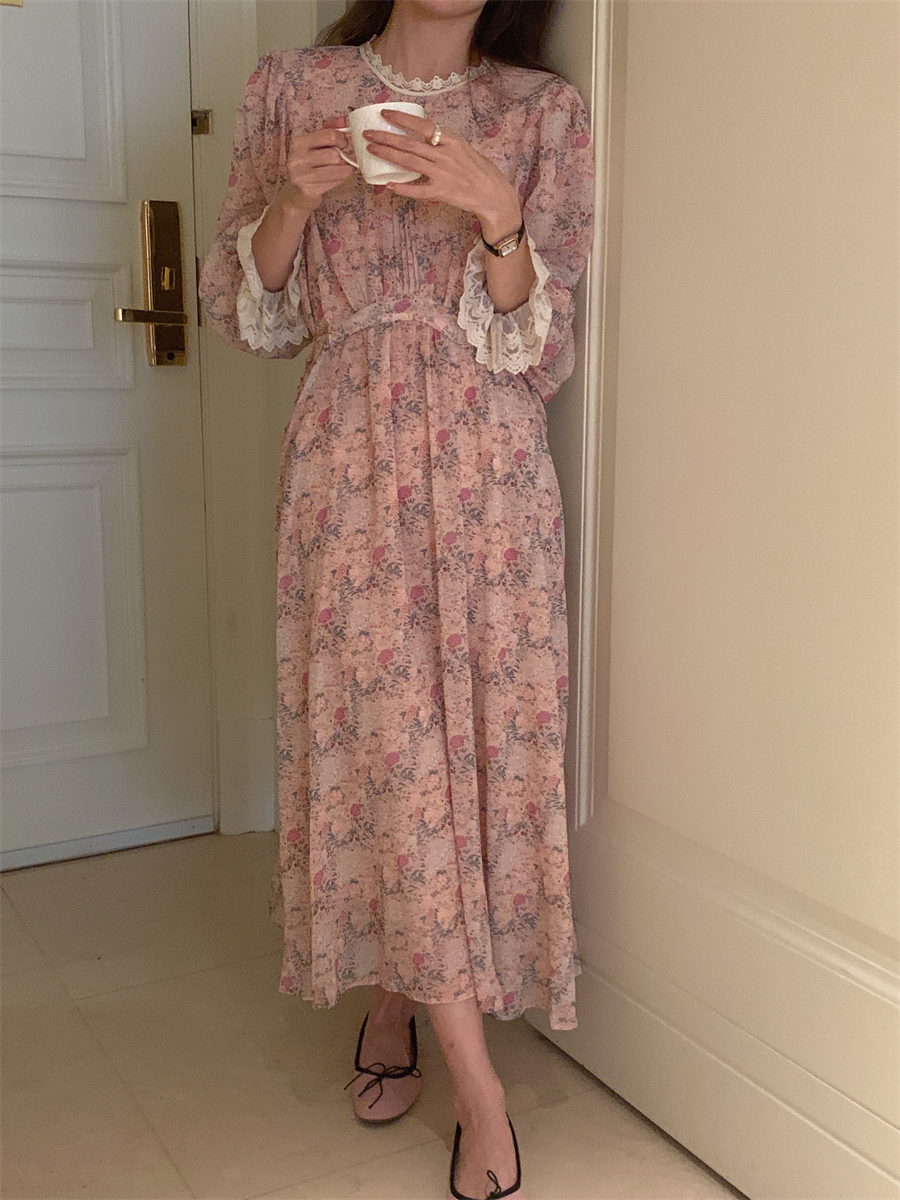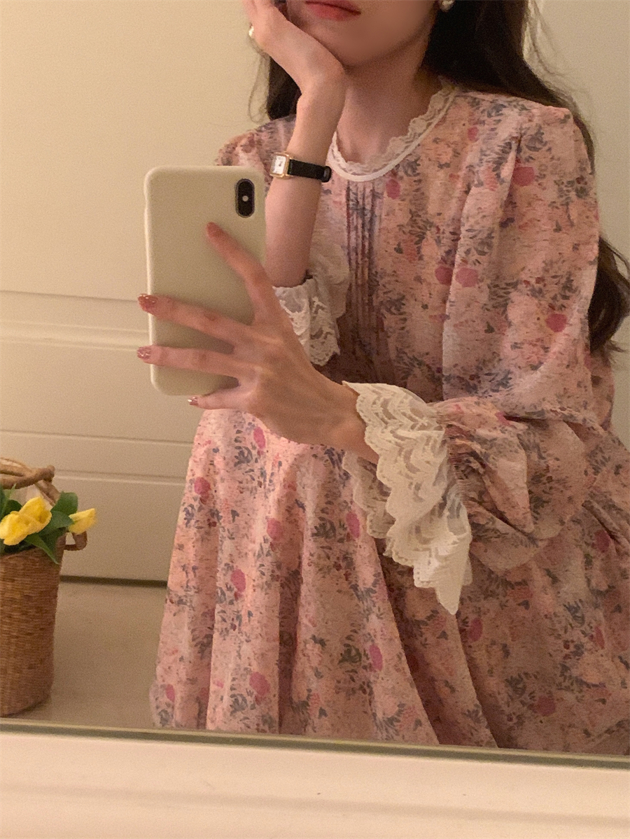 韩国chic春季法式浪漫圆领拼接蕾丝满屏碎花系带收腰喇叭袖连衣裙