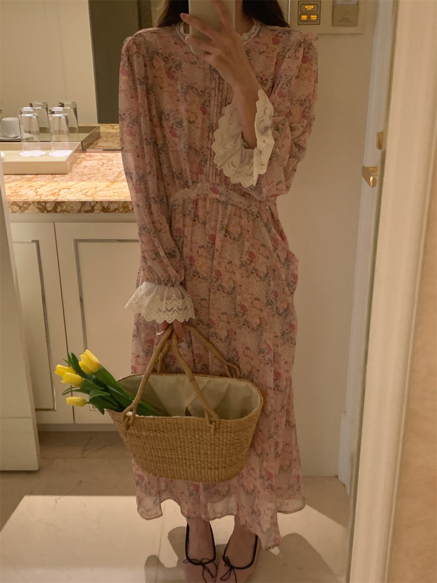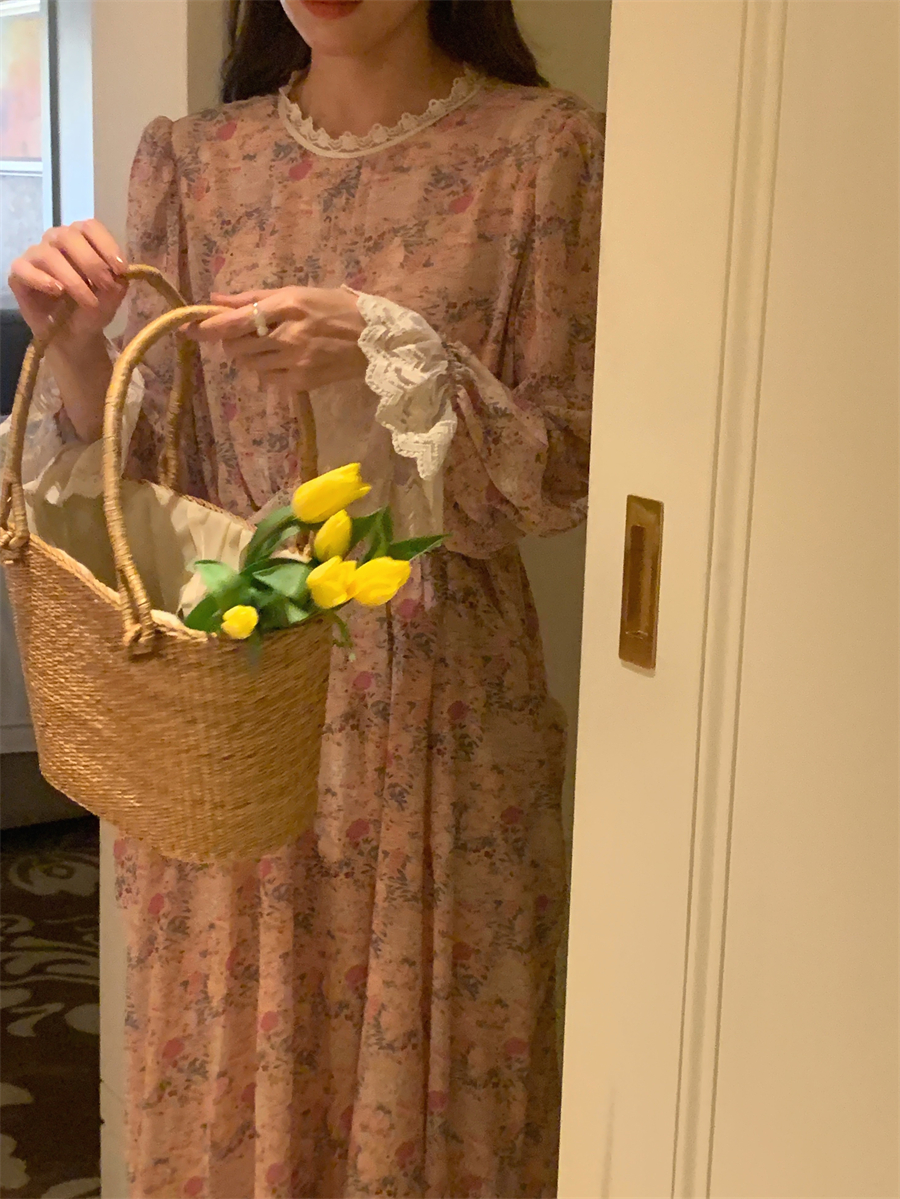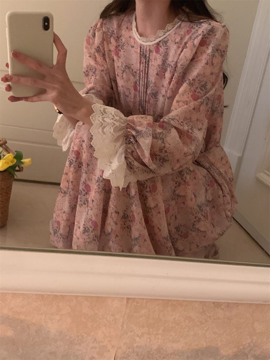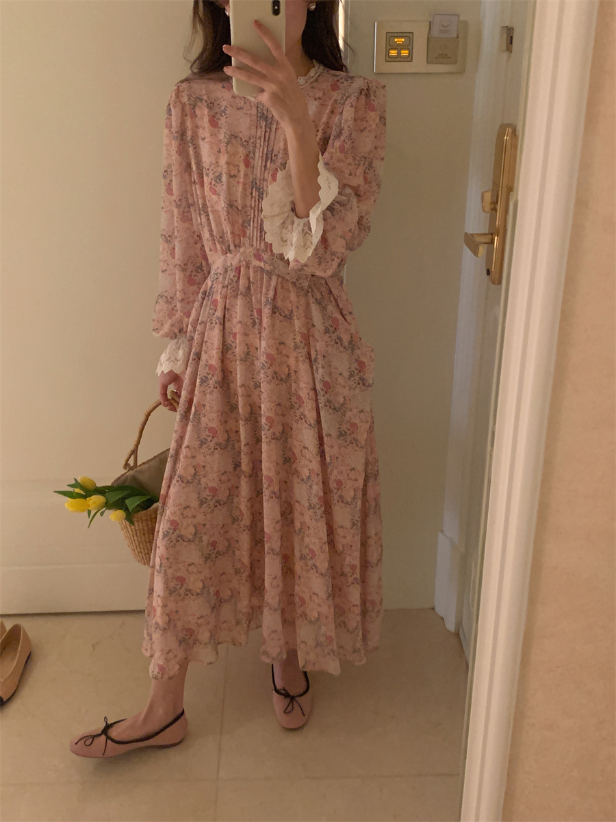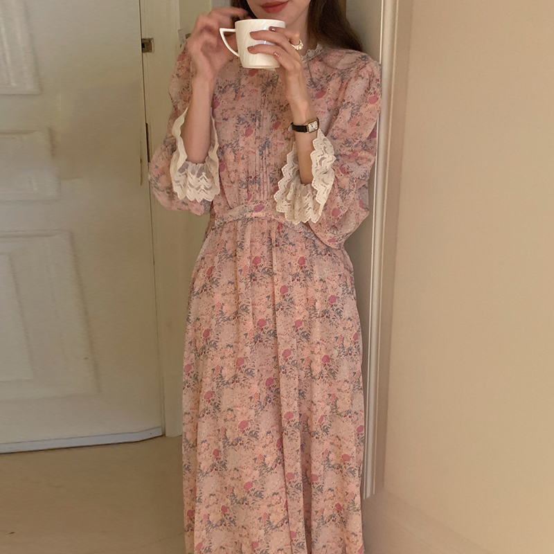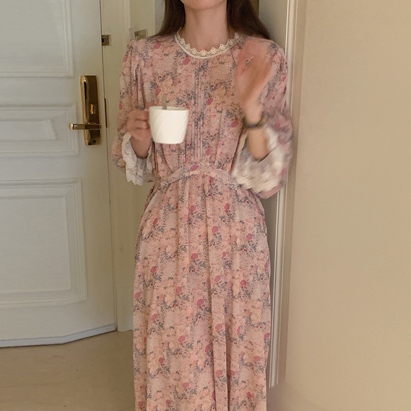韩国chic春季法式浪漫圆领拼接蕾丝满屏碎花系带收腰喇叭袖连衣裙