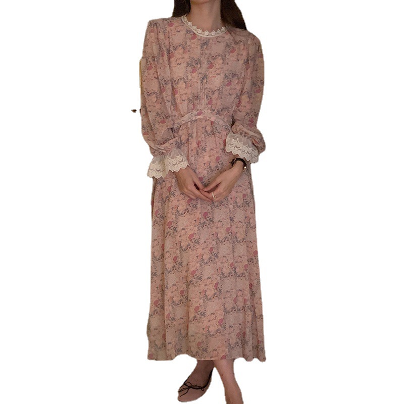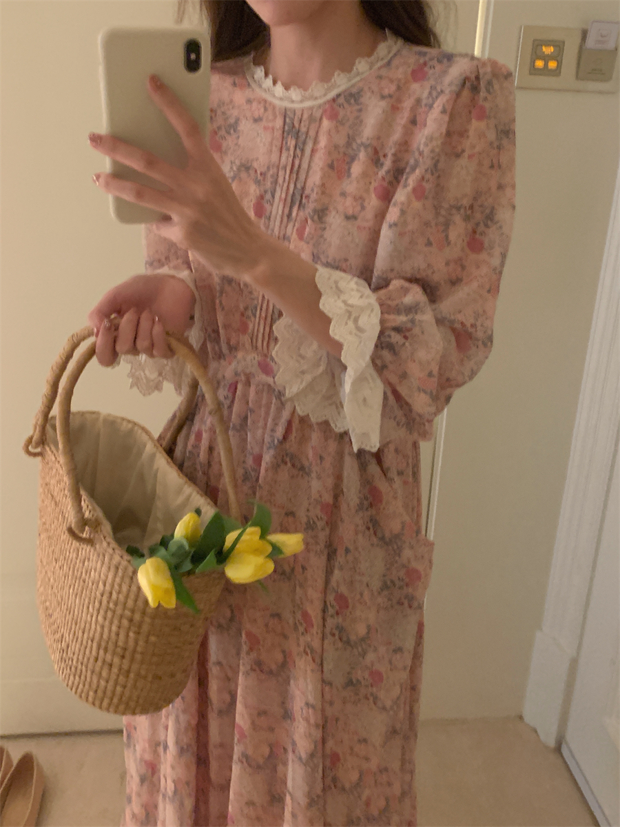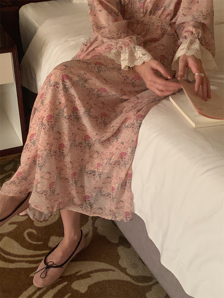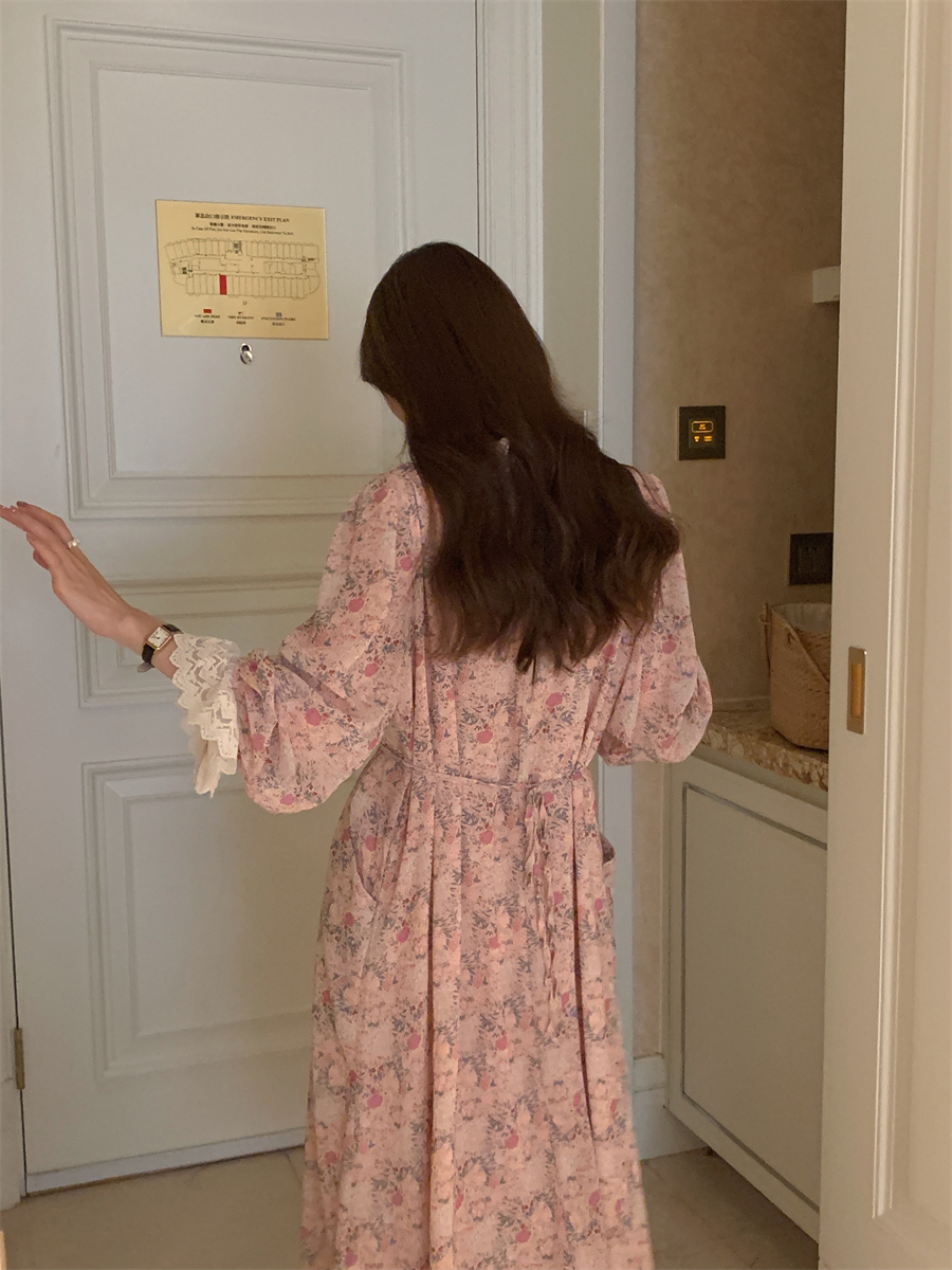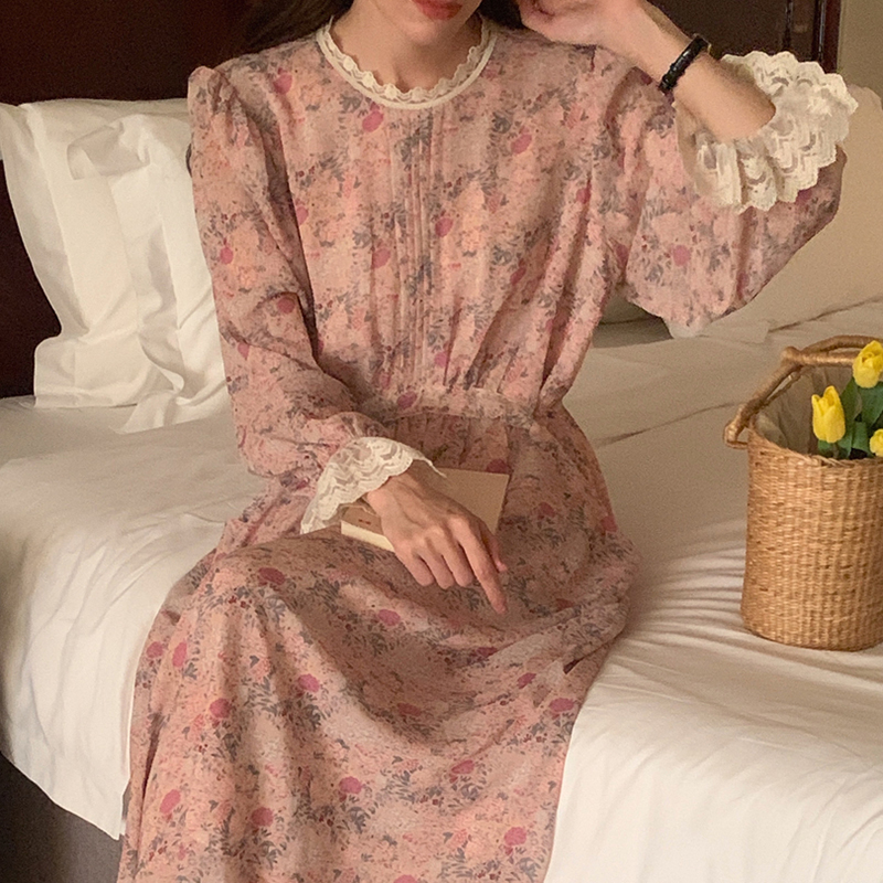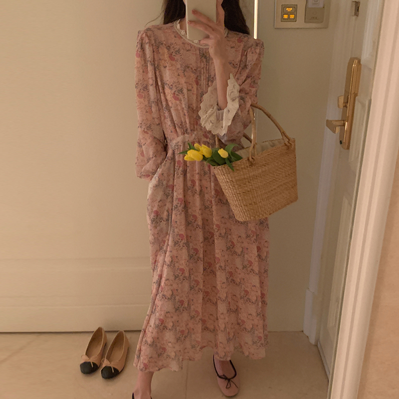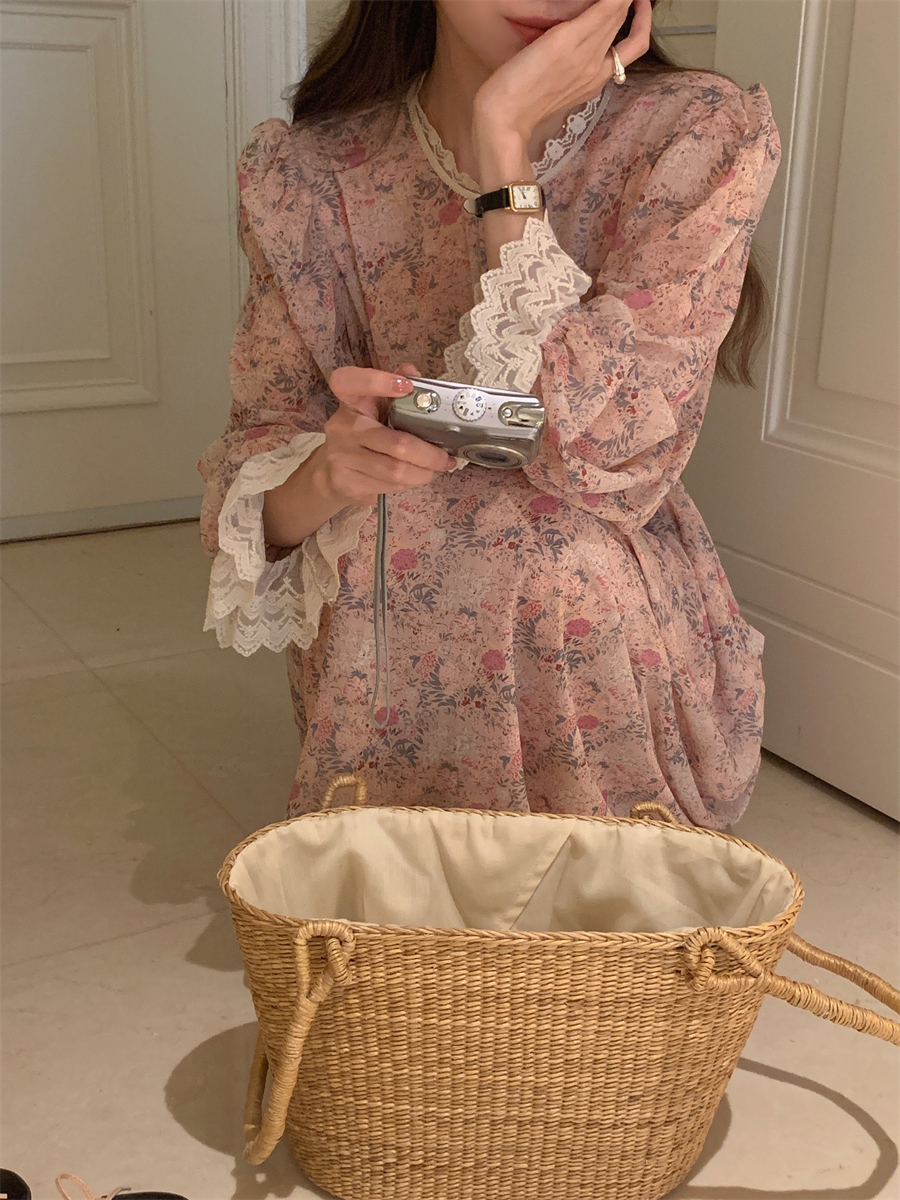 韩国chic春季法式浪漫圆领拼接蕾丝满屏碎花系带收腰喇叭袖连衣裙