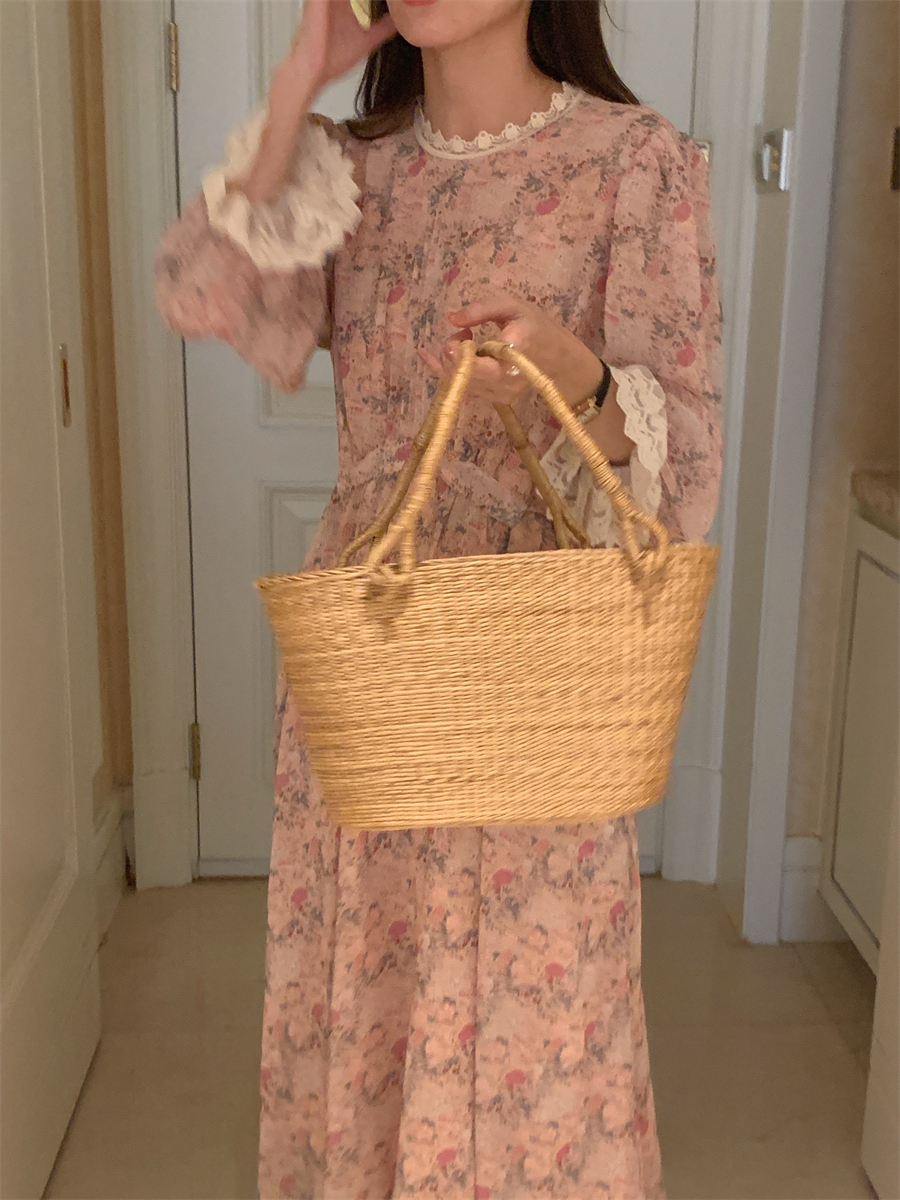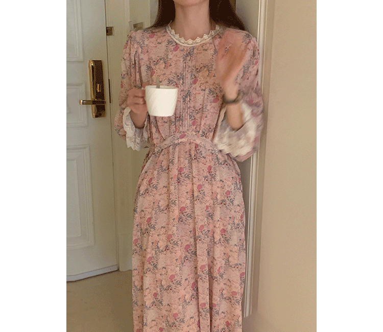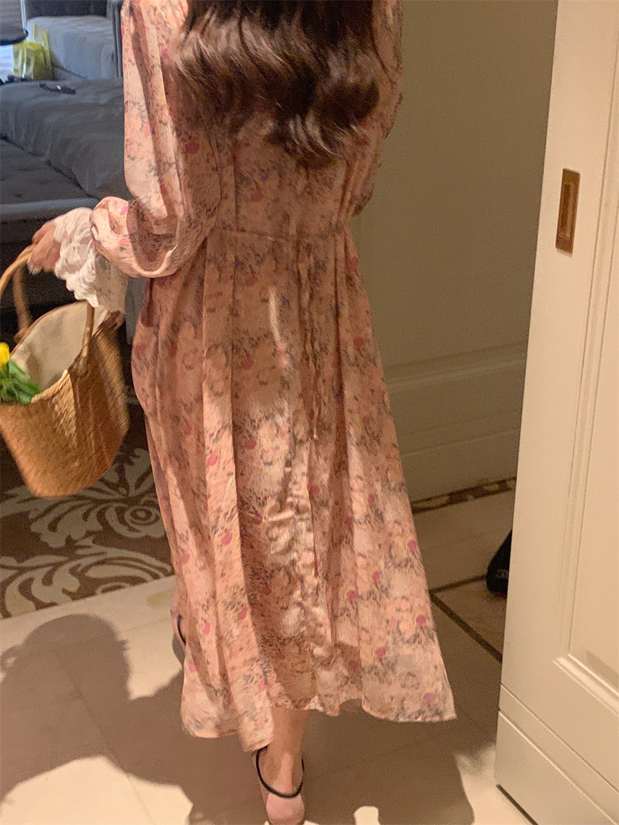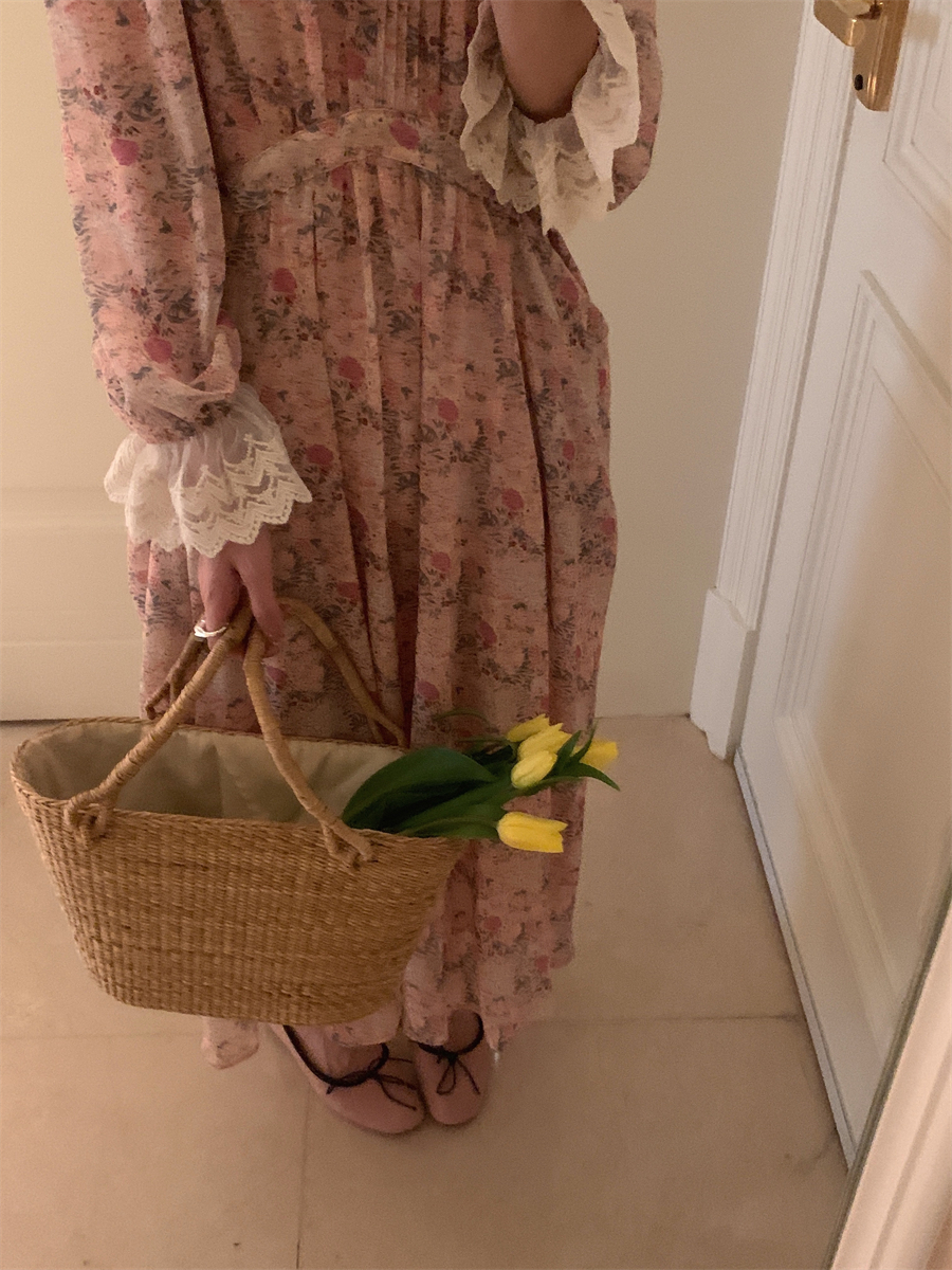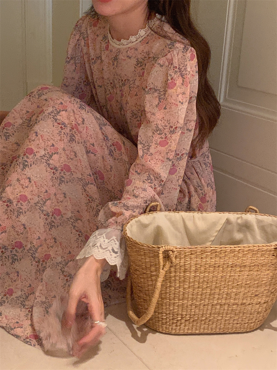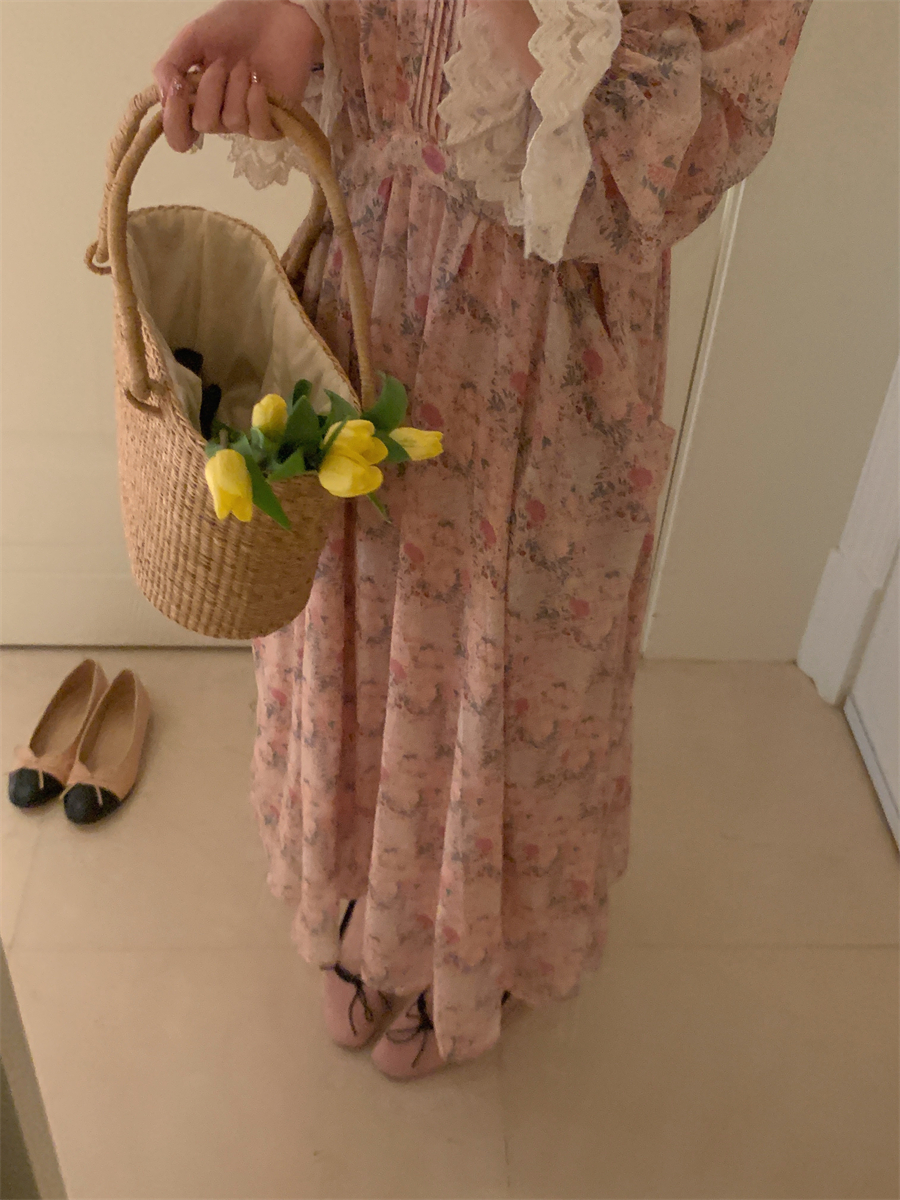 韩国chic春季法式浪漫圆领拼接蕾丝满屏碎花系带收腰喇叭袖连衣裙