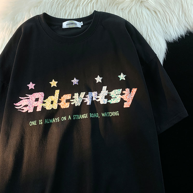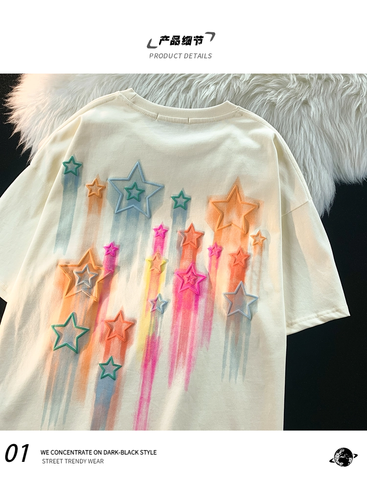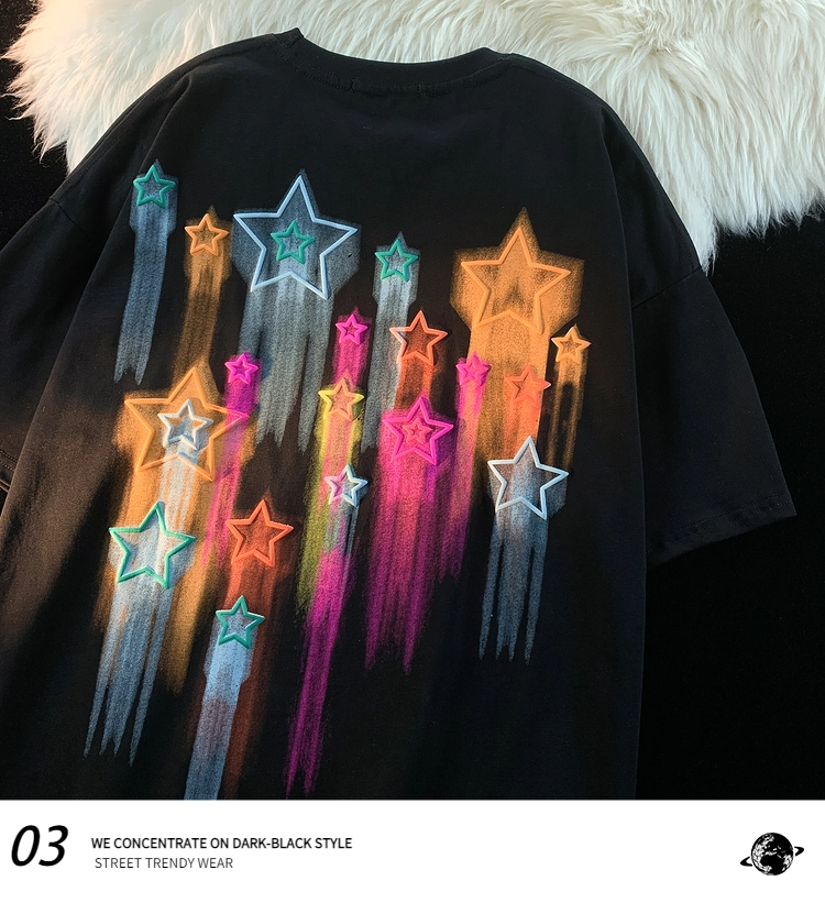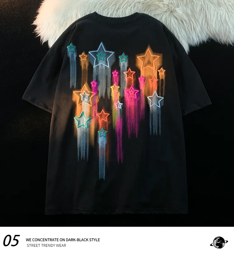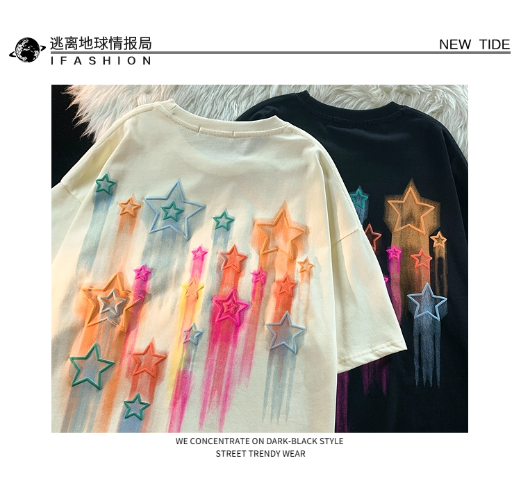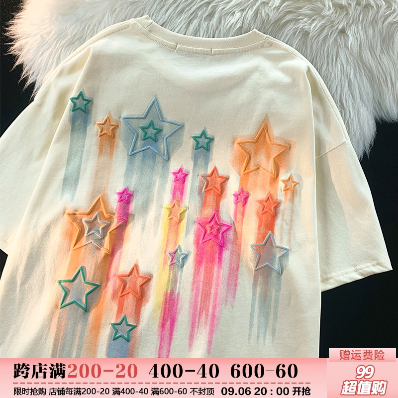 逃離地球塗鴉星星短袖T恤女純棉千禧風夏季寬鬆bf情侶半袖衫潮牌