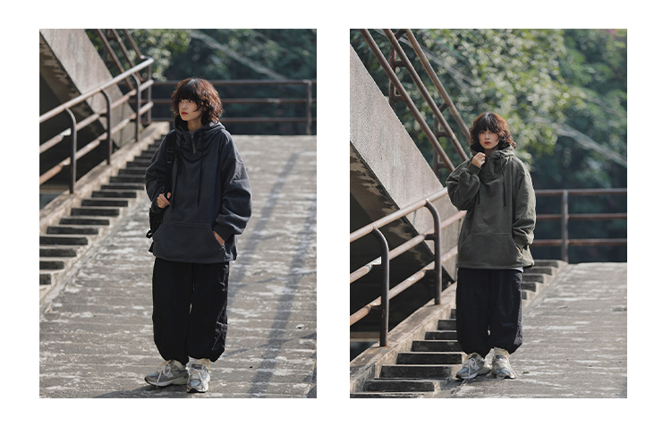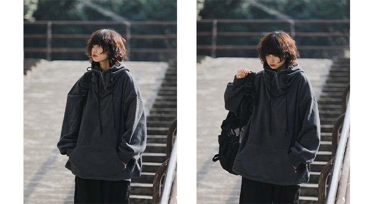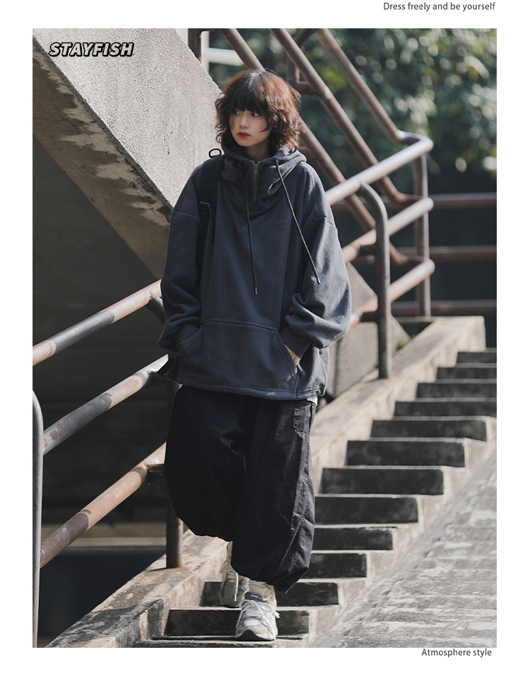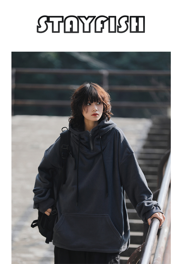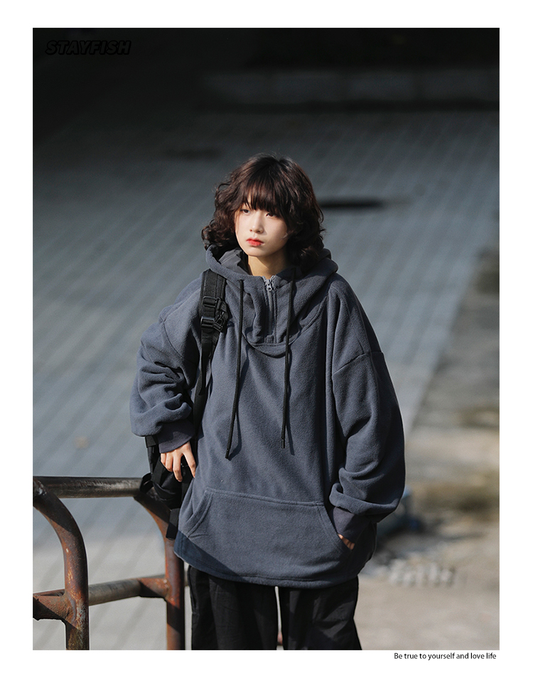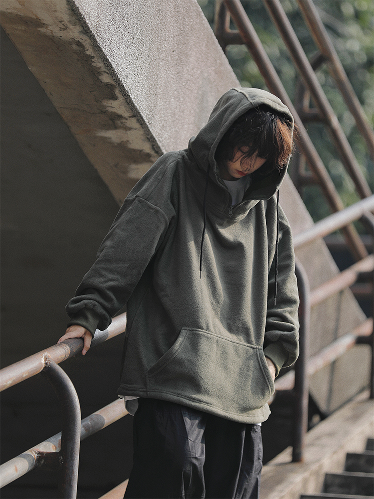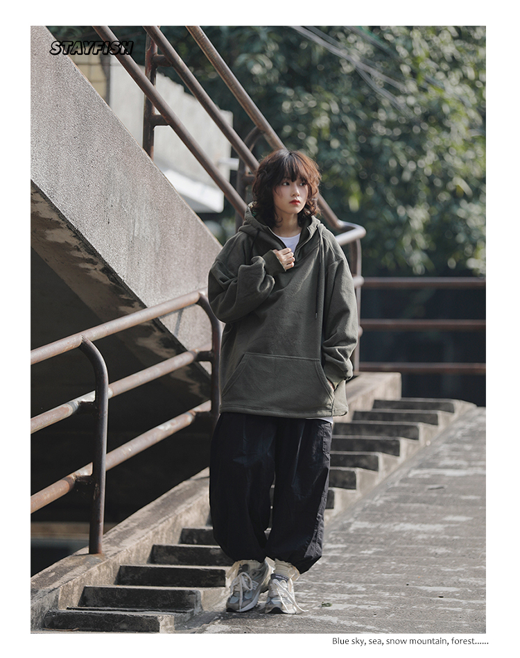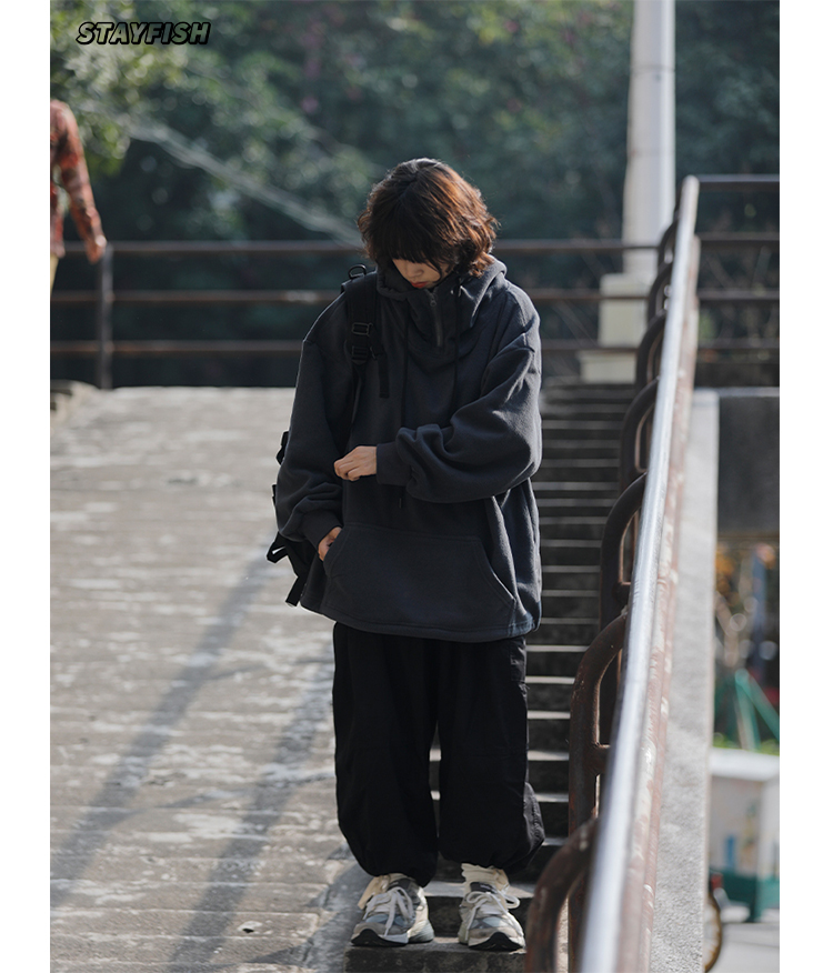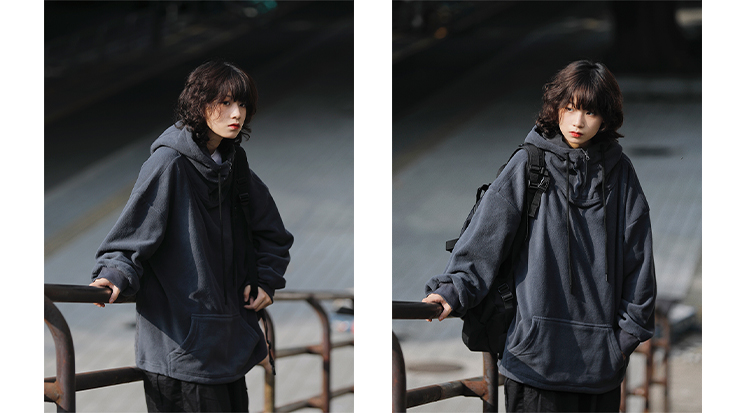 動力星球oversize寬鬆版搖粒絨連帽套頭休閒上衣男女春秋新款日系上衣