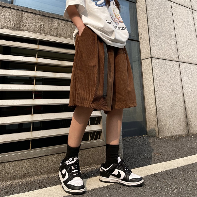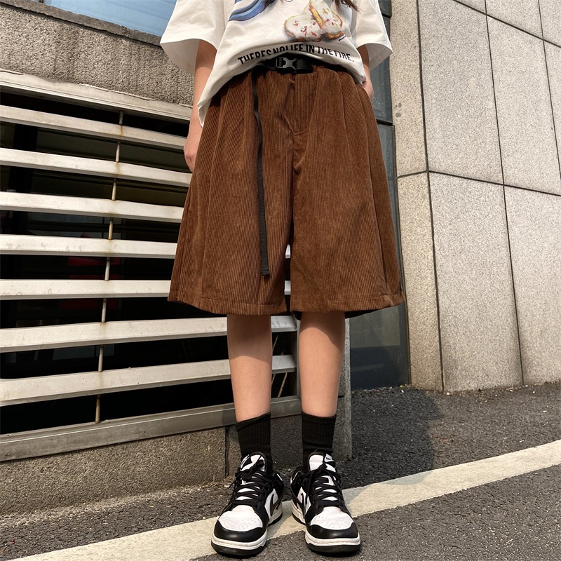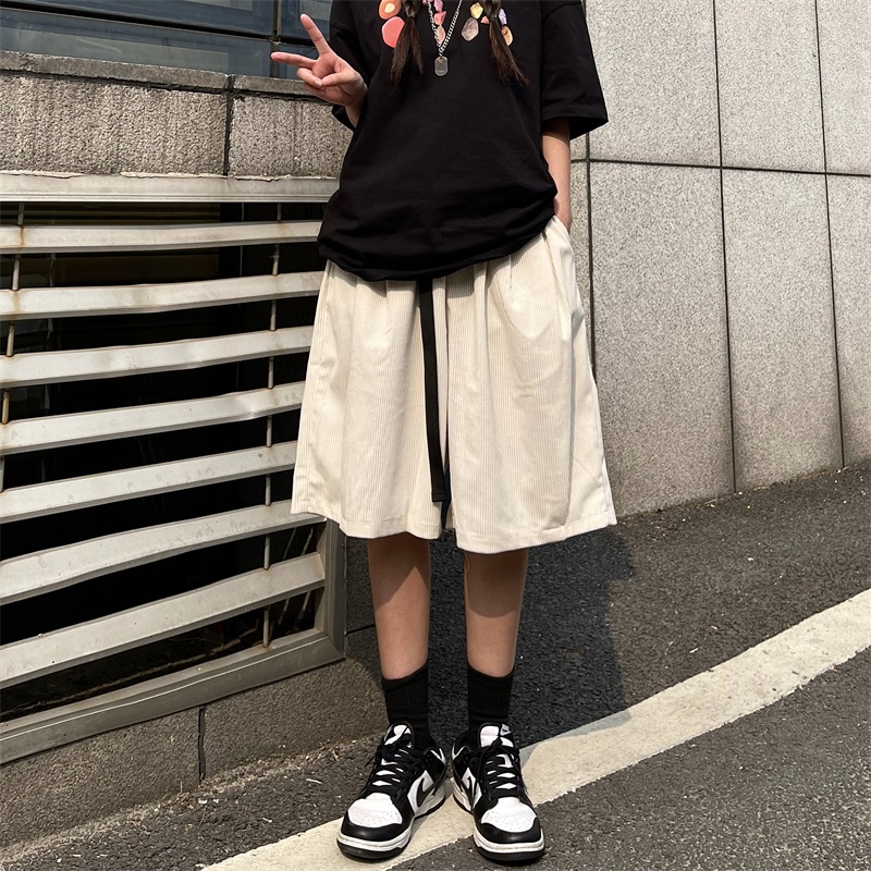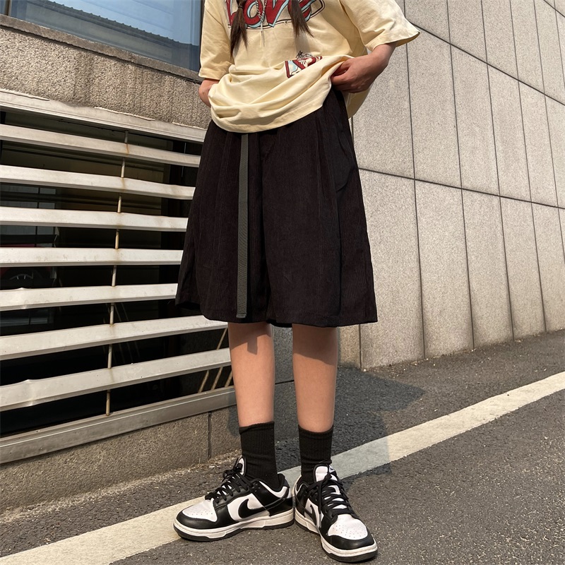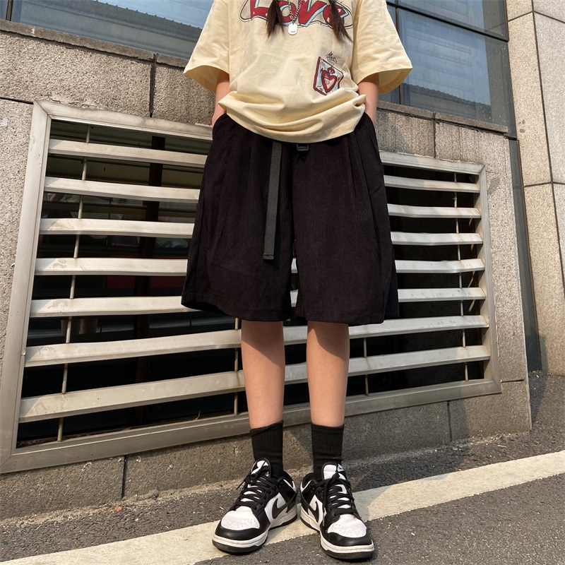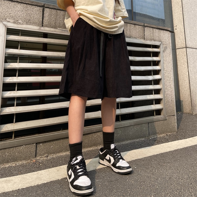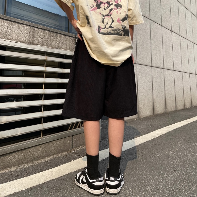 日系街頭短款休閒褲女夏季復古燈芯絨五分褲闊腿寬鬆百搭直筒短褲