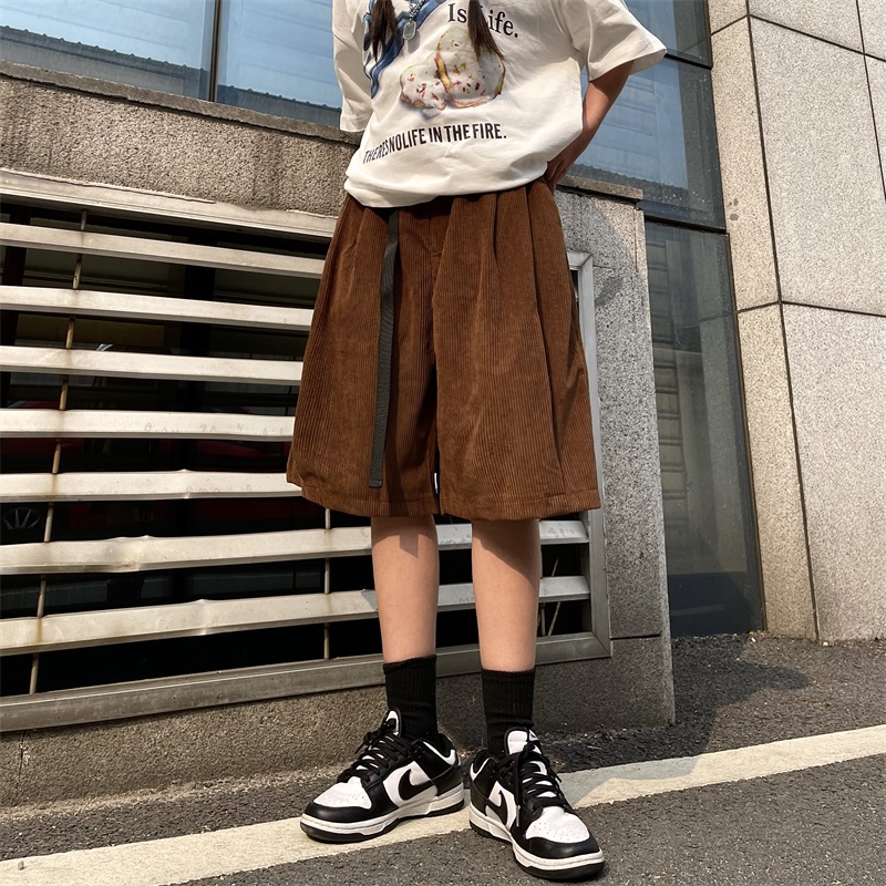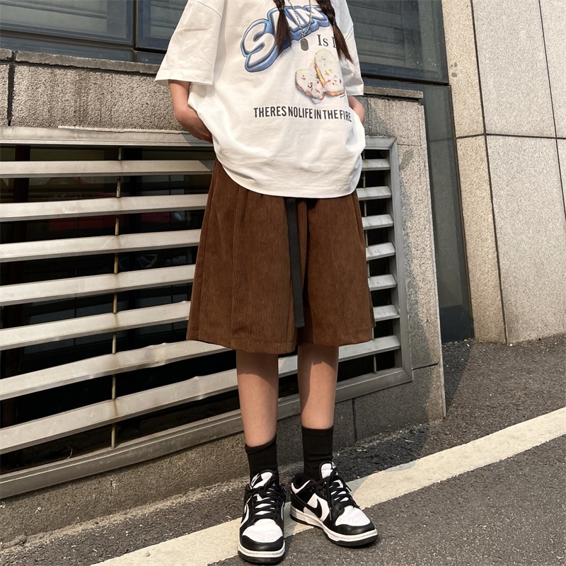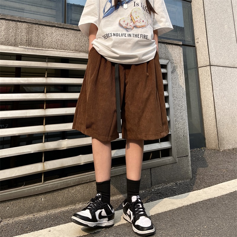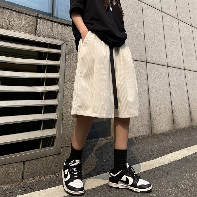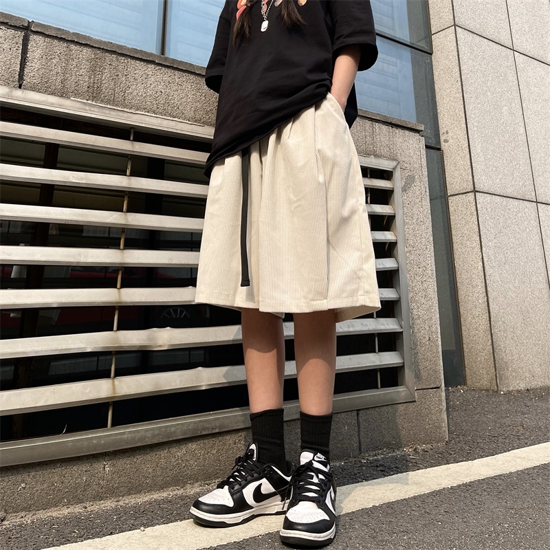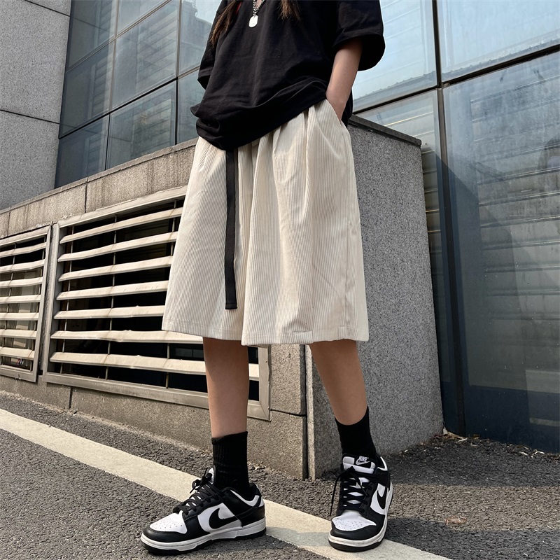 日系街頭短款休閒褲女夏季復古燈芯絨五分褲闊腿寬鬆百搭直筒短褲