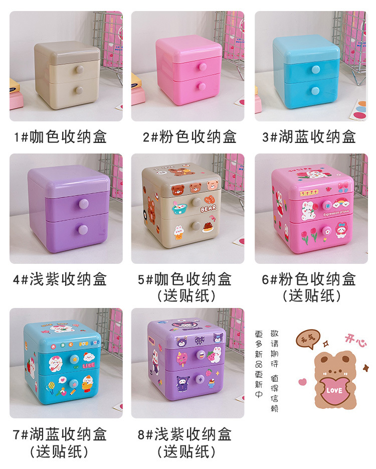 颜色 1#咖色收纳盒(盒装),2#粉色收纳盒(盒装),3#湖蓝收纳盒(盒装),4#浅紫收纳盒(盒装),5#咖色收纳盒(送贴纸),6#粉色收纳盒(送贴纸),7#湖蓝收纳盒(送贴纸),8#浅紫收纳盒(送贴纸)