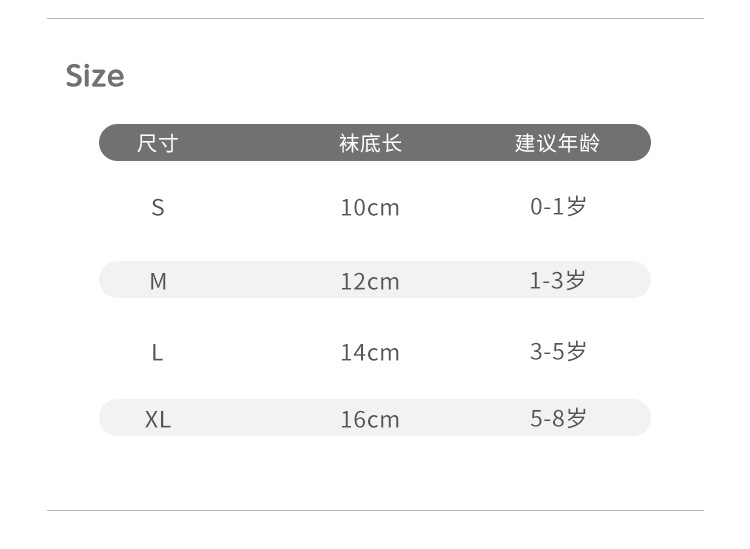 童袜尺码 S 0-1岁,M 1-3岁,L 3-5岁,XL 5-8岁