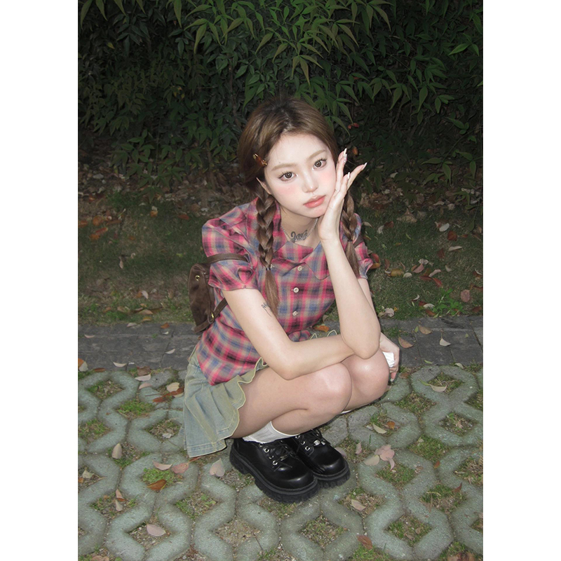 YOZO STUDIO/囍番 法式格子短袖上衣女夏季設計感修身顯瘦襯衫ins