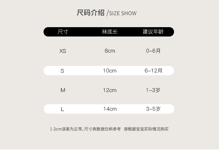 童袜尺码 XS码0-6个月,S码6-12个月,M码1-3岁,L码3-5岁