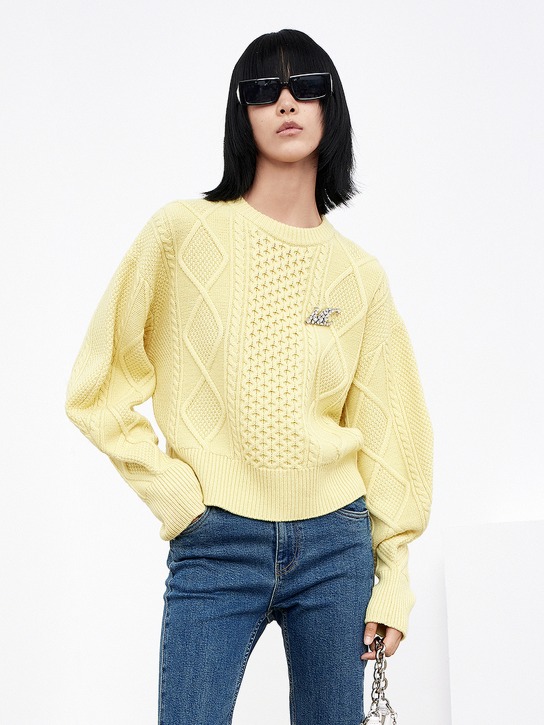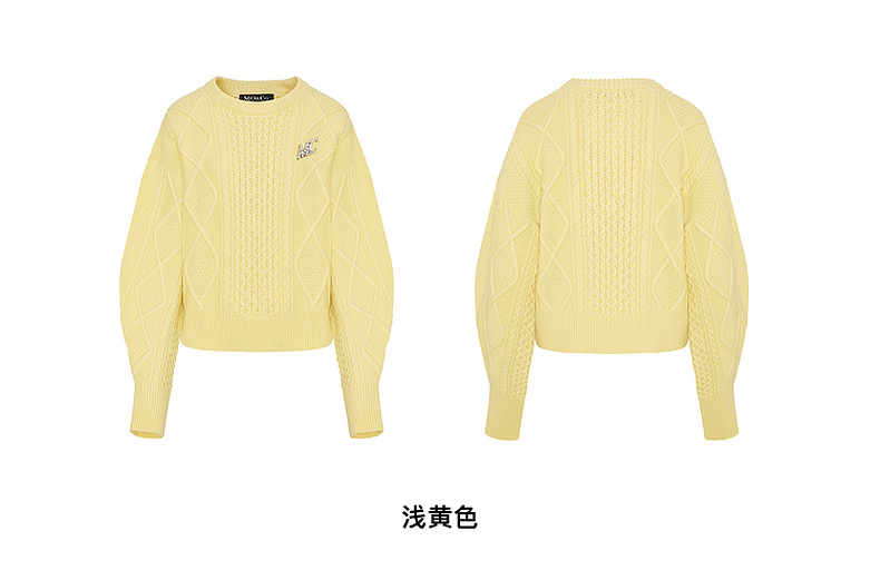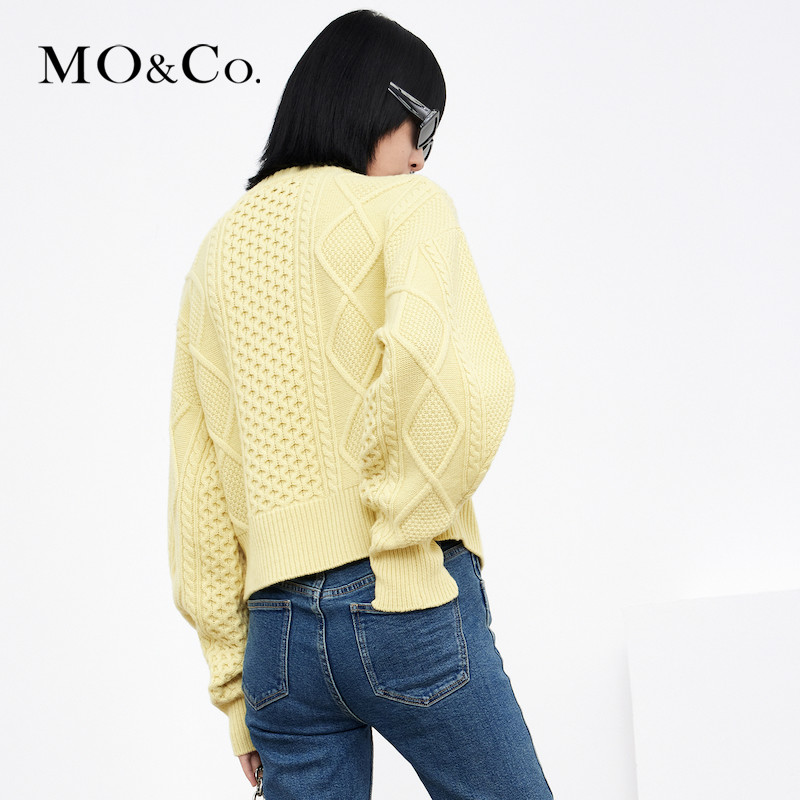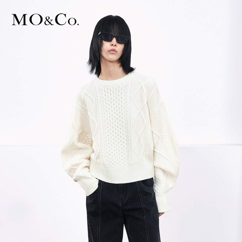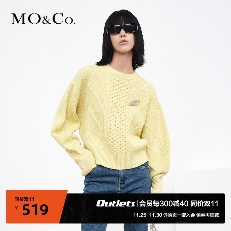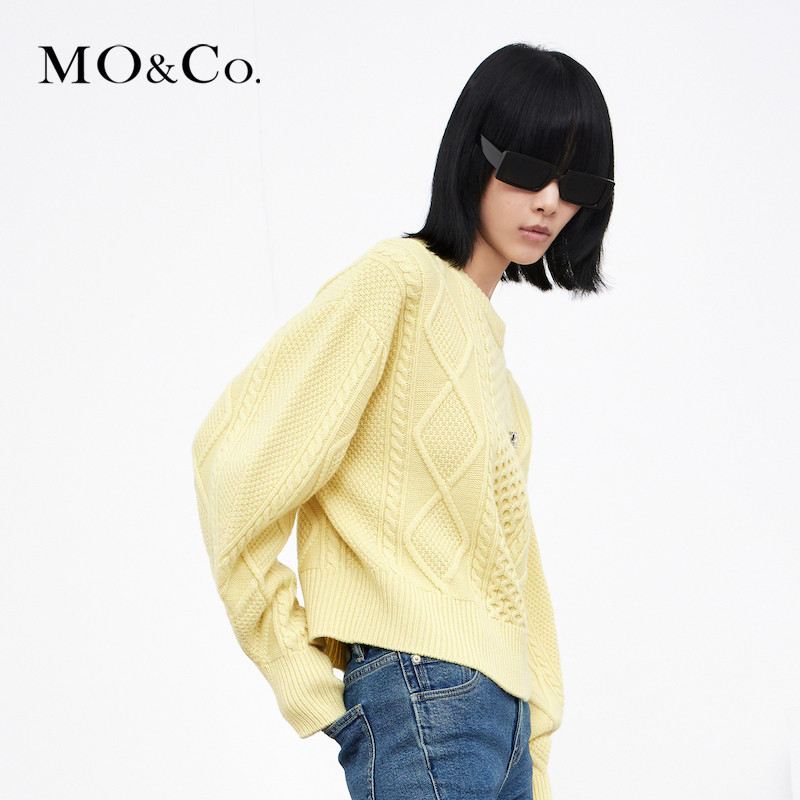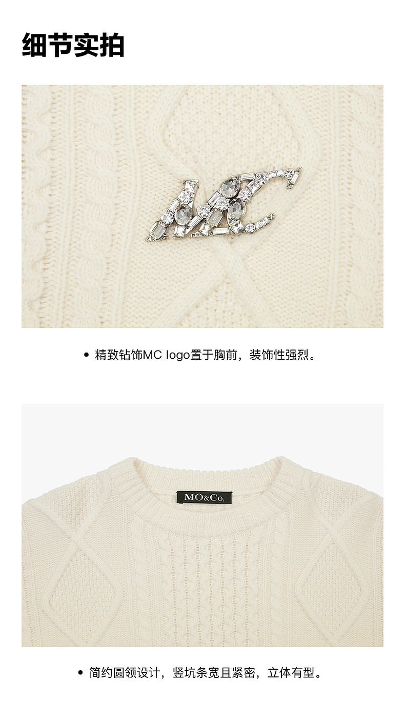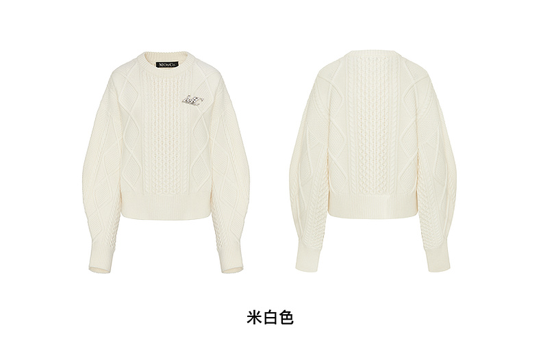 【MOCO獨享售罄下架】鑽飾logo復古絞花套頭短款羊毛針織衫美麗諾