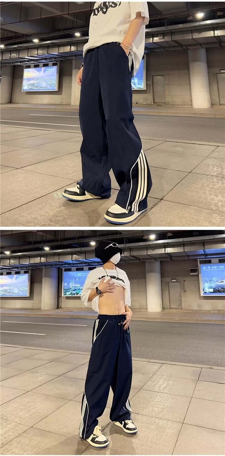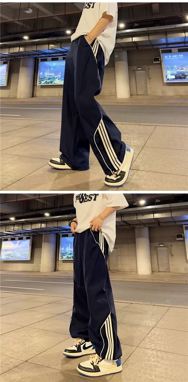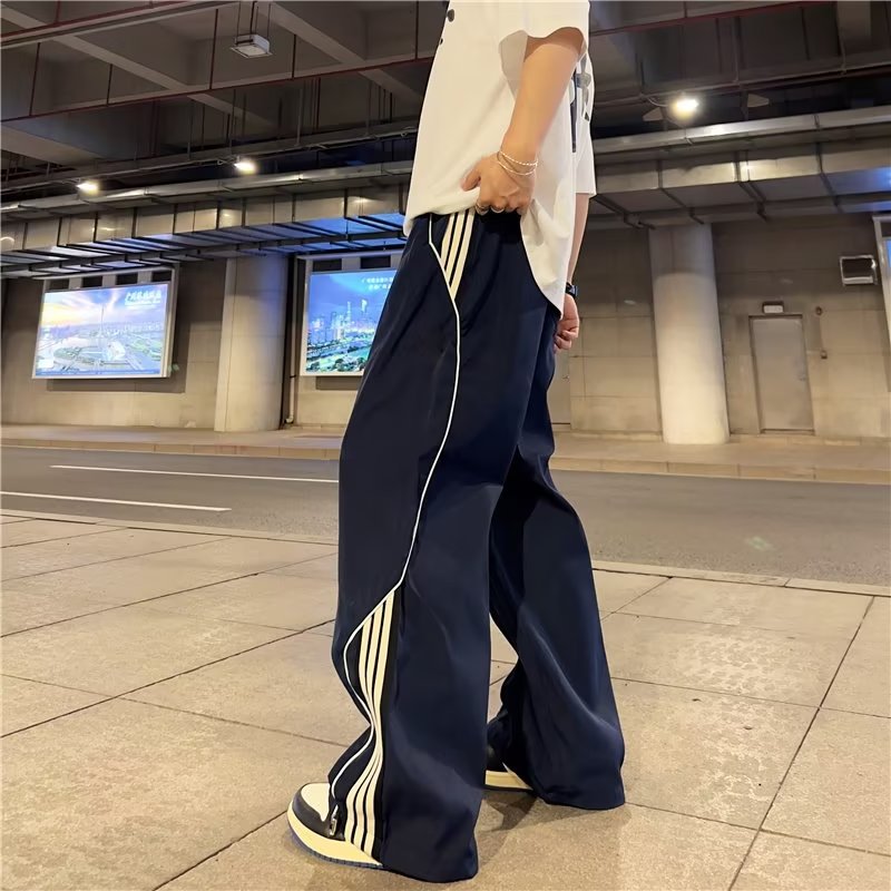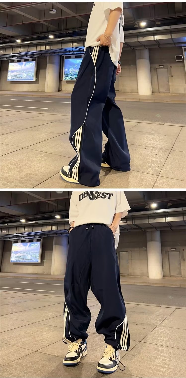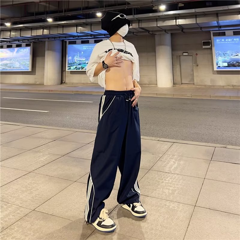 速乾巴黎神褲男設計感條紋藏青色校服褲子夏季潮牌束腳降落傘兵褲