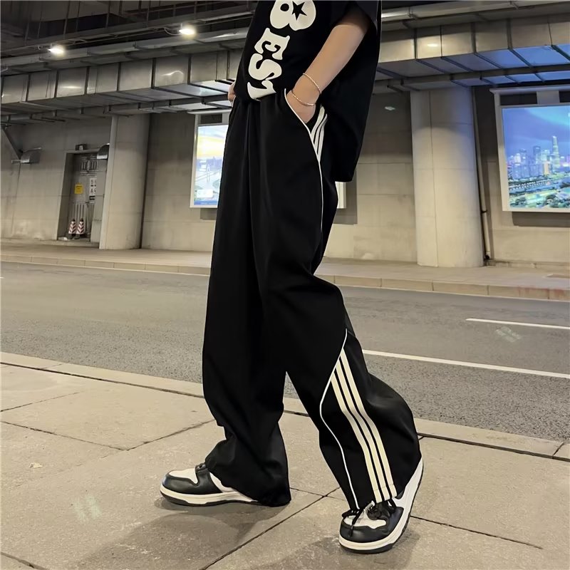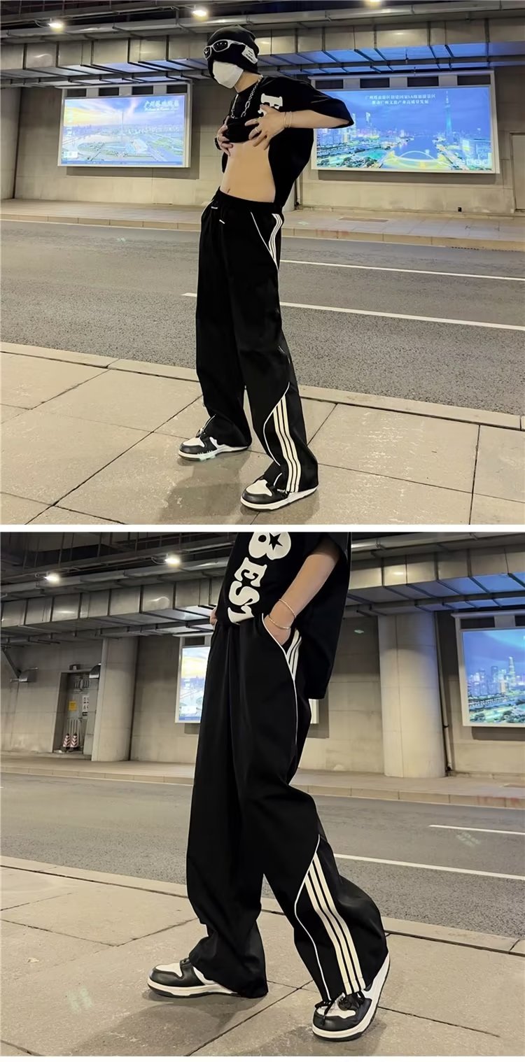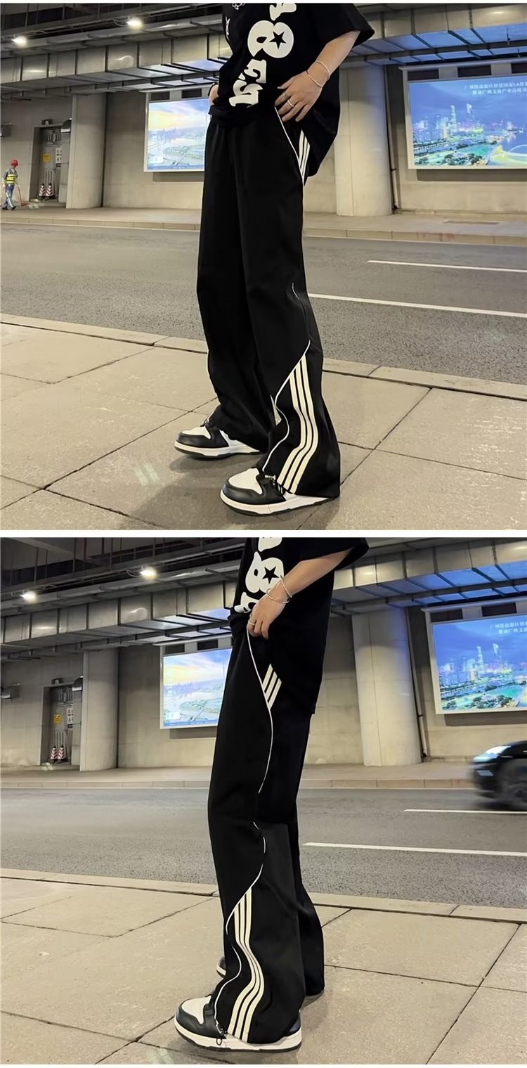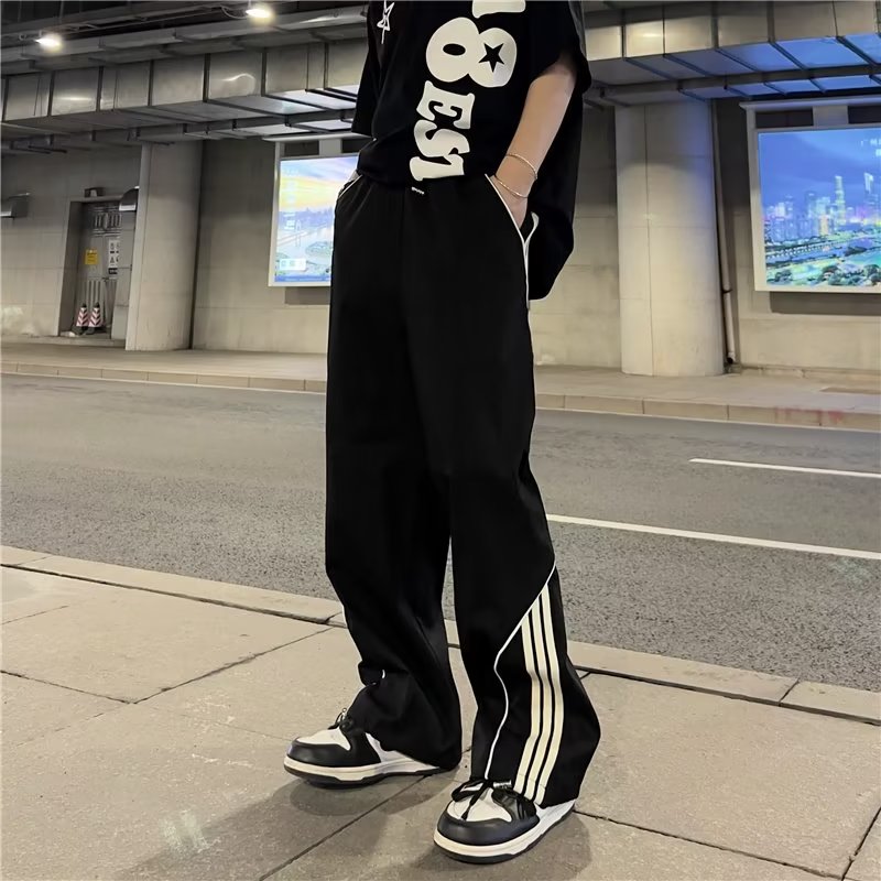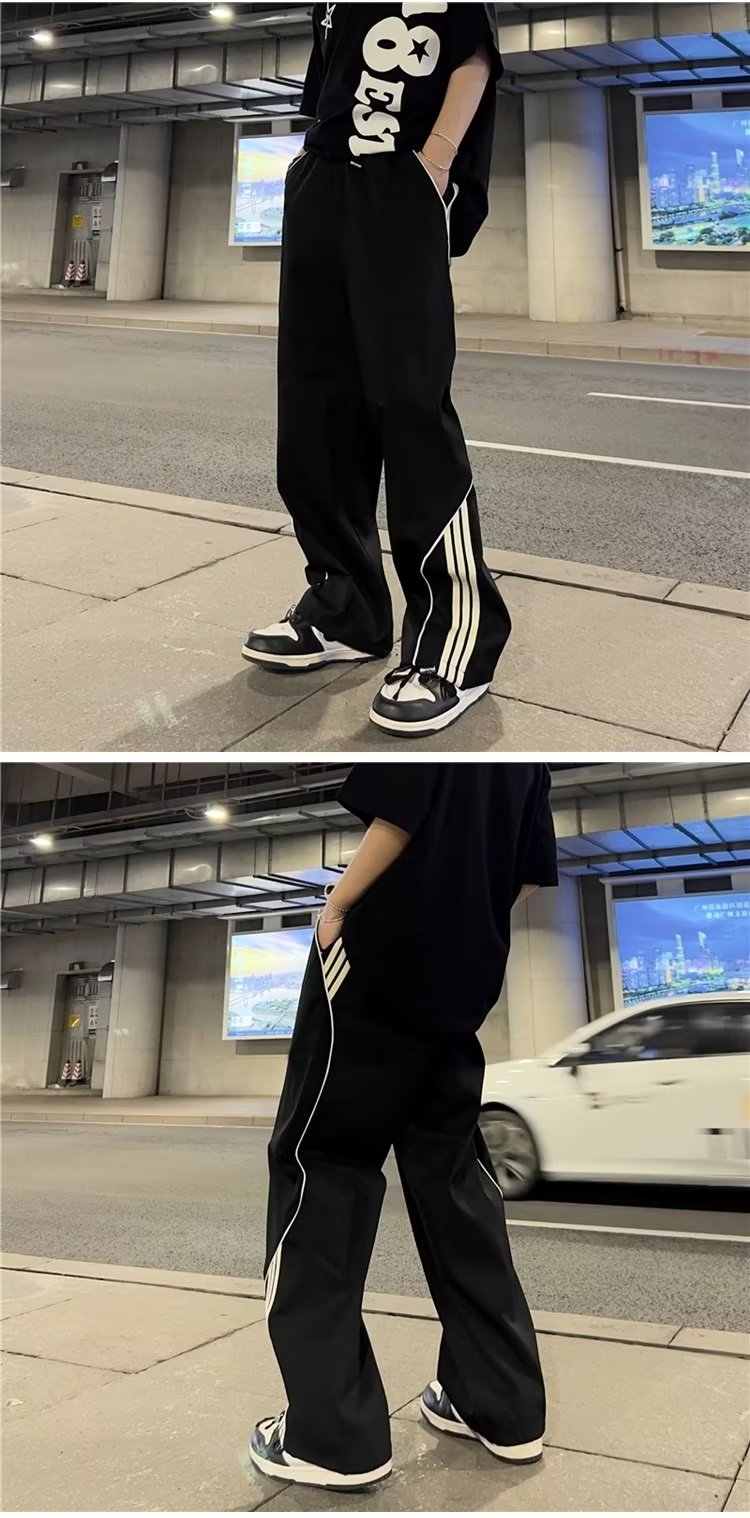 速乾巴黎神褲男設計感條紋藏青色校服褲子夏季潮牌束腳降落傘兵褲