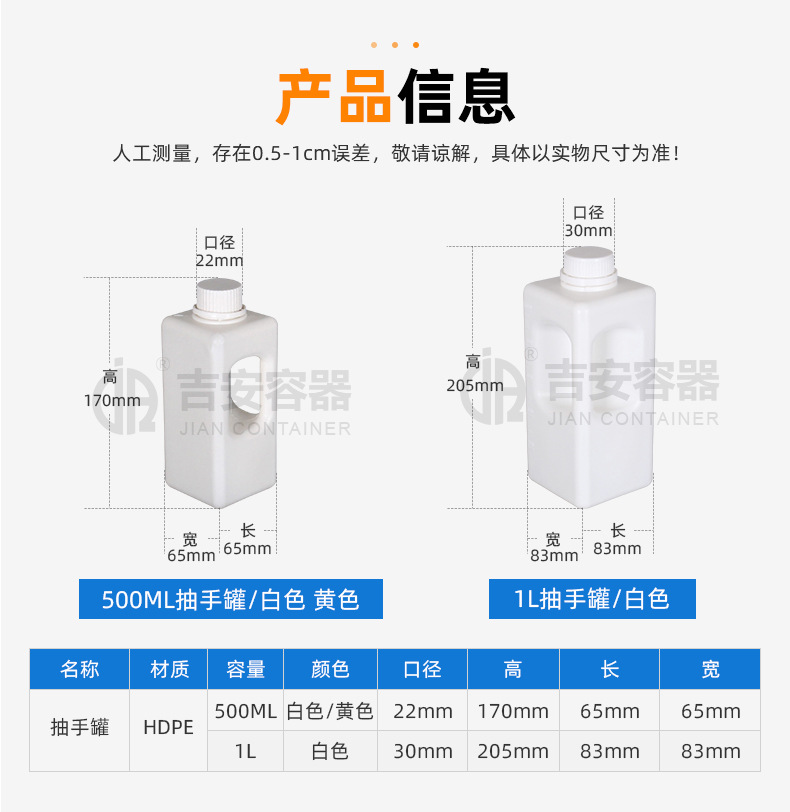 规格 500ML抽手罐 白色,500ML抽手罐 黄色,1L抽手罐 白色