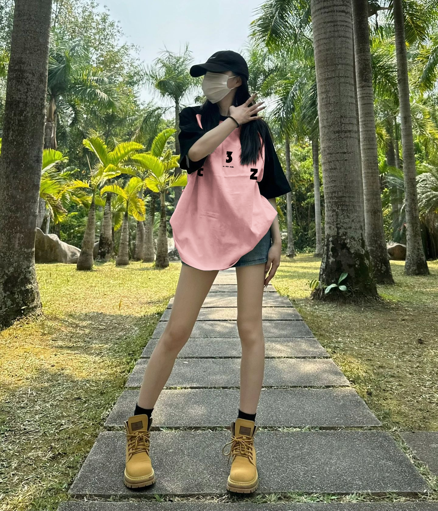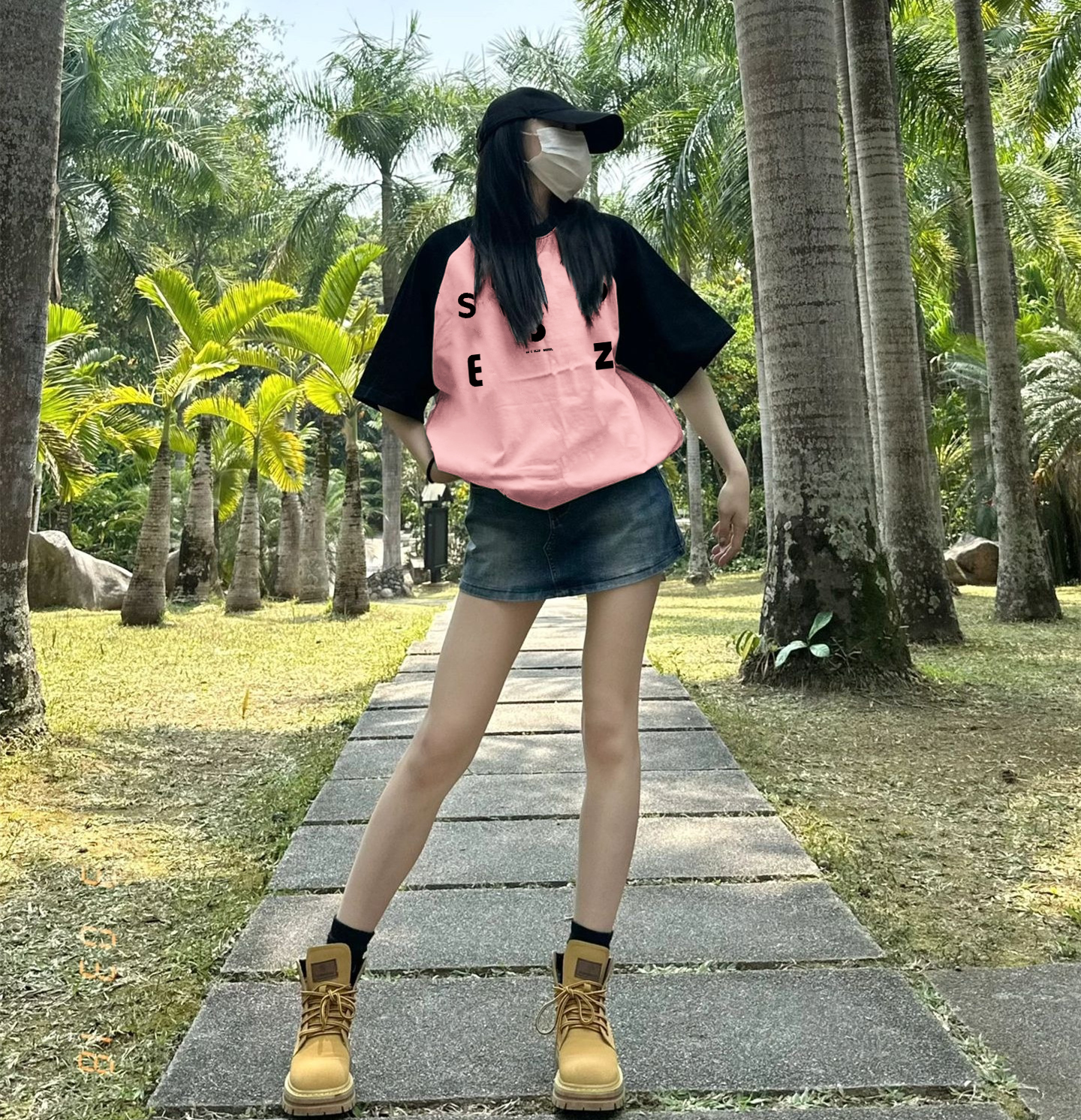 美式復古黑粉插肩短袖T恤夏日多巴胺穿搭oversize小眾不撞款上衣