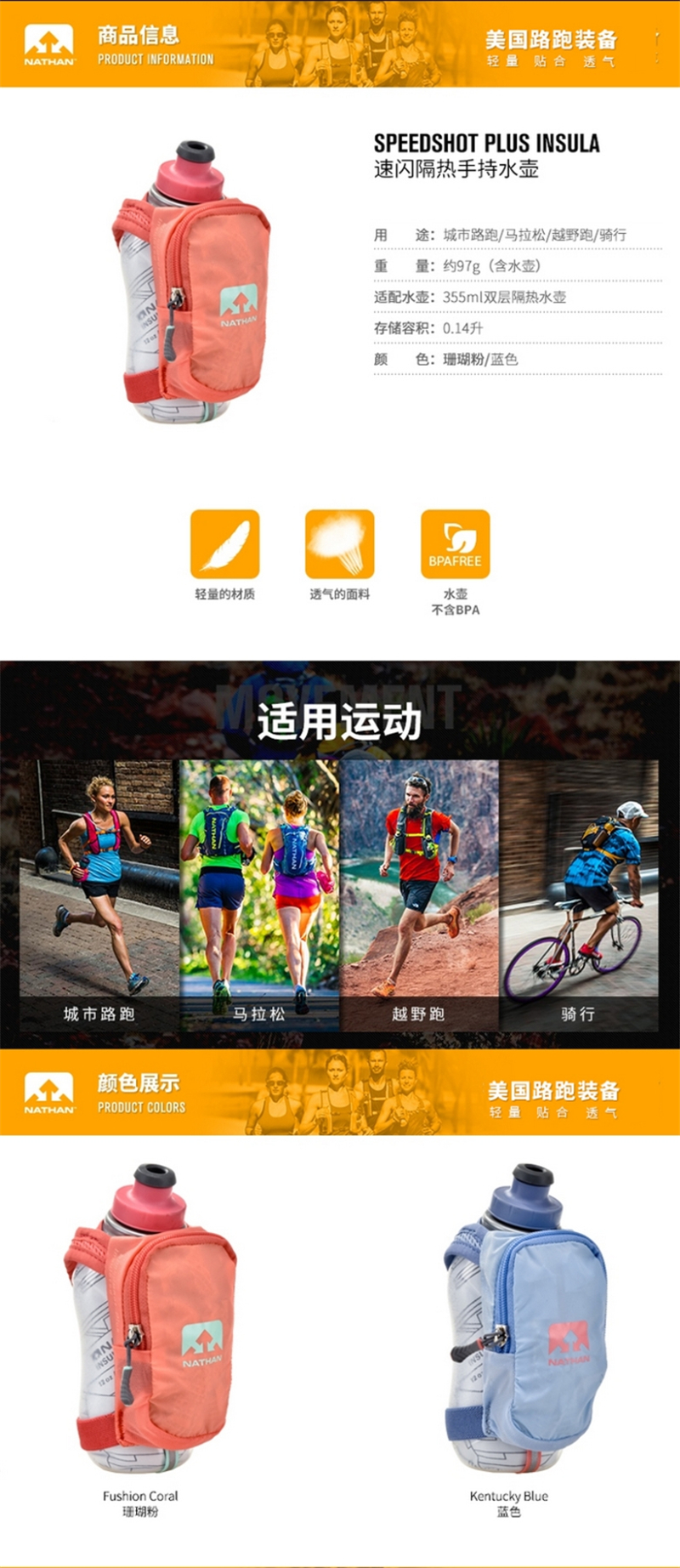5折美國NATHAN戶外運動男女越野跑步手持水壺包快飲水瓶包手機包