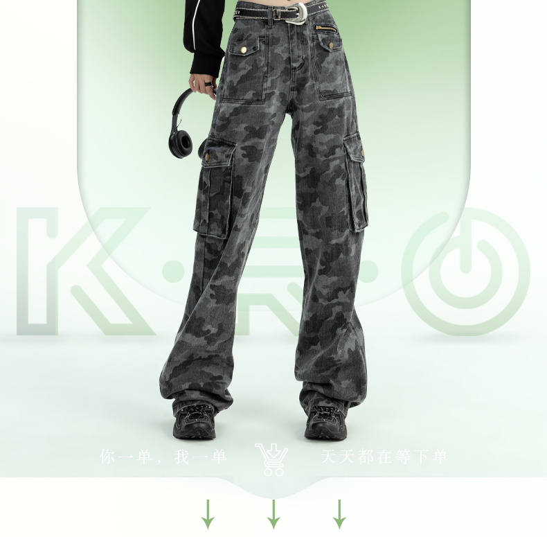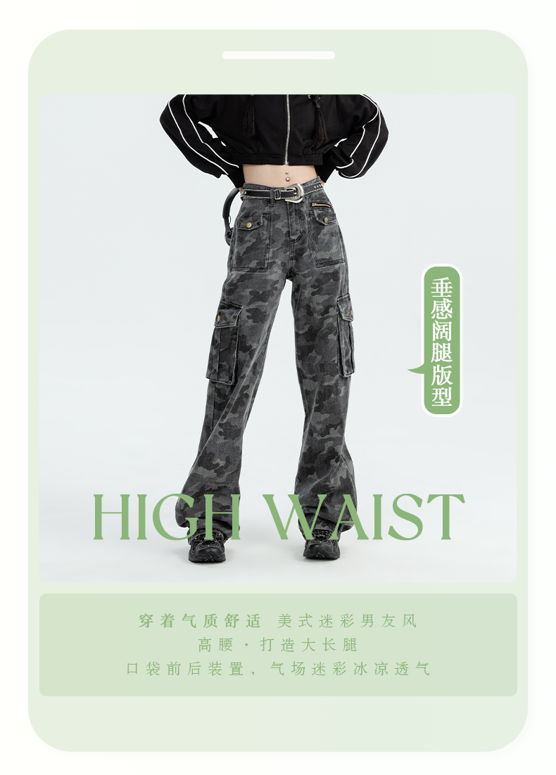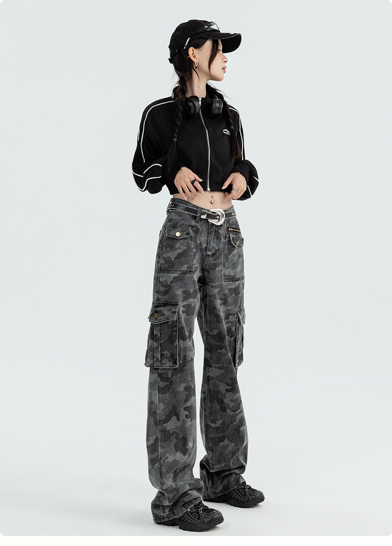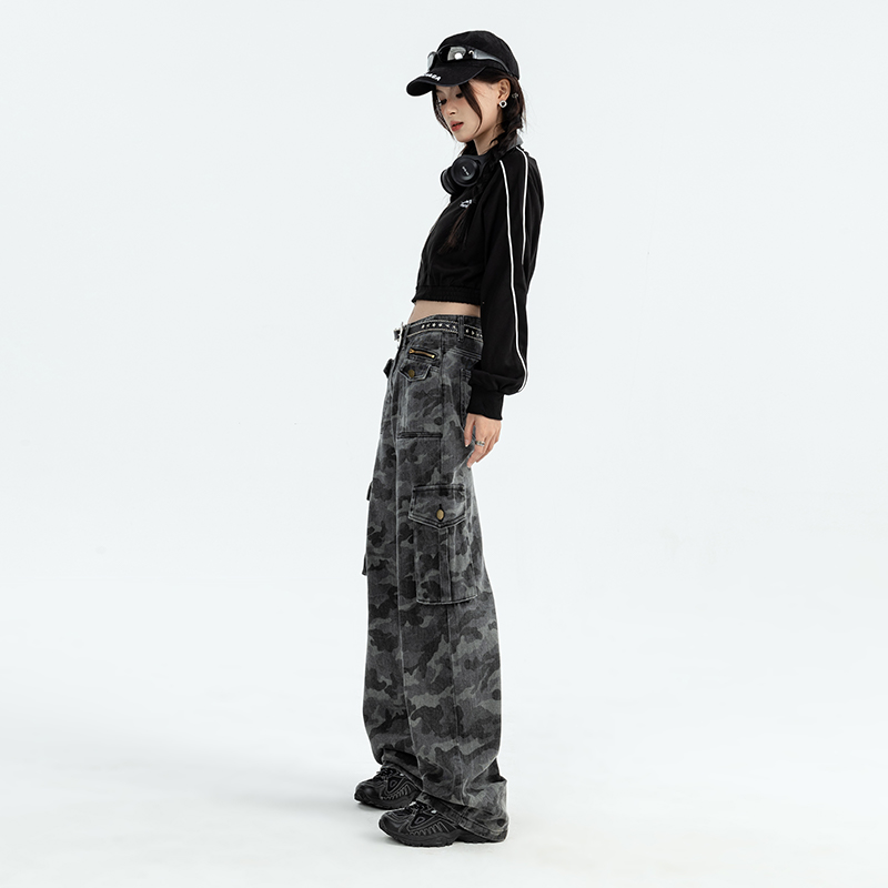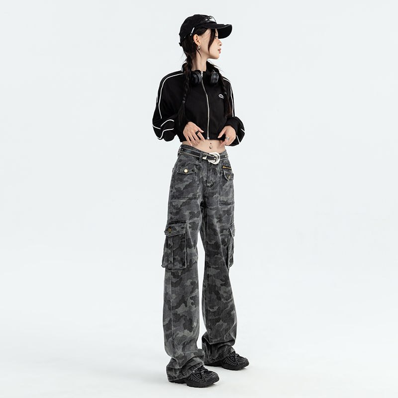 KRO美式迷彩工裝褲女2023新款機能風寬鬆辣妹多口袋高腰闊腿長褲