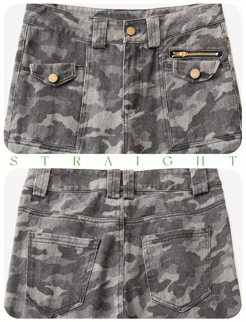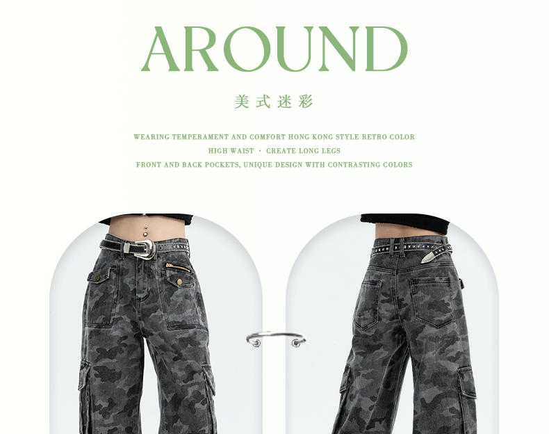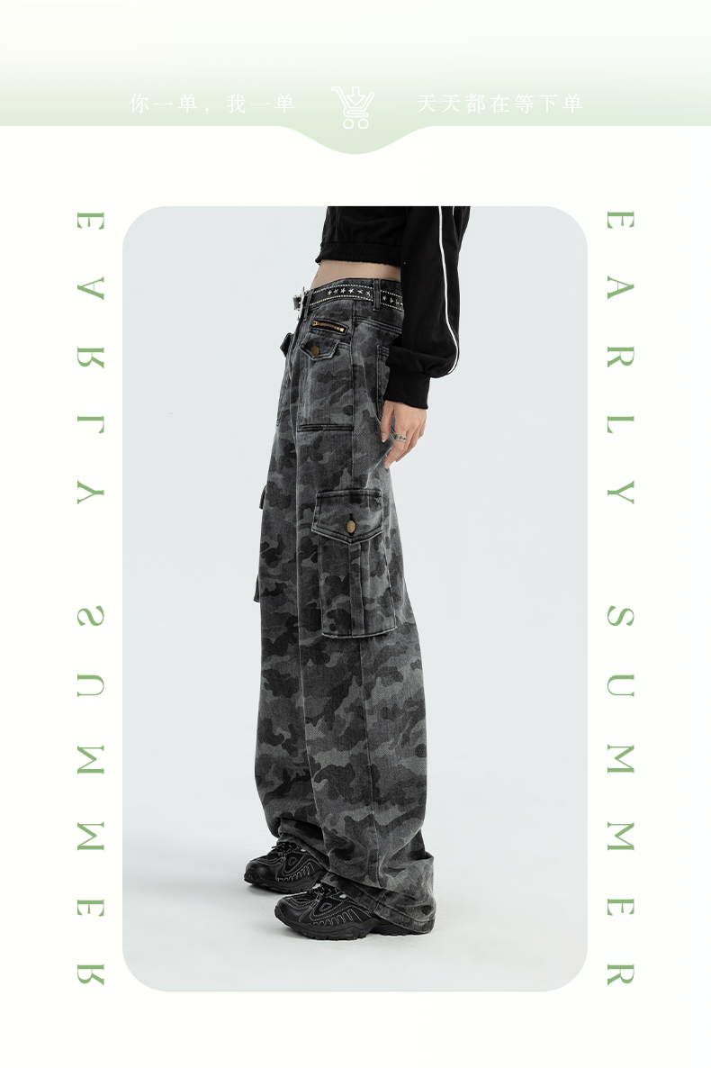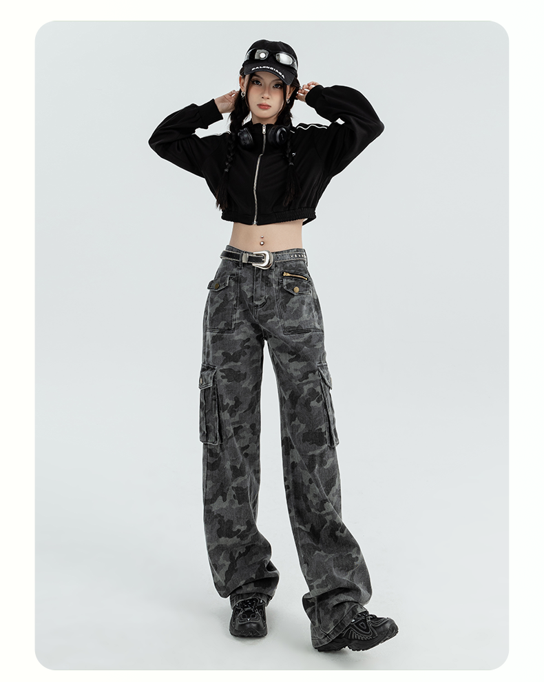 KRO美式迷彩工裝褲女2023新款機能風寬鬆辣妹多口袋高腰闊腿長褲