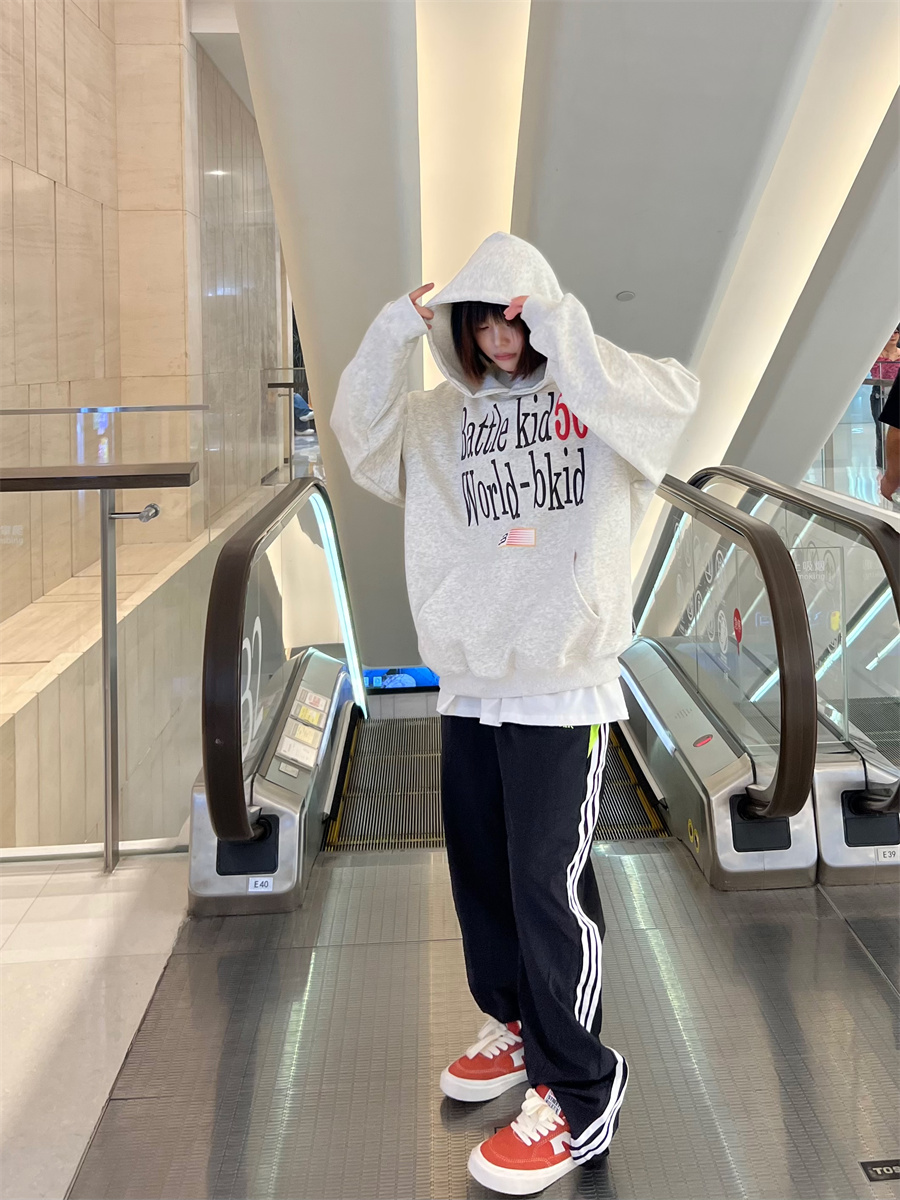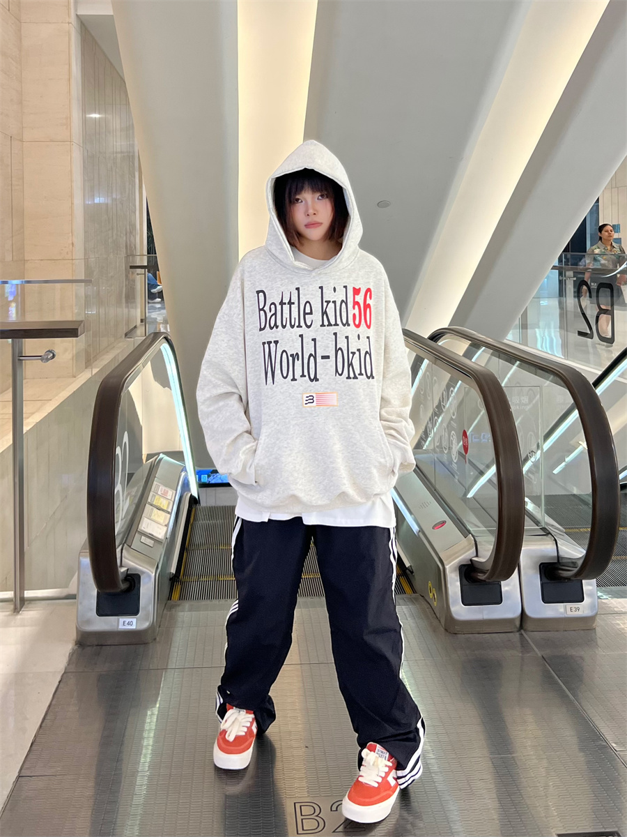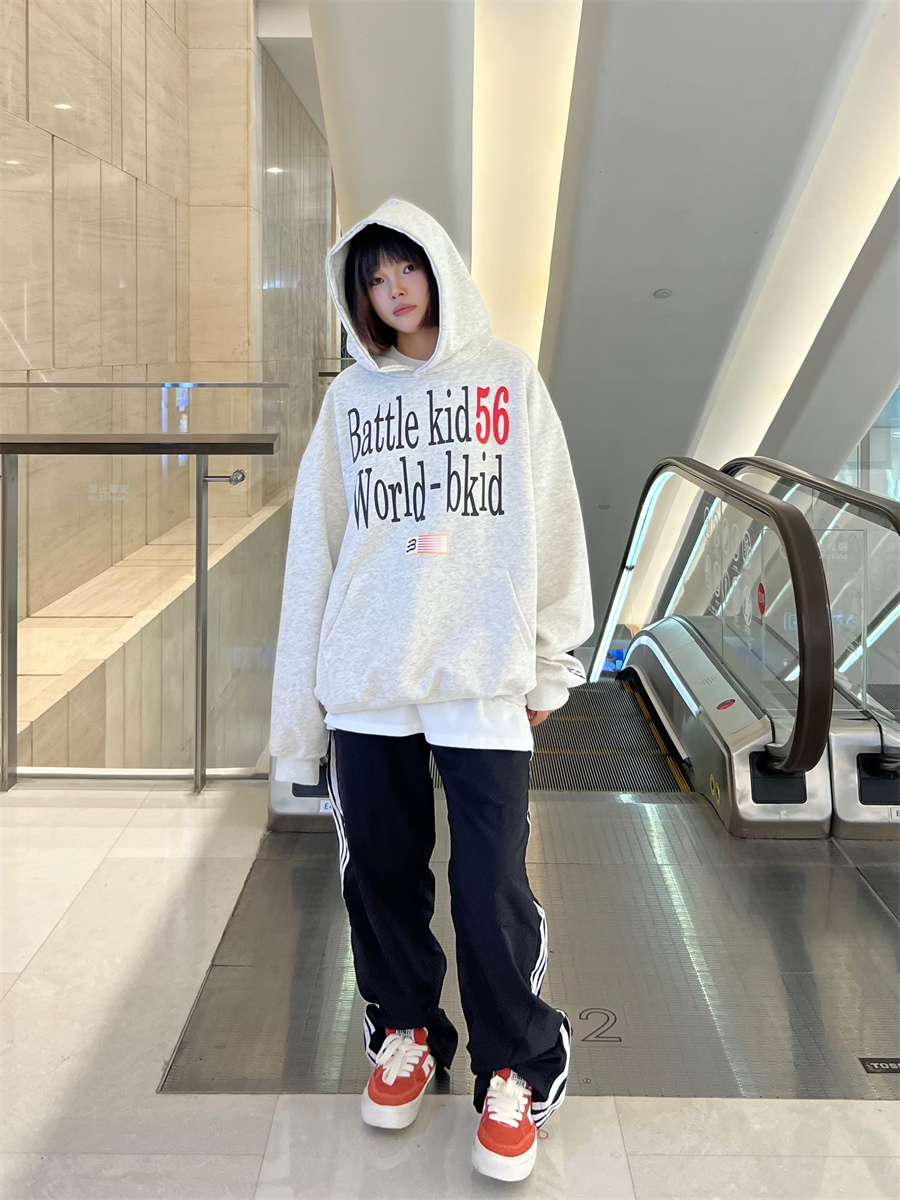 JU403 美式復古字母印花連帽運動衫春秋寬鬆休閒套頭百搭帽衫男女潮