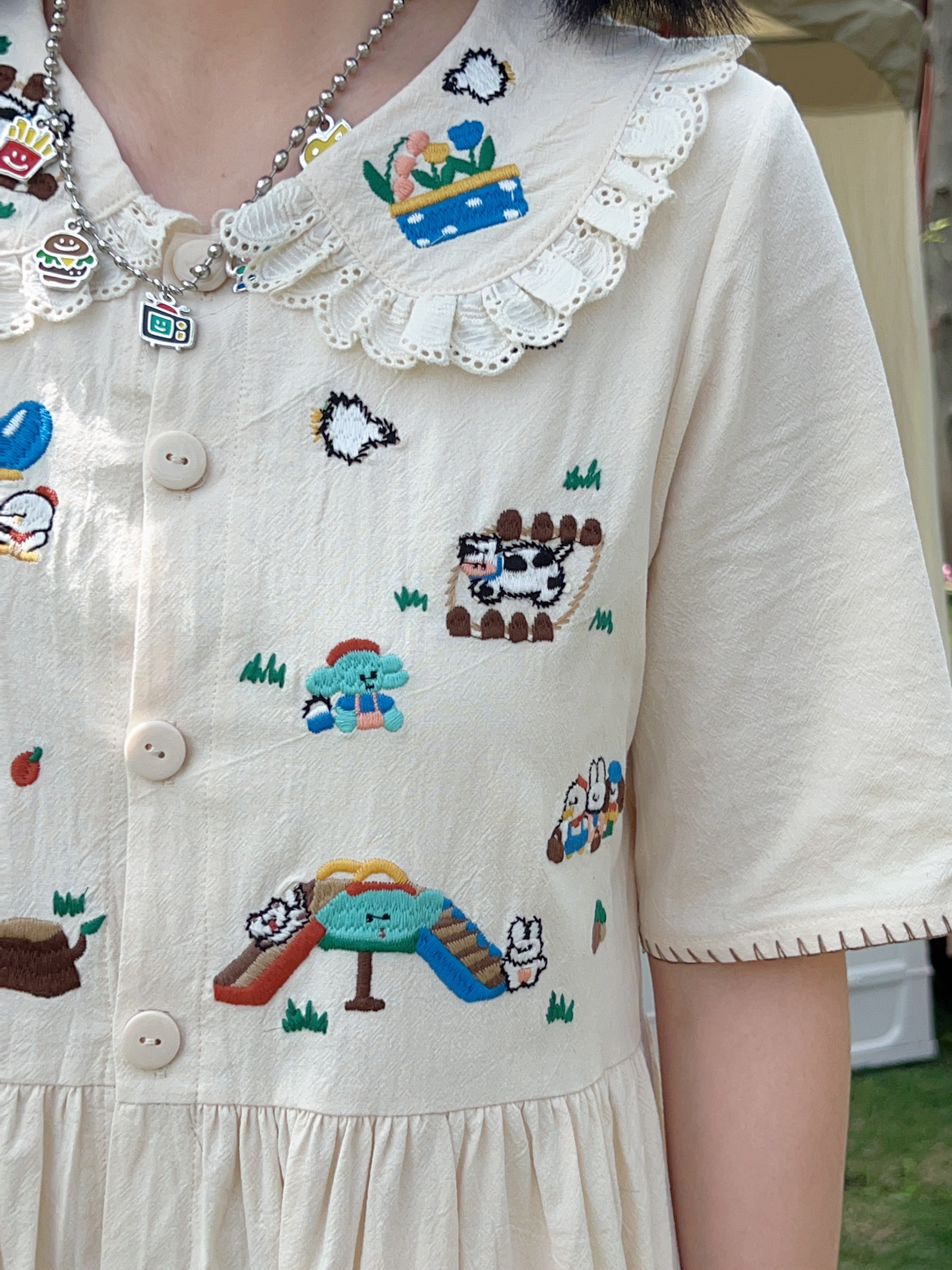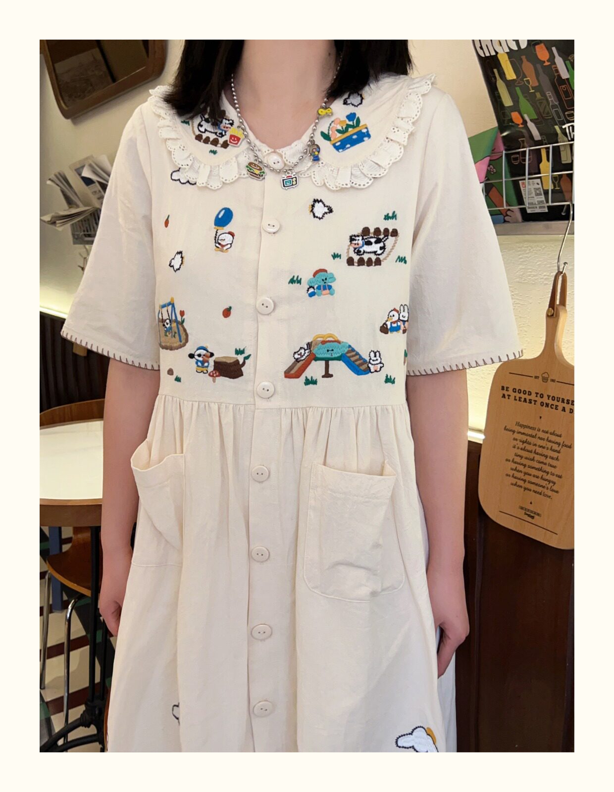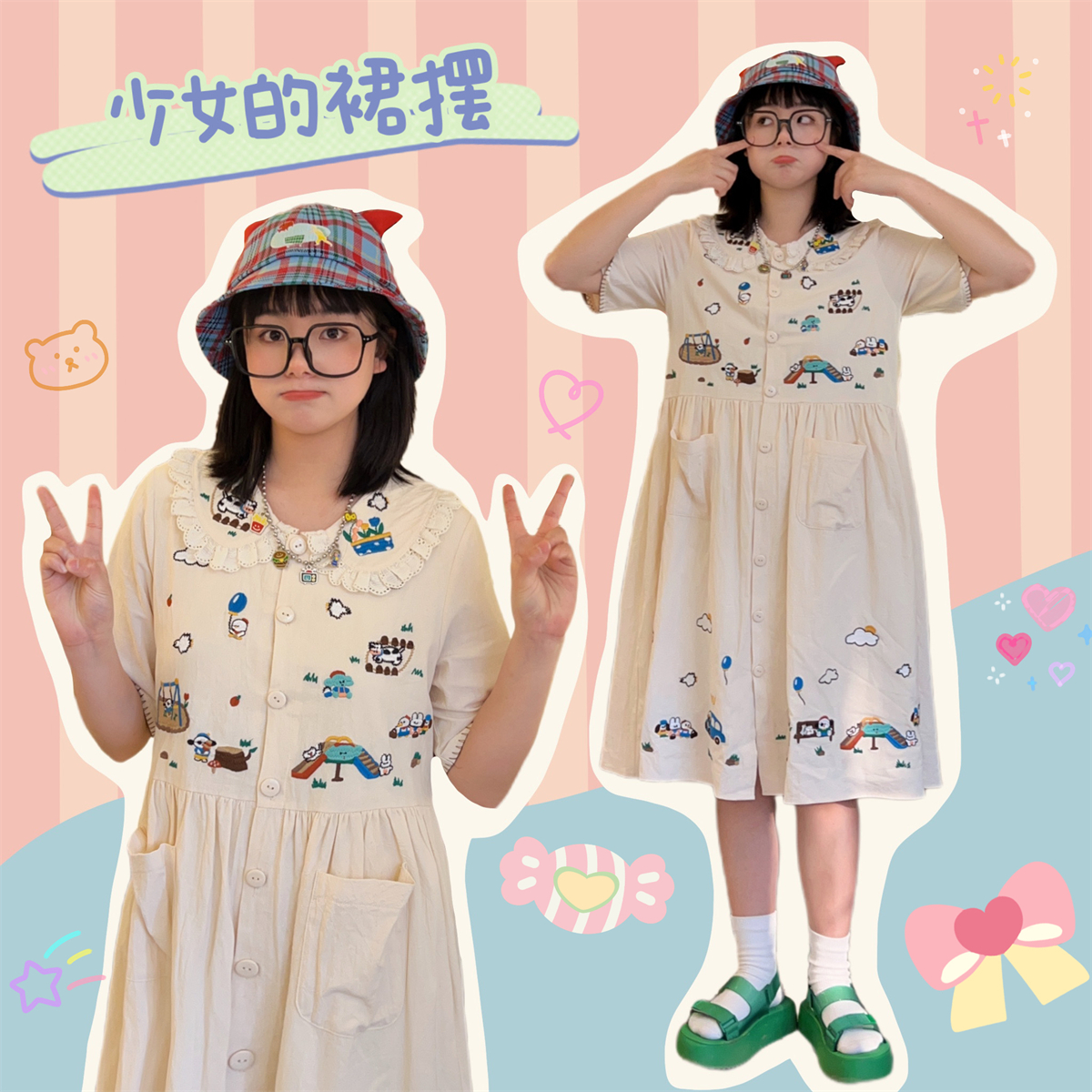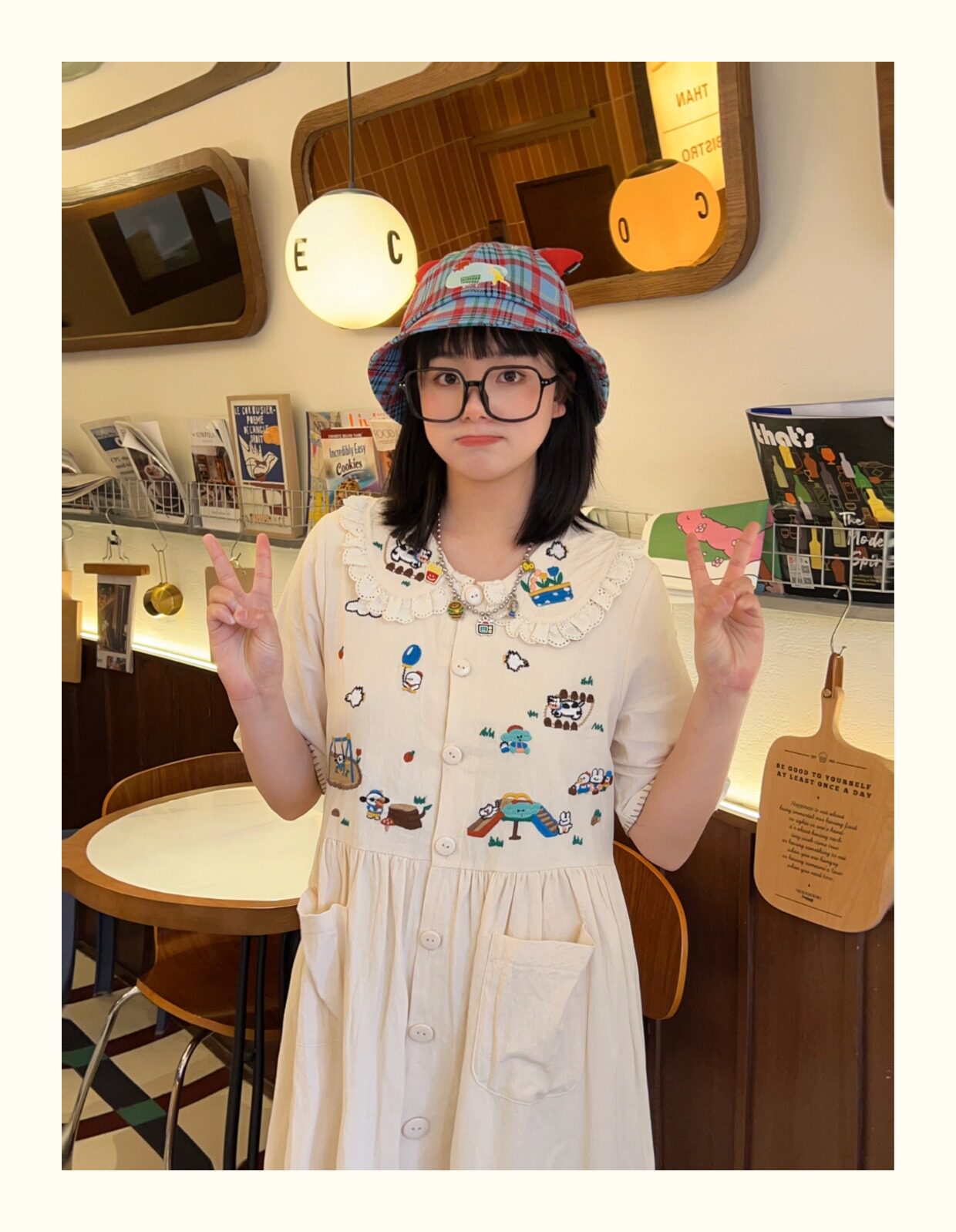 童趣古著卡通手工小刺繡日系乖巧娃娃領棉麻透氣顯瘦短袖洋裝夏