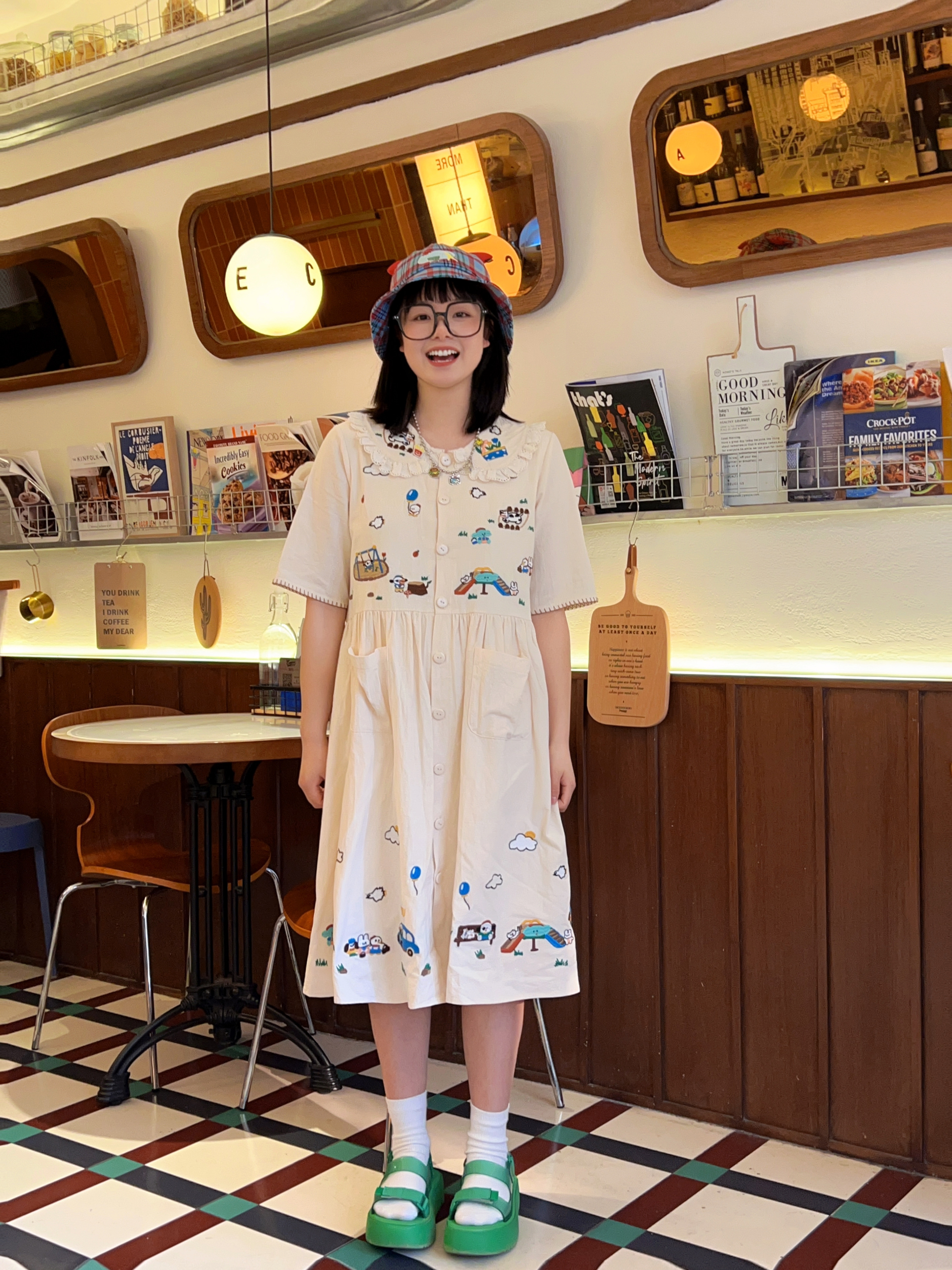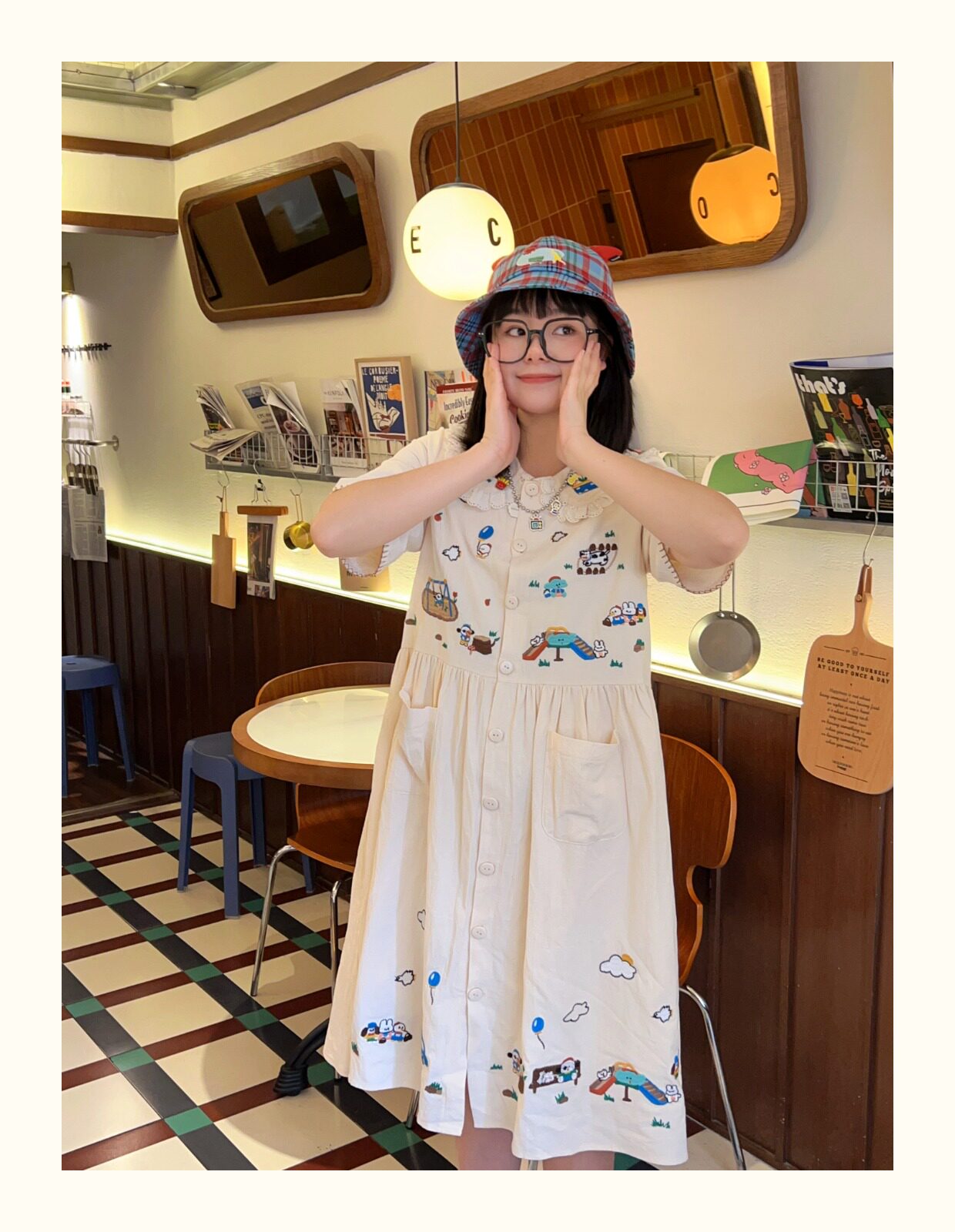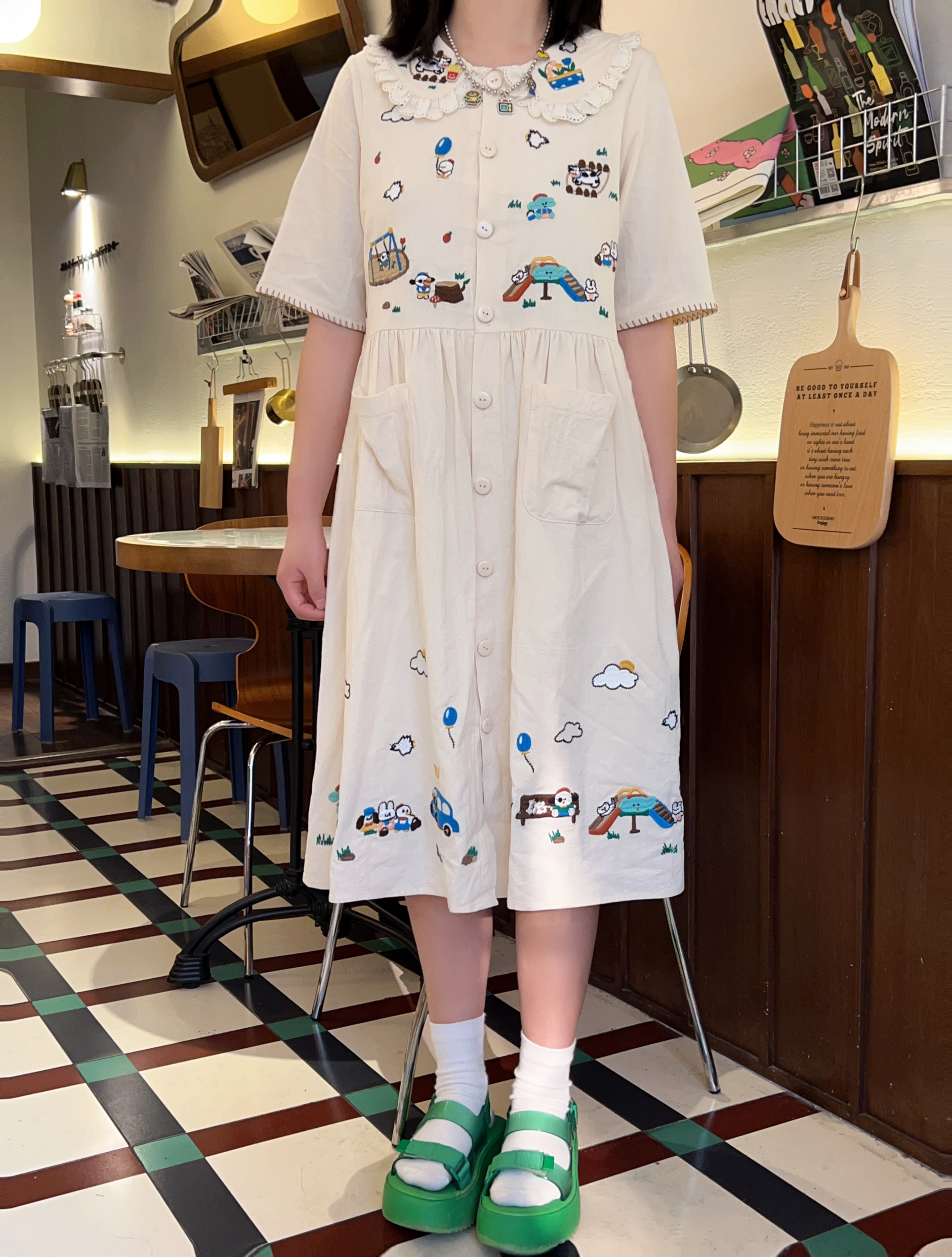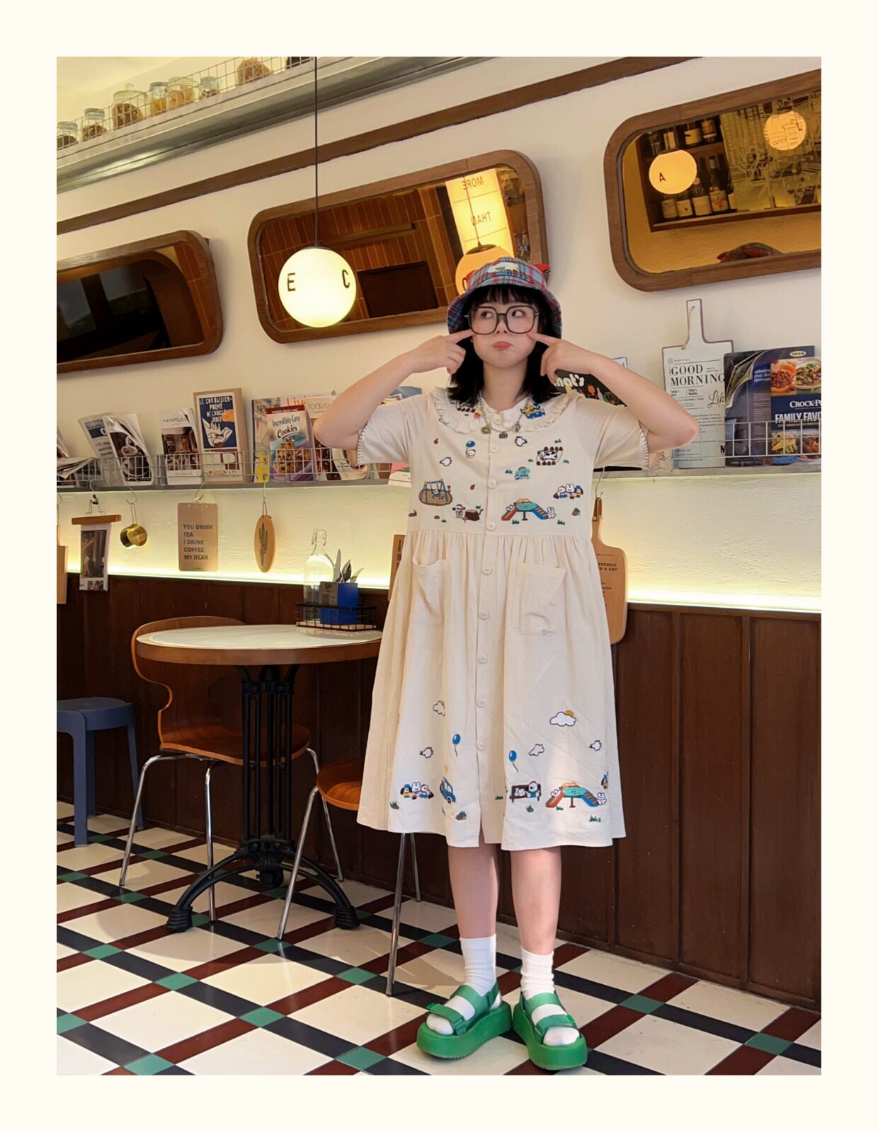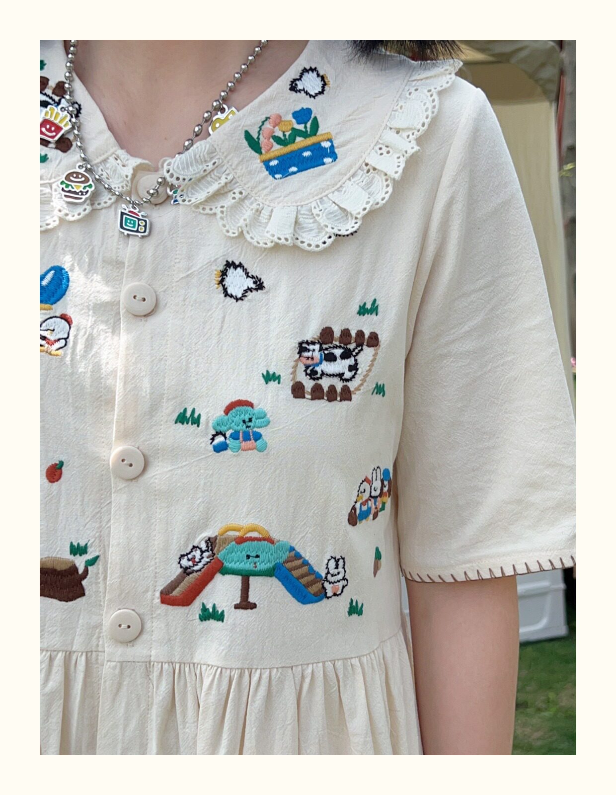 童趣古著卡通手工小刺繡日系乖巧娃娃領棉麻透氣顯瘦短袖洋裝夏