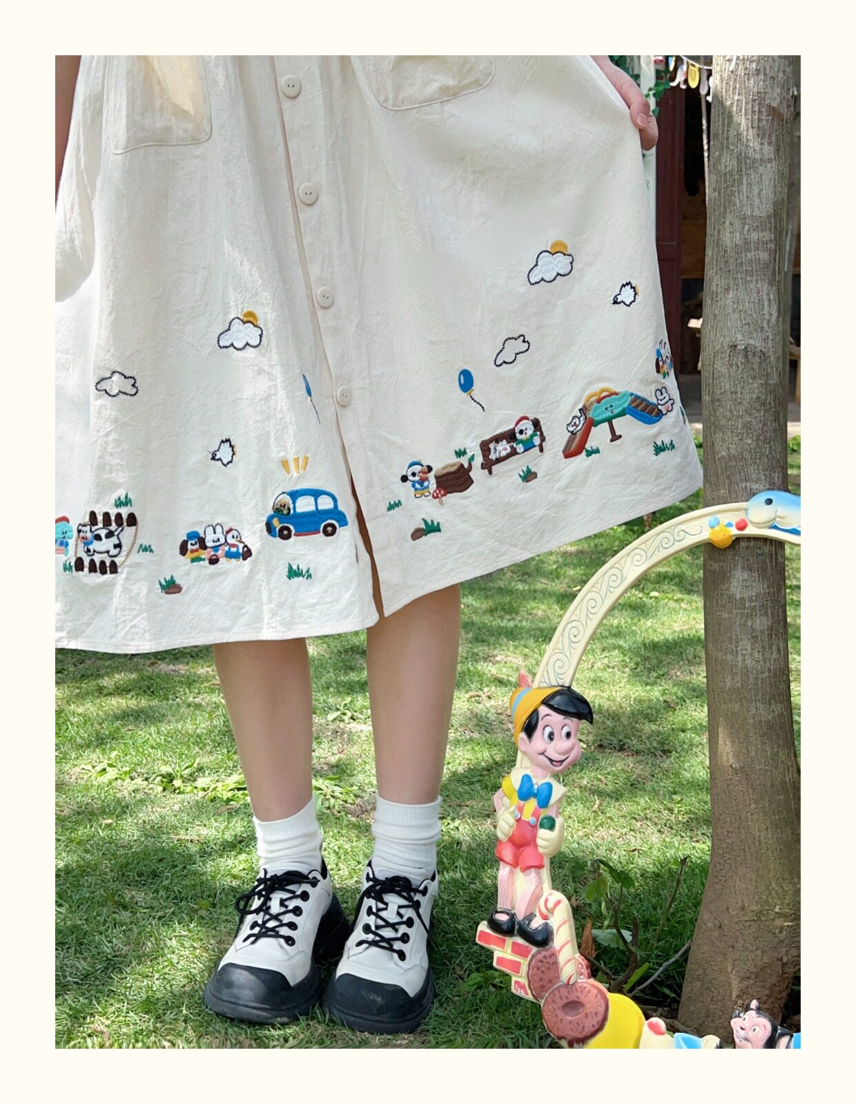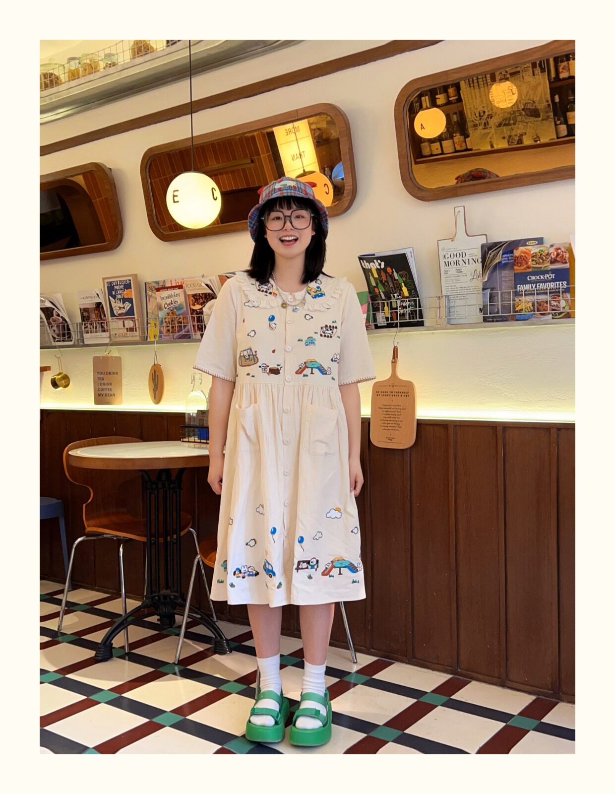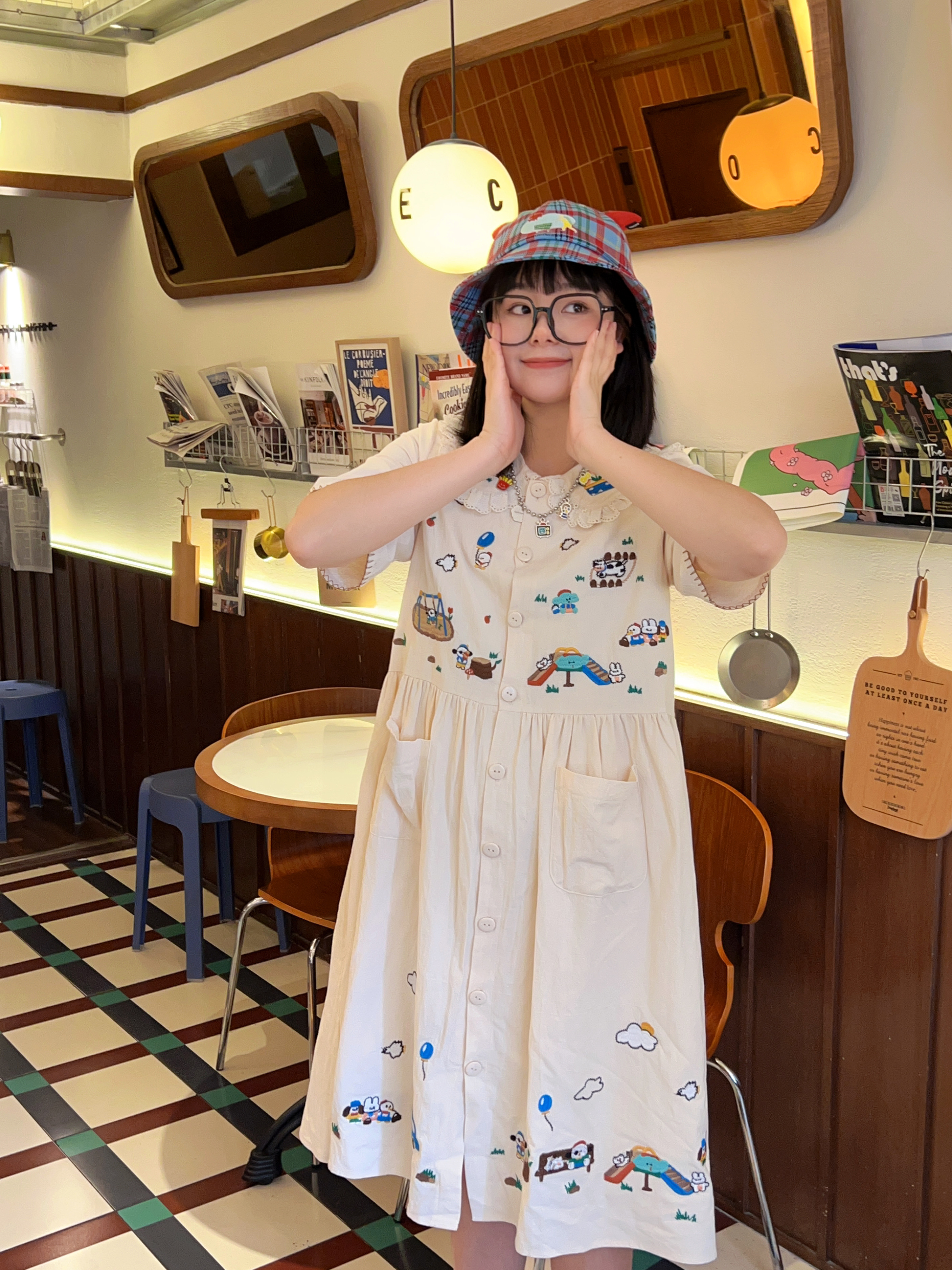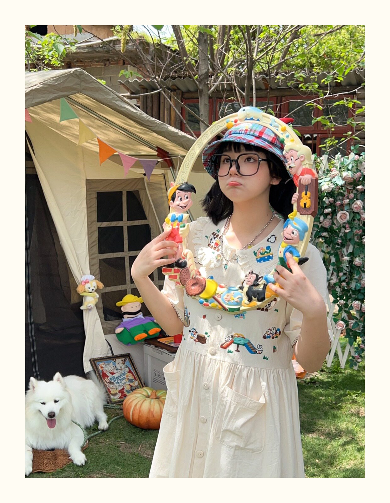 童趣古著卡通手工小刺繡日系乖巧娃娃領棉麻透氣顯瘦短袖洋裝夏