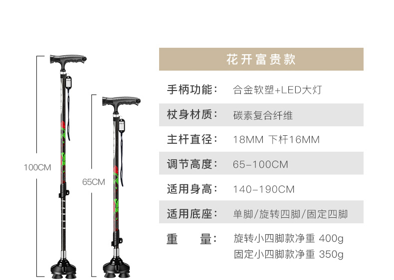 顏色分類 鬆鶴延年單用(燈座可調+碳素)單腳 鬆鶴延年兩用(燈座可調+碳素)單腳+固定四腳 鬆鶴延年兩用(燈座可調+碳素)單腳+旋轉四腳 鬆鶴延年三用(燈座可調+碳素)單腳+固定+旋轉 升級加厚禮盒裝(雞翅木手柄+輕便碳素)單腳 純色加粗單用(燈座可調+碳素)單腳 花開富貴兩用(燈座可調+碳素)單腳+旋轉四腳