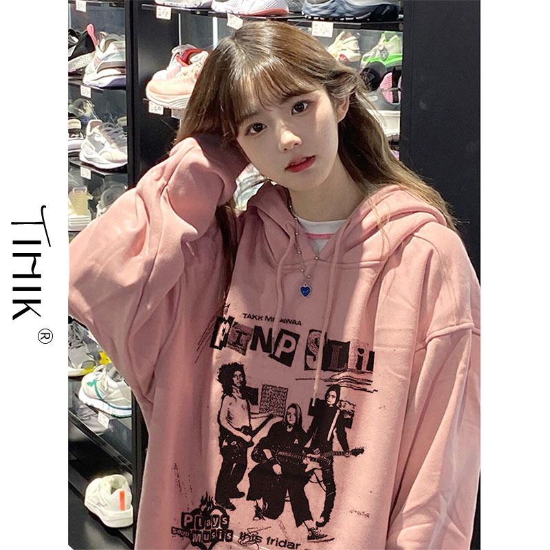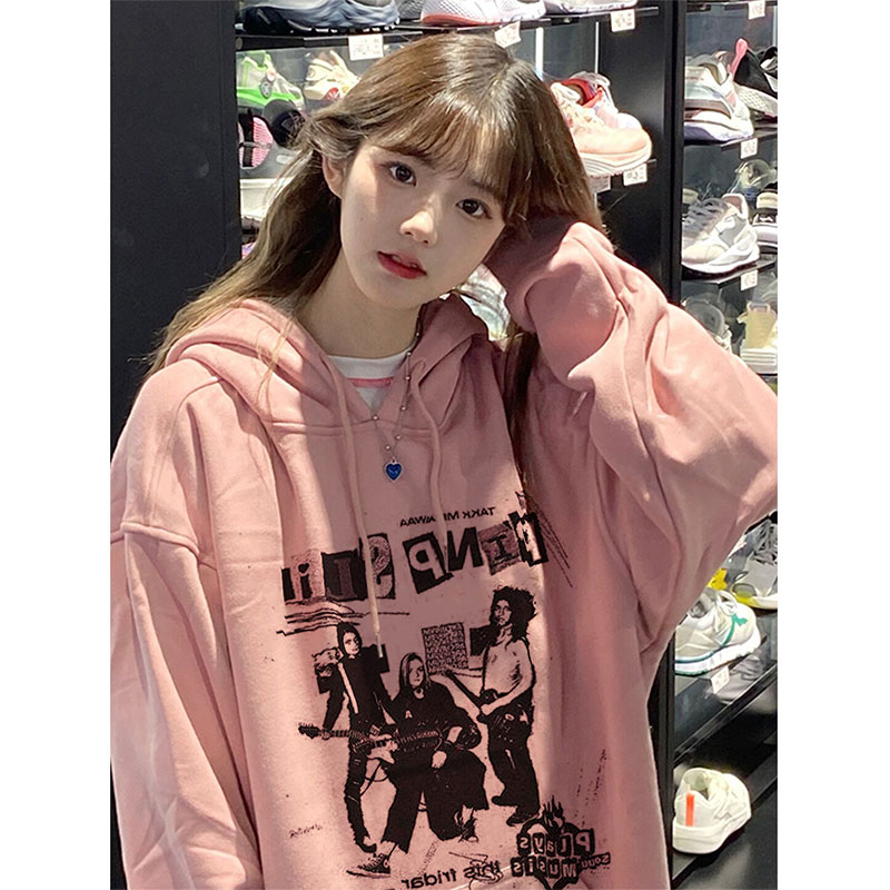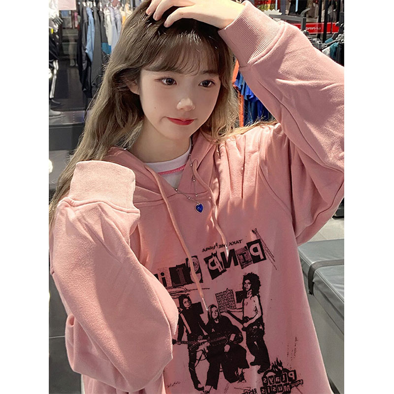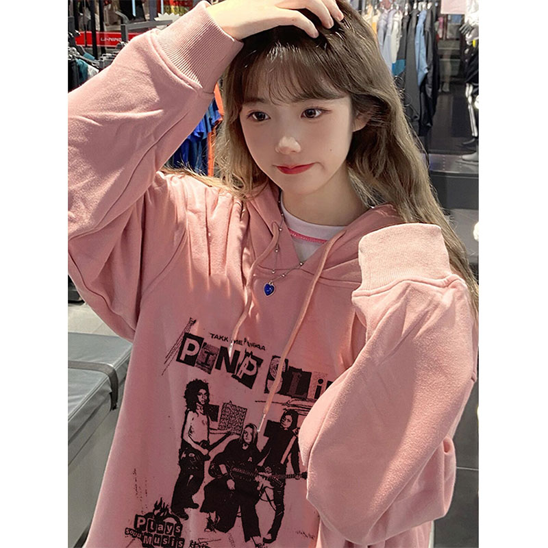 正肩國潮原創高街美式粉色衛衣正肩連帽外套春秋鹽繫上衣女慵懶風