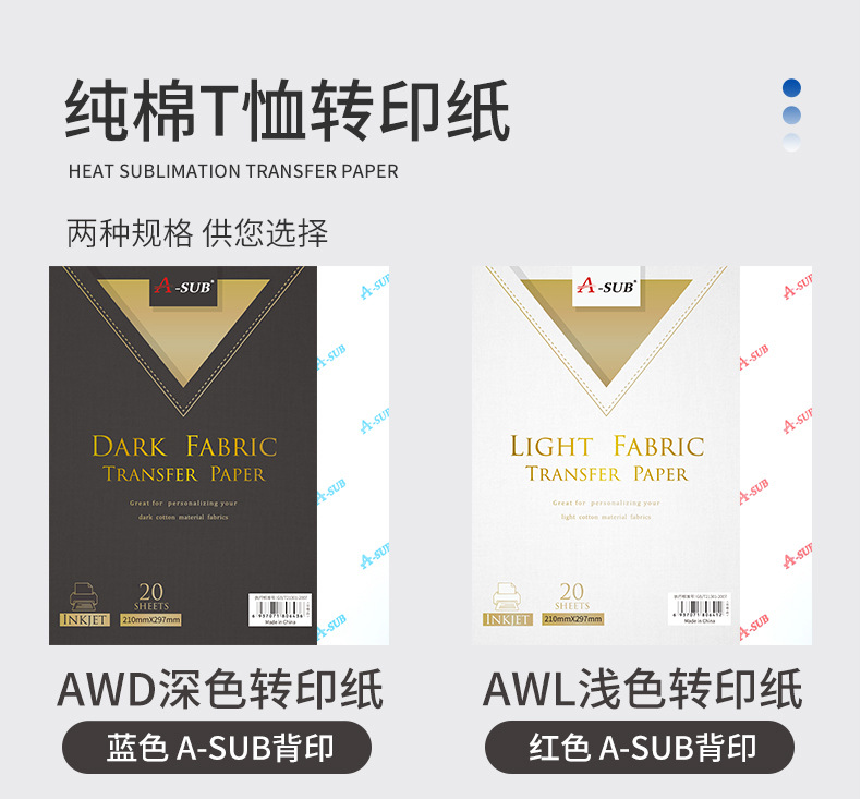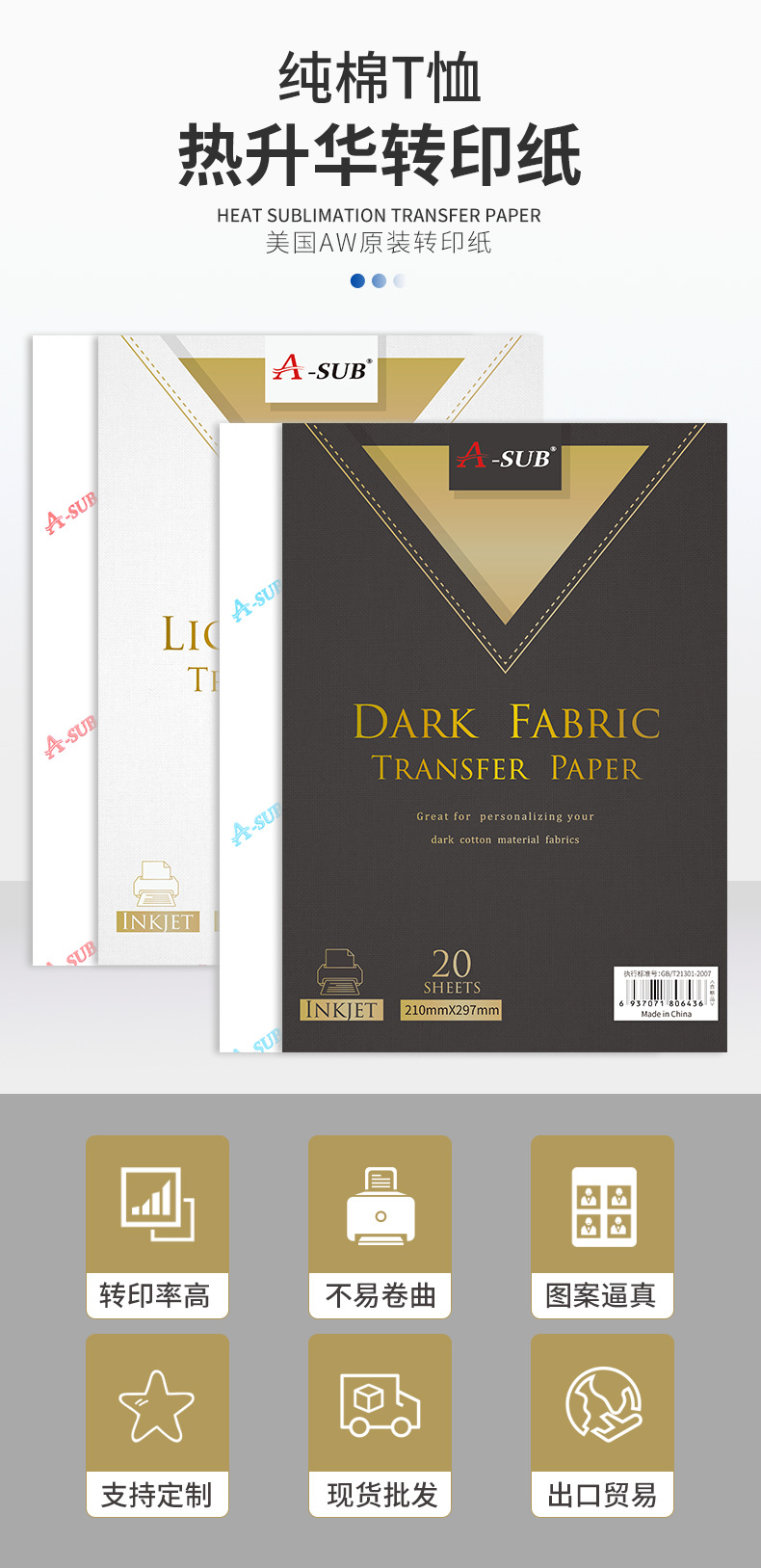 A-SUB AW纯棉热转印纸深色浅色衣服T恤转印纸A4喷墨热转印纸