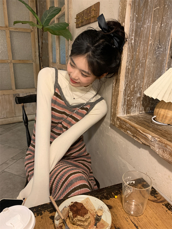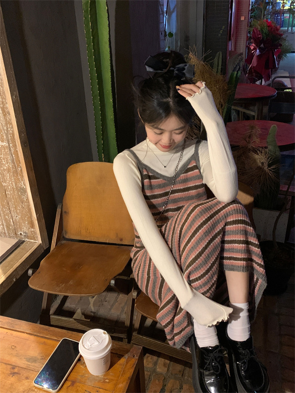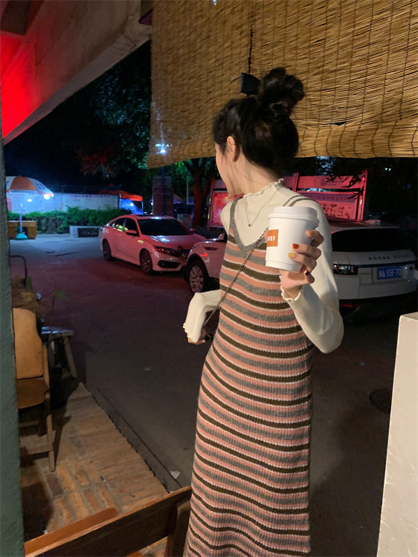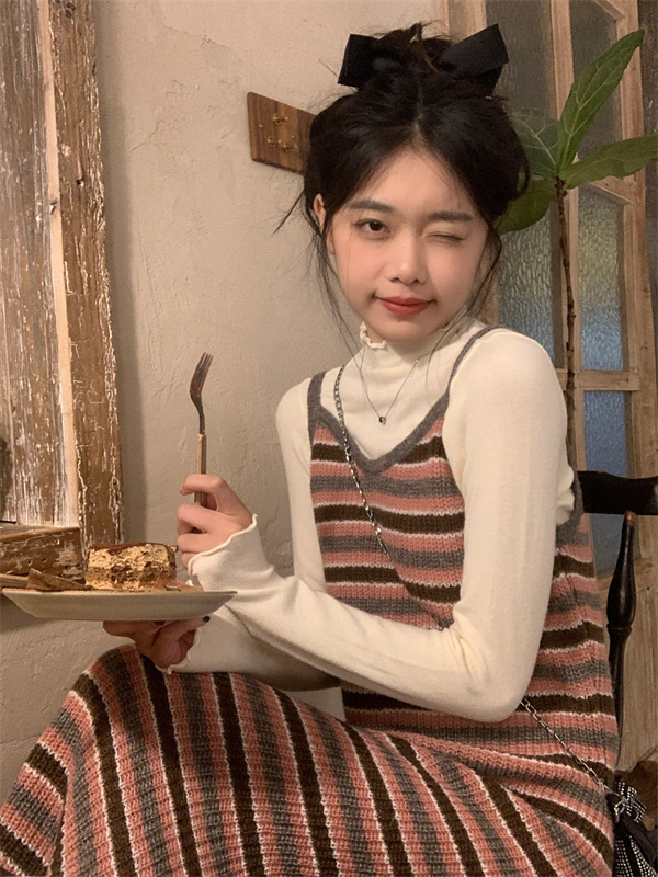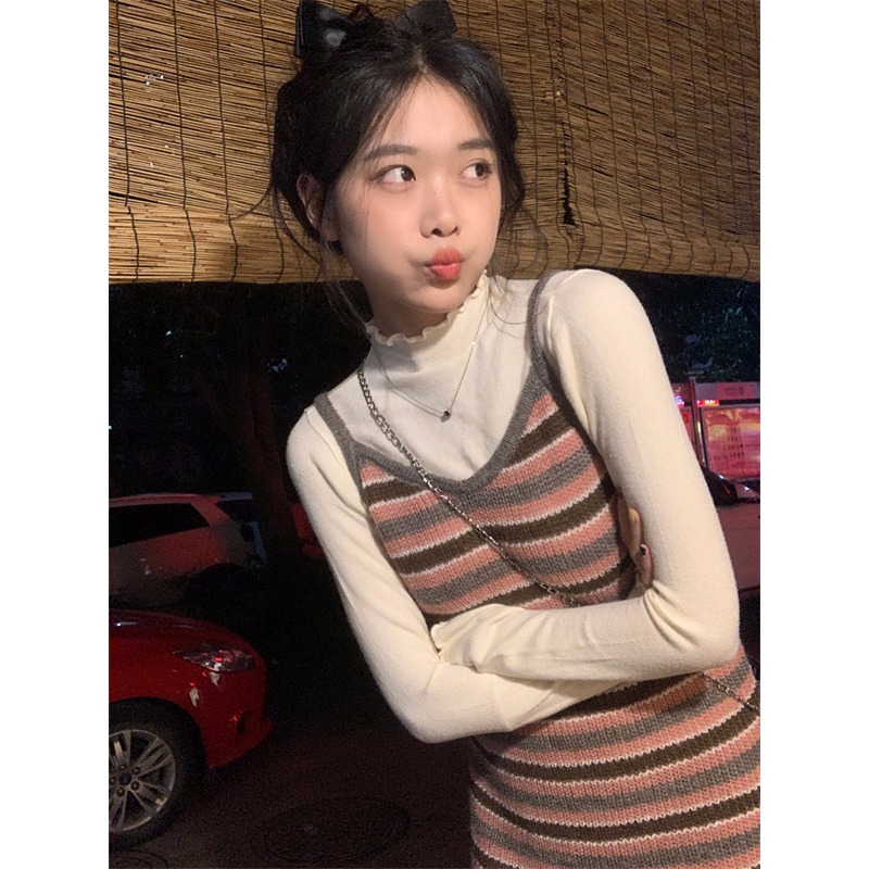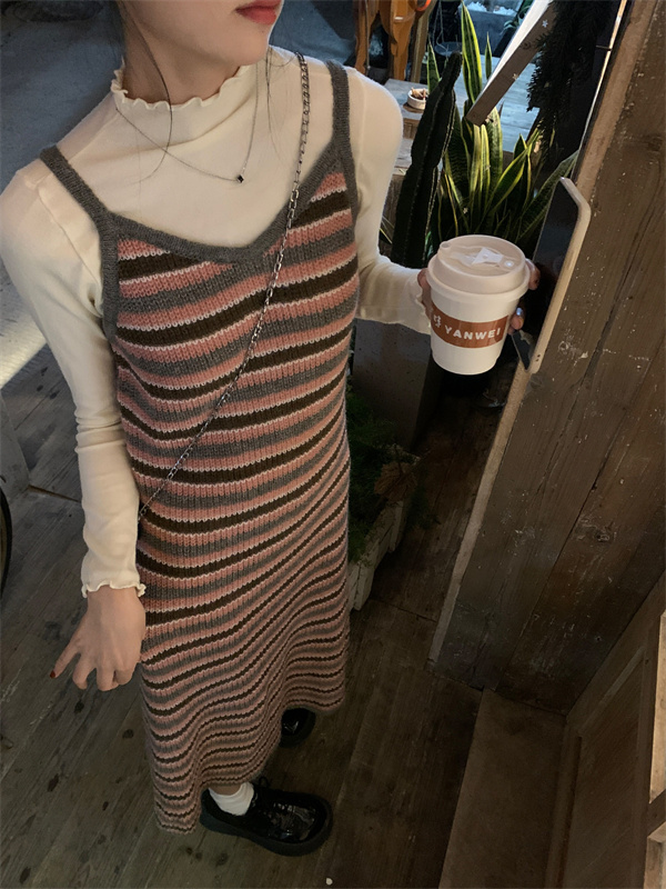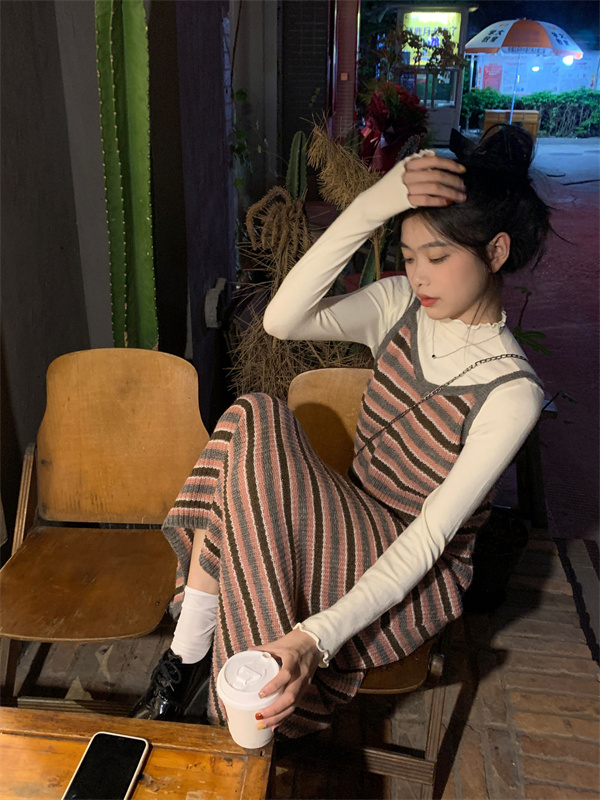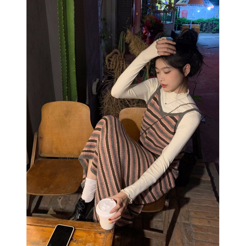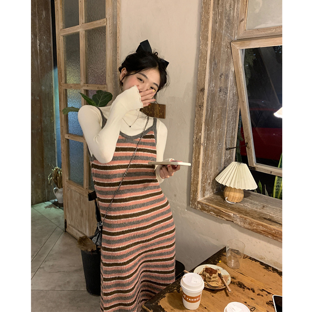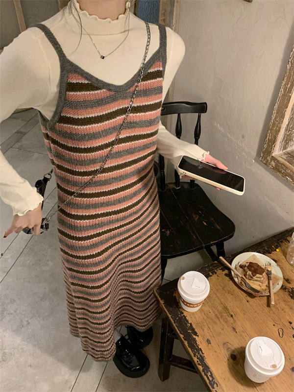 條紋針織吊帶裙女秋冬垂墜感法式漂亮復古獨特別致包臀長版洋裝