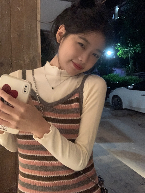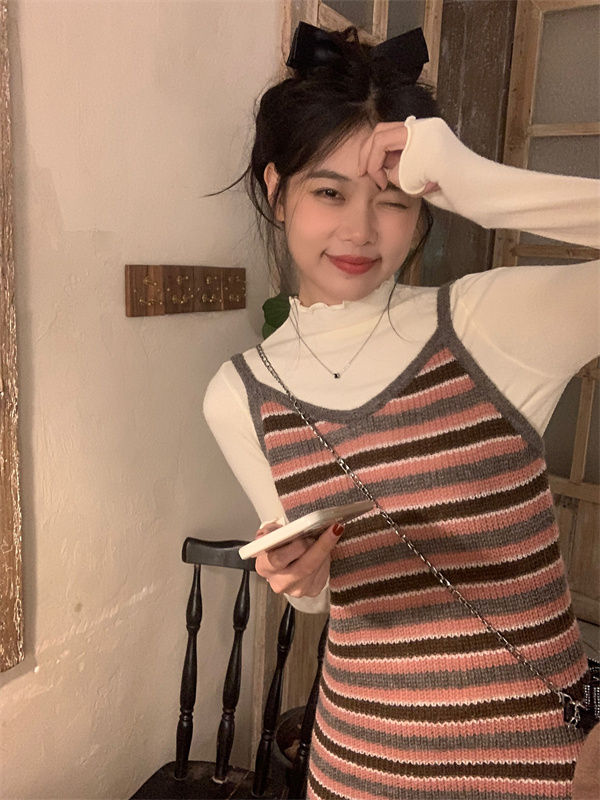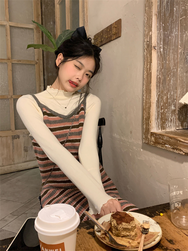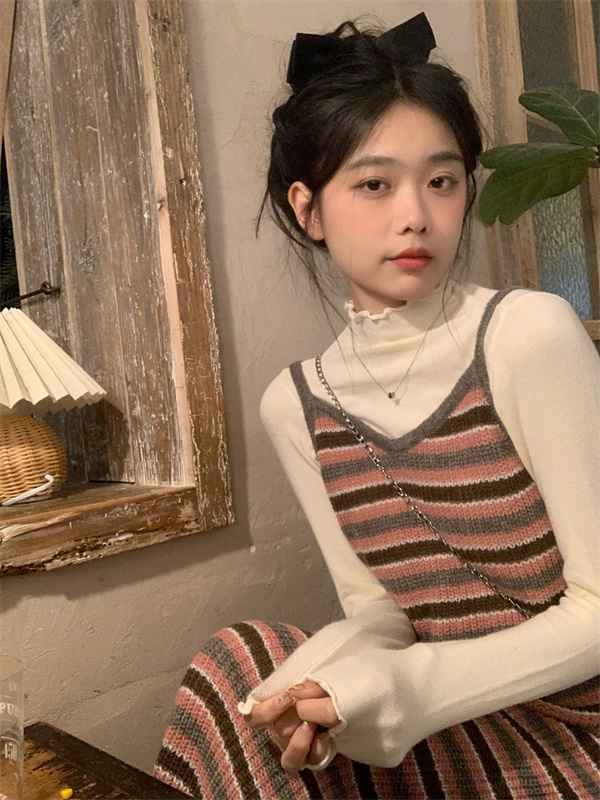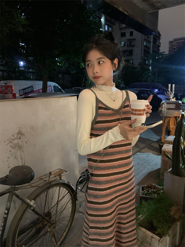 顏色分類 杏色高領內搭,粉色吊帶長裙