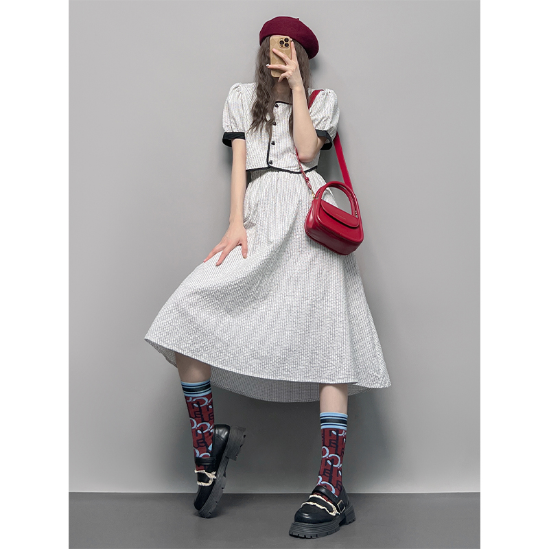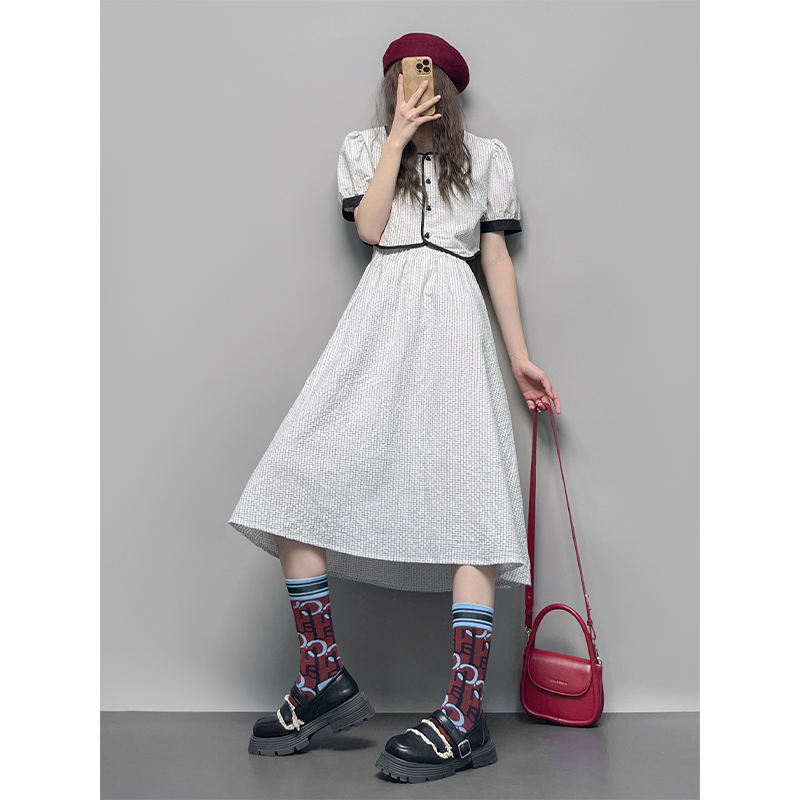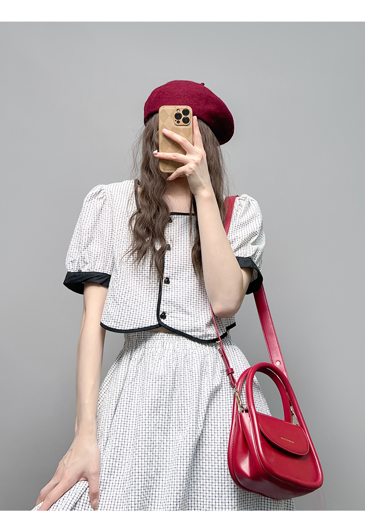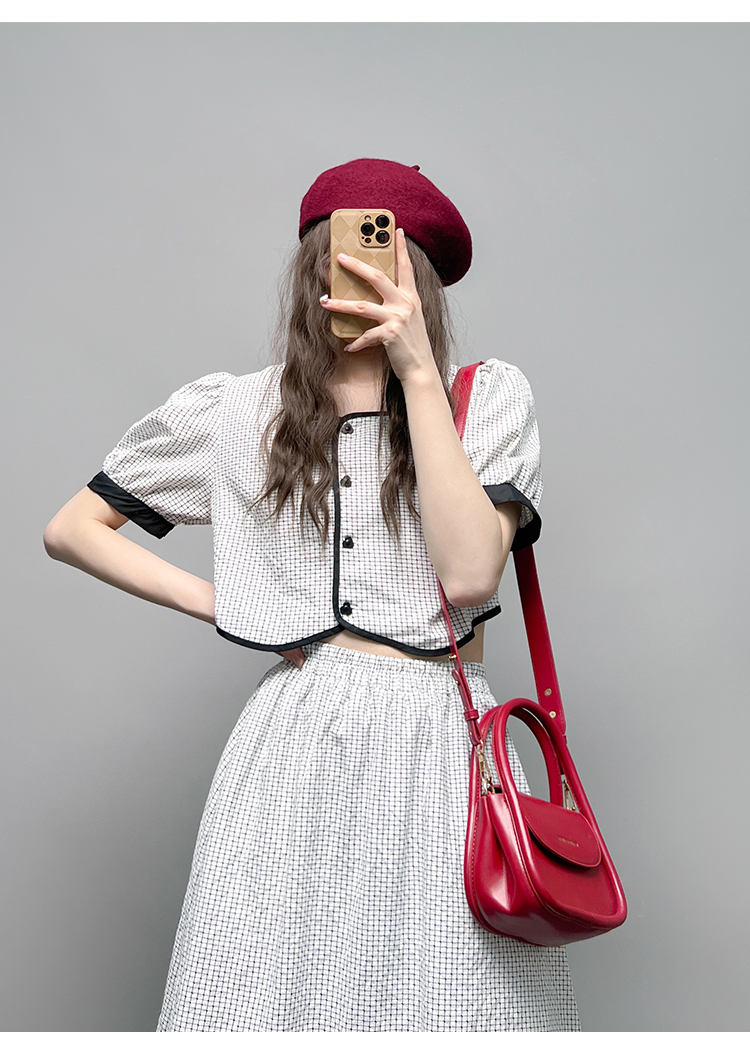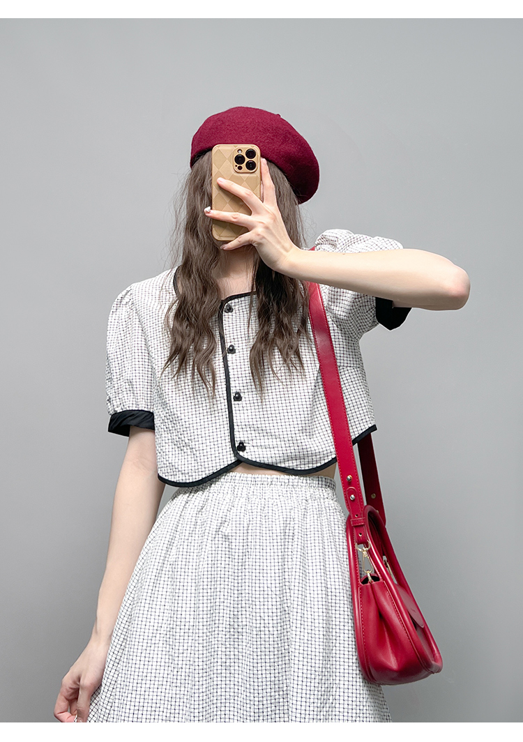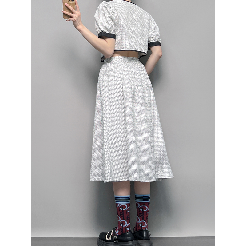 GLUFR 法系格子兩件套女泡泡袖圓領短襯衫新款夏季大擺半身裙2023