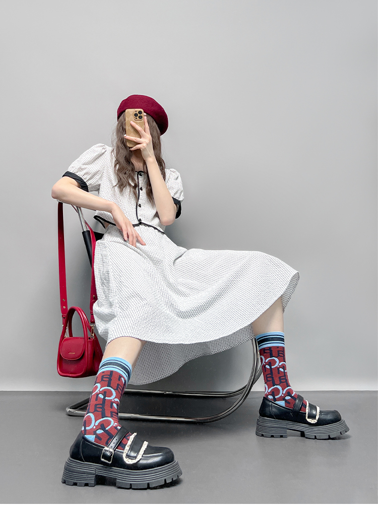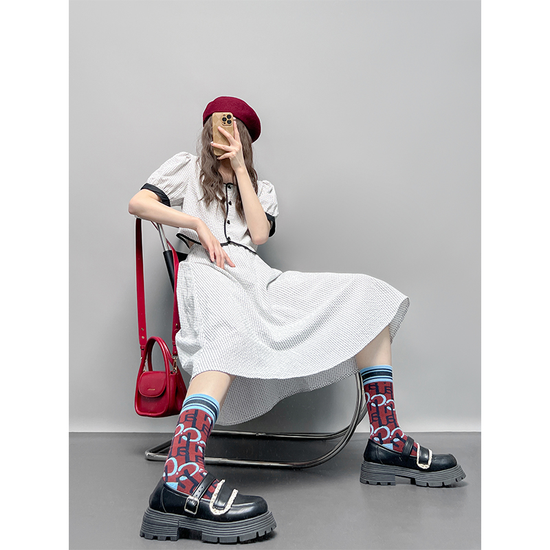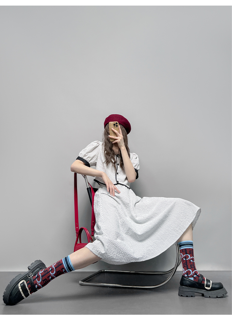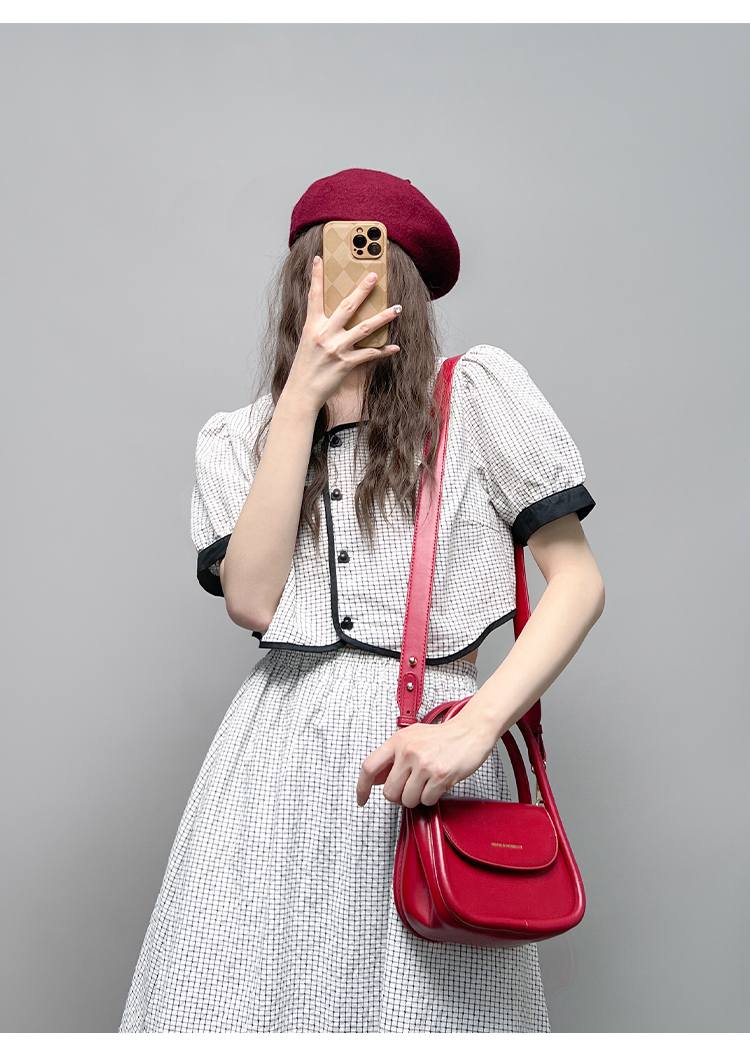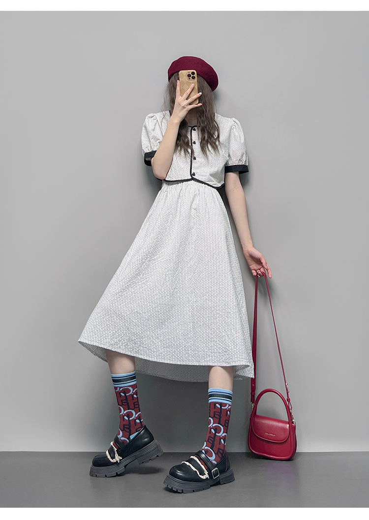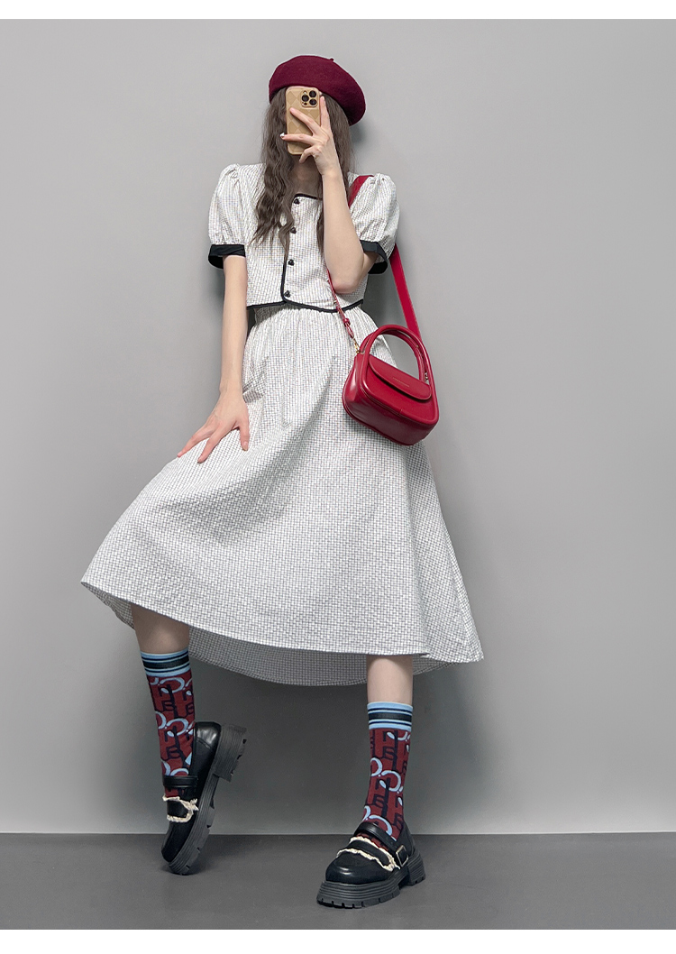 GLUFR 法系格子兩件套女泡泡袖圓領短襯衫新款夏季大擺半身裙2023