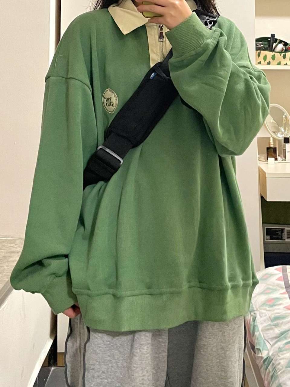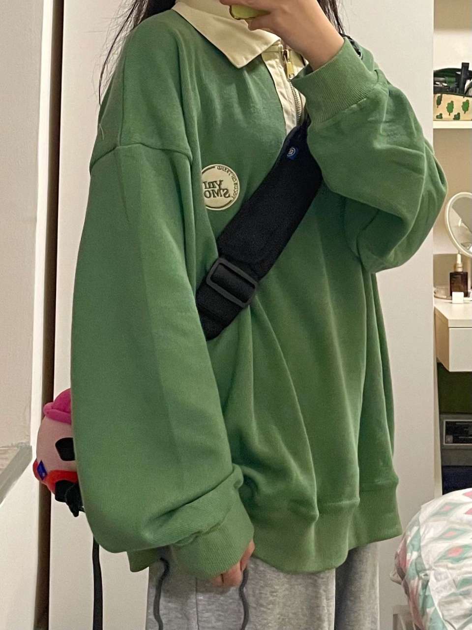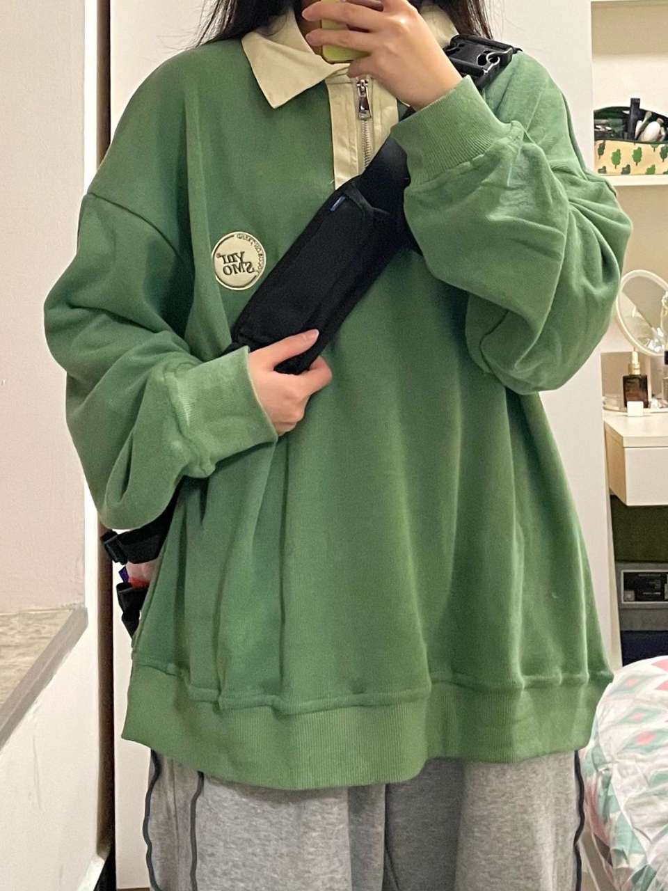 綠色polo領衛衣女春秋冬美式復古oversize寬鬆慵懶風插肩長袖上衣