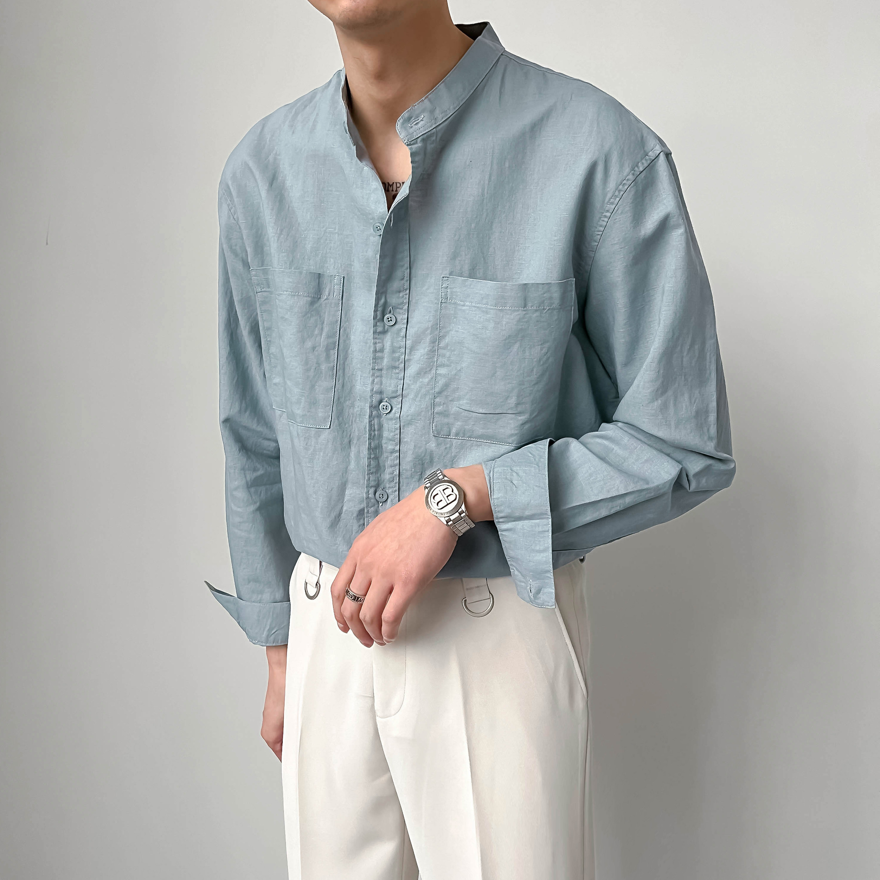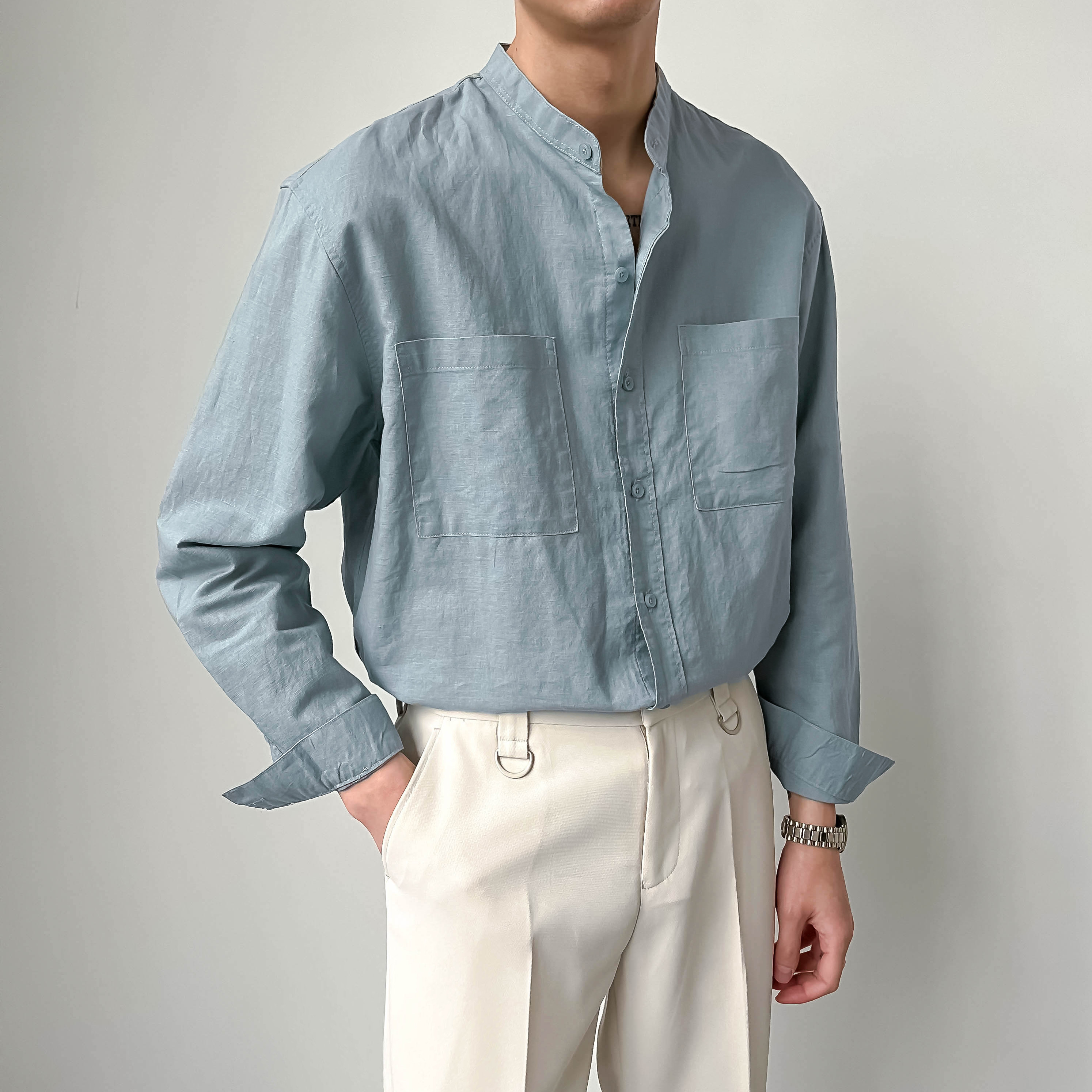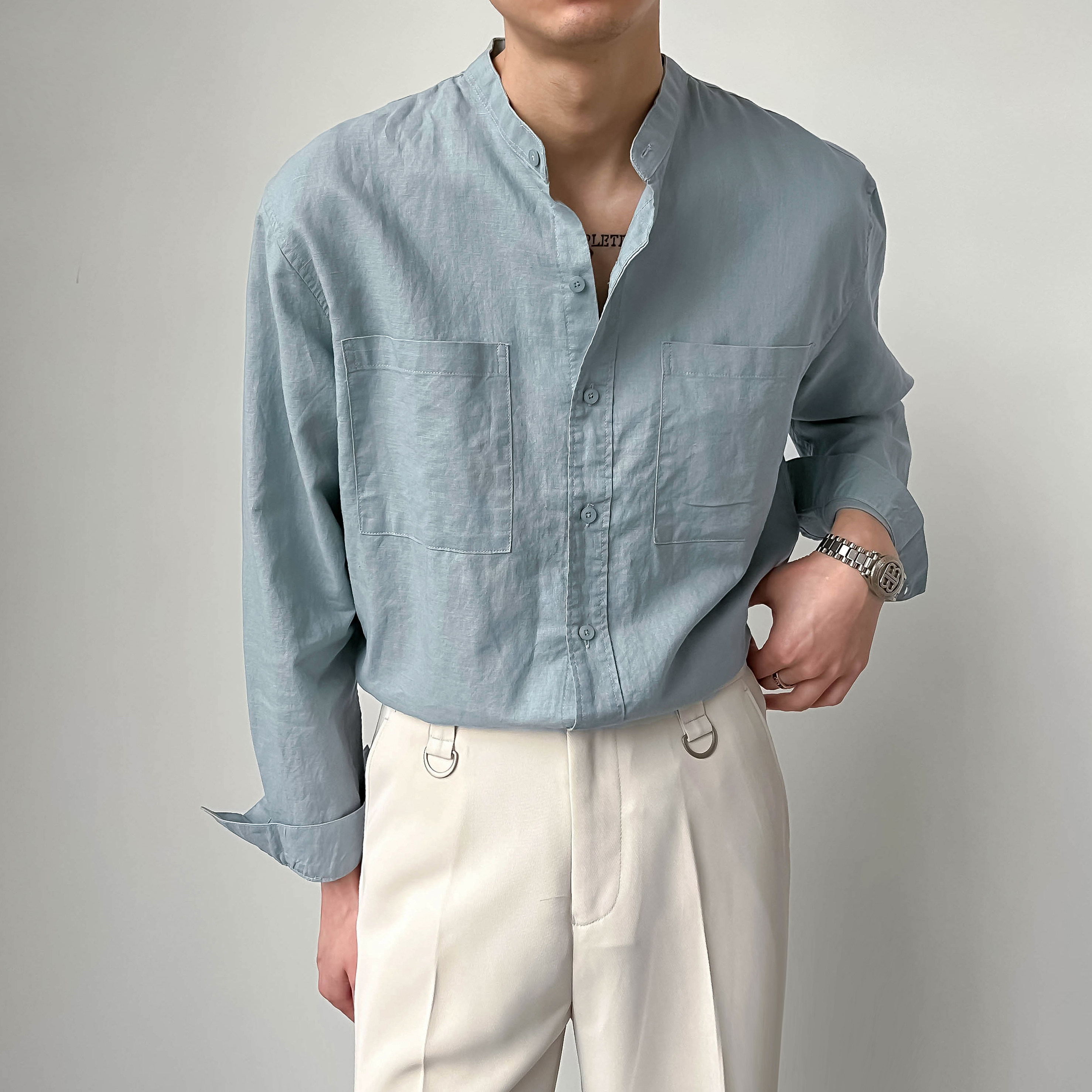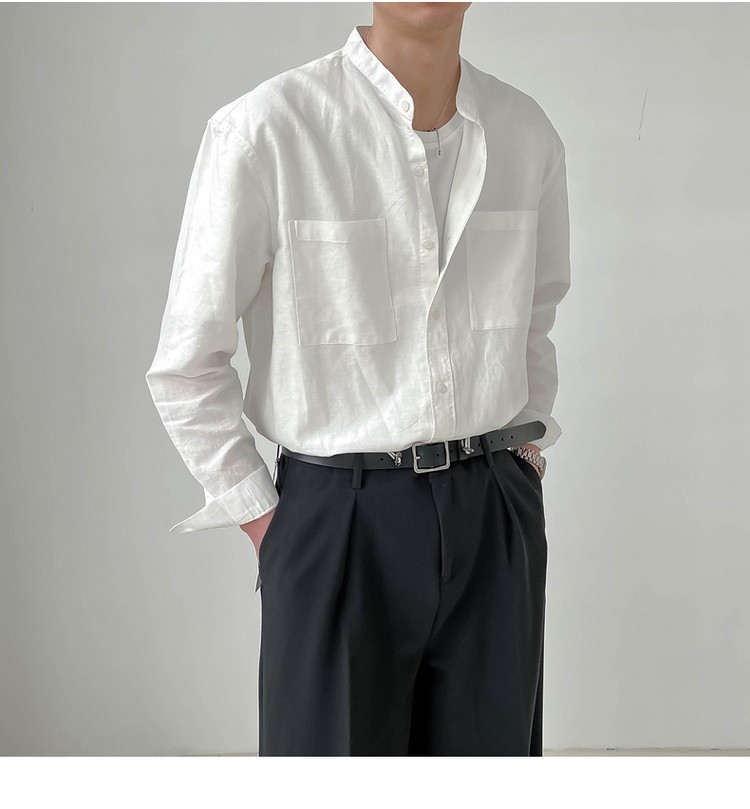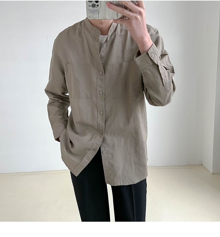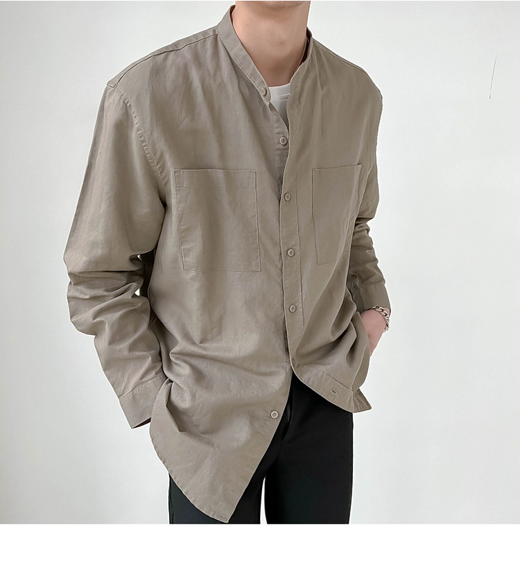 ZPZ春夏季上衣韓版寬鬆立領中山裝 男士長袖襯衫潮流休閒棉麻襯衫