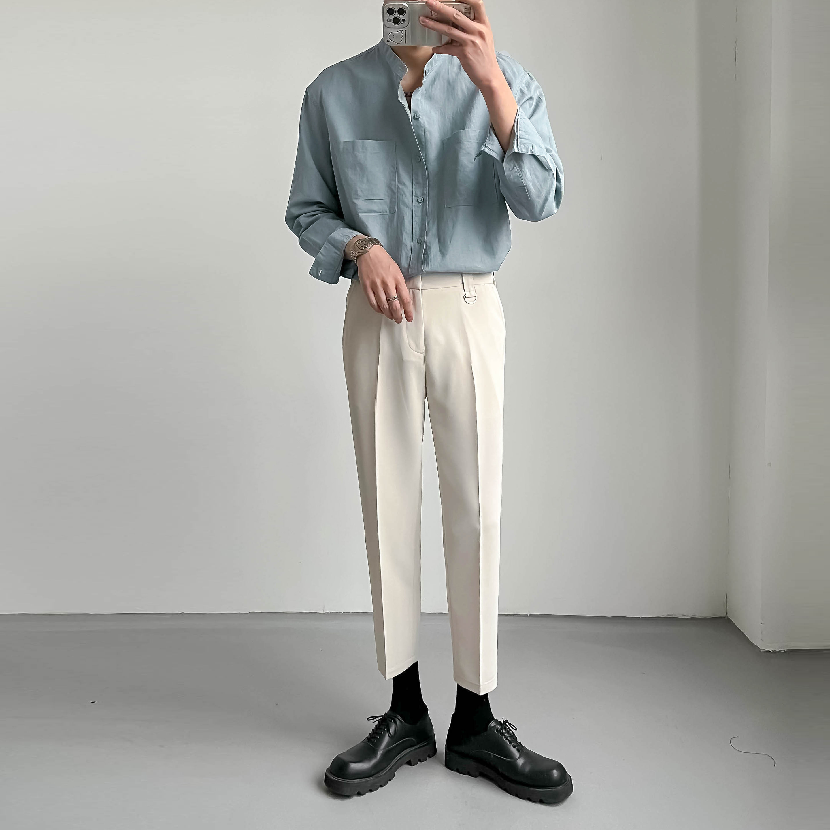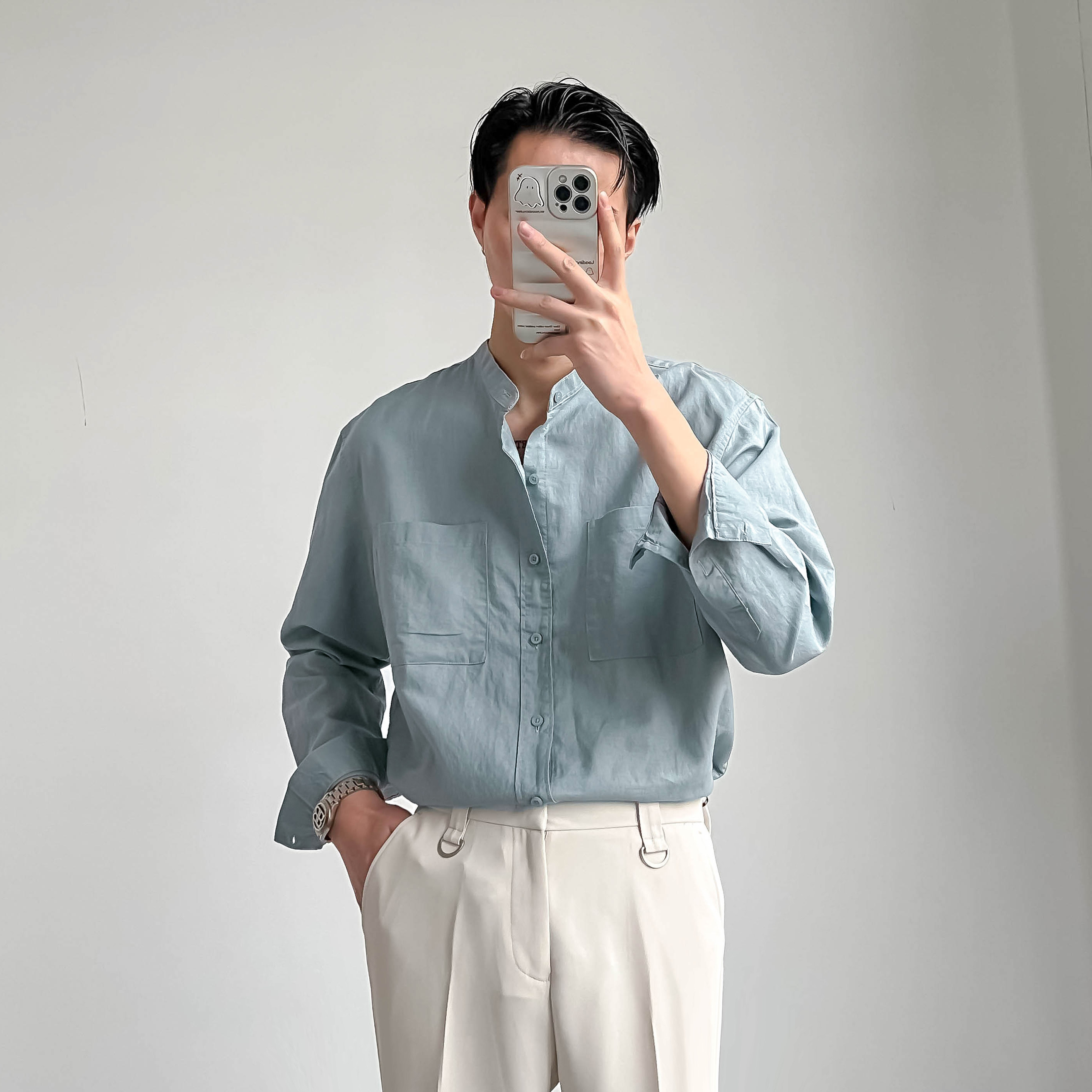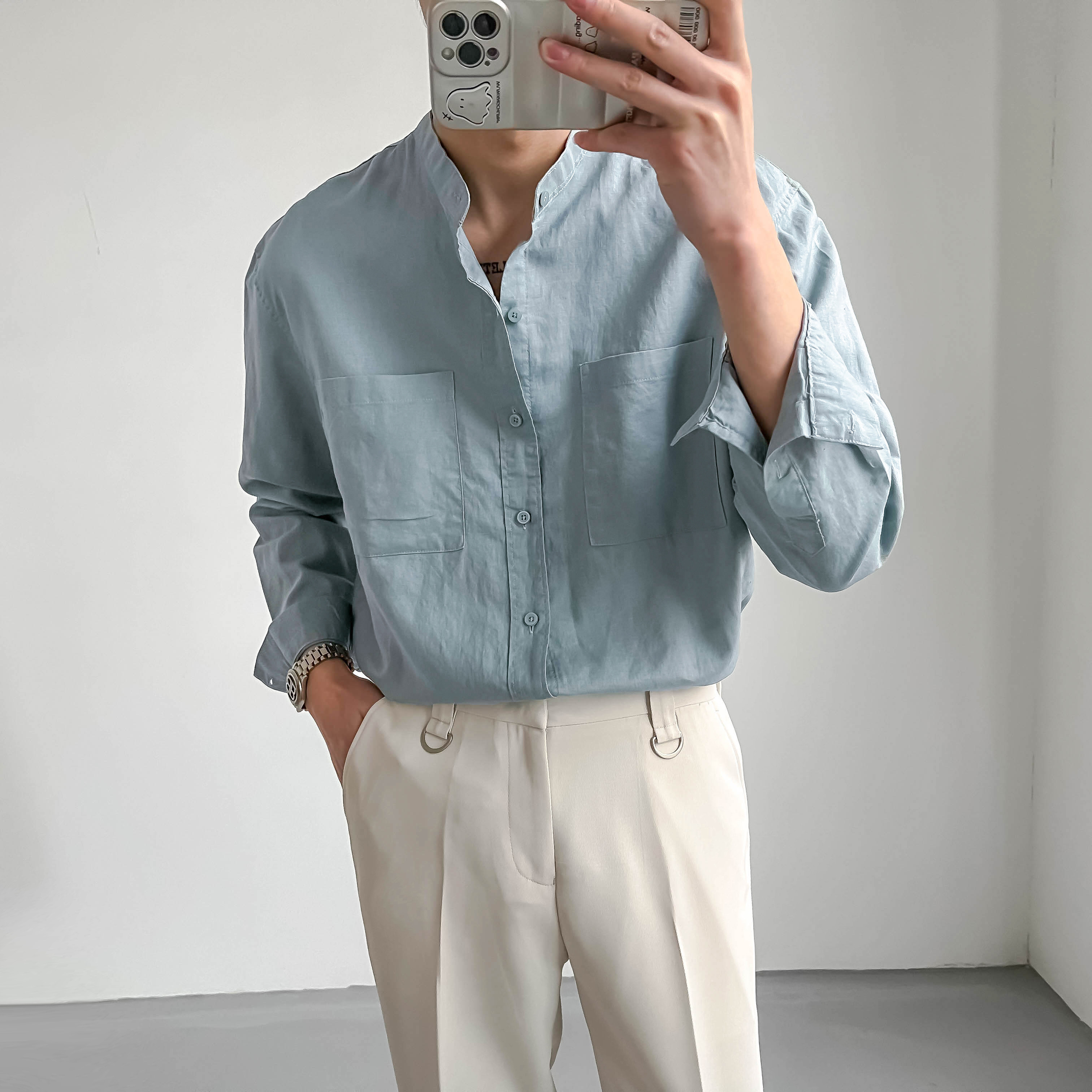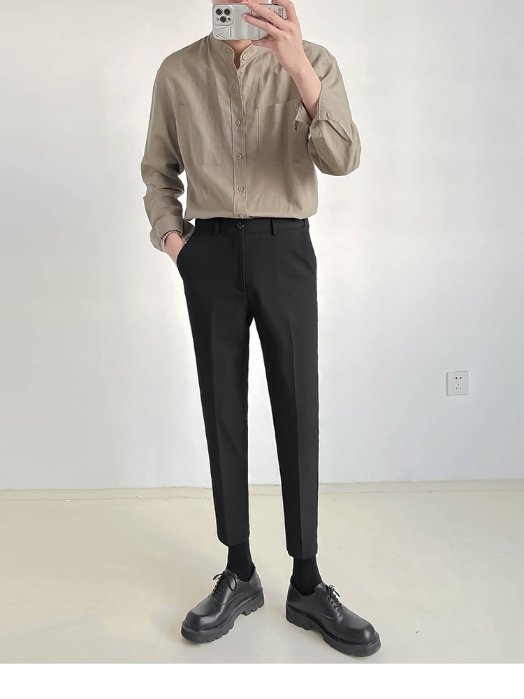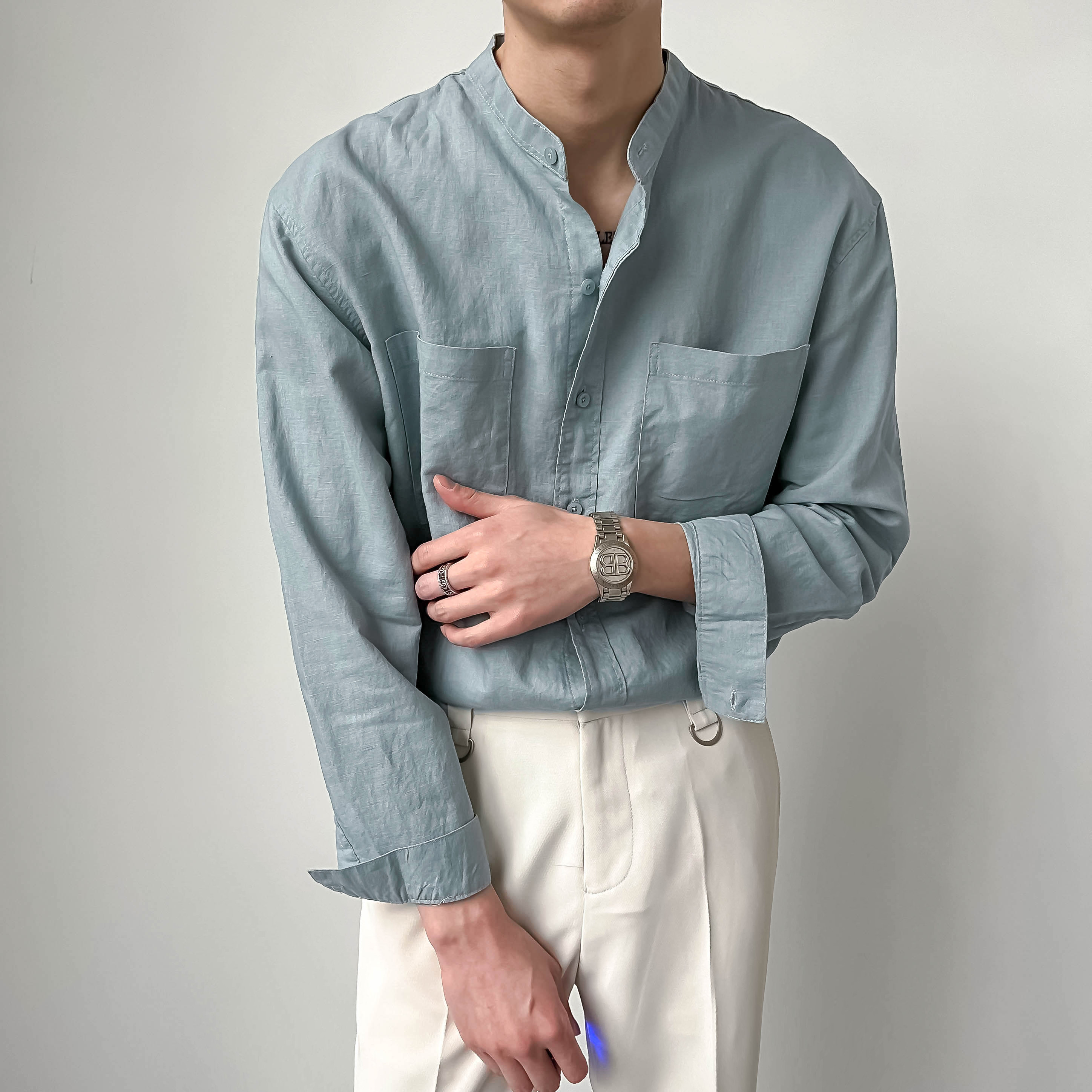 ZPZ春夏季上衣韓版寬鬆立領中山裝 男士長袖襯衫潮流休閒棉麻襯衫