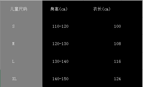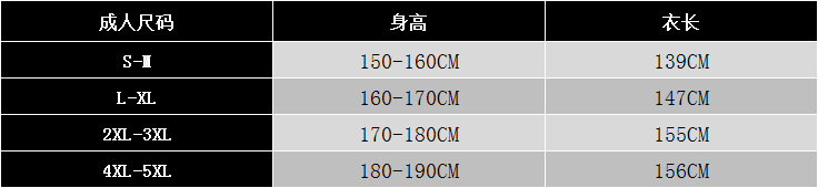 尺码 儿童110-120,儿童120-130,儿童130-140,儿童140-150,S-M,L-XL,2XL-3XL,4XL-5XL