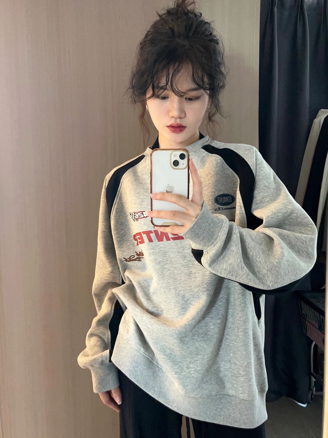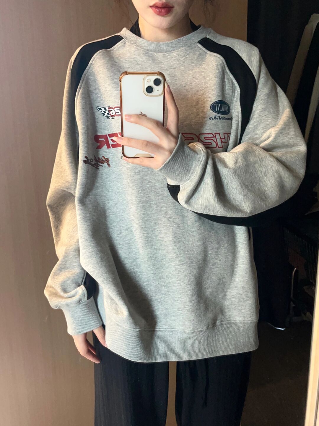正肩花灰色厚棉T女設計感小眾春秋拼接上衣高街美式復古賽車服外套