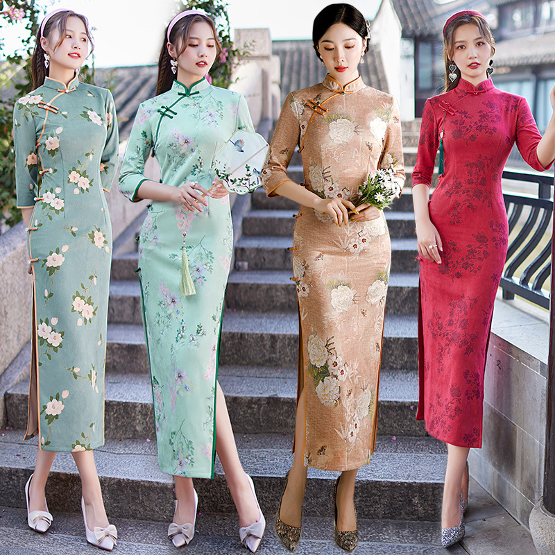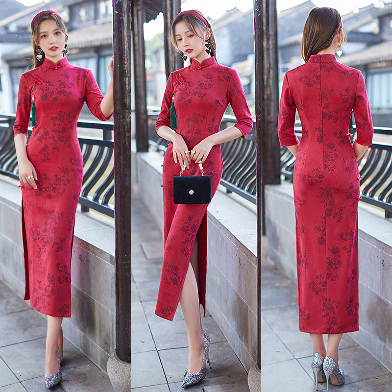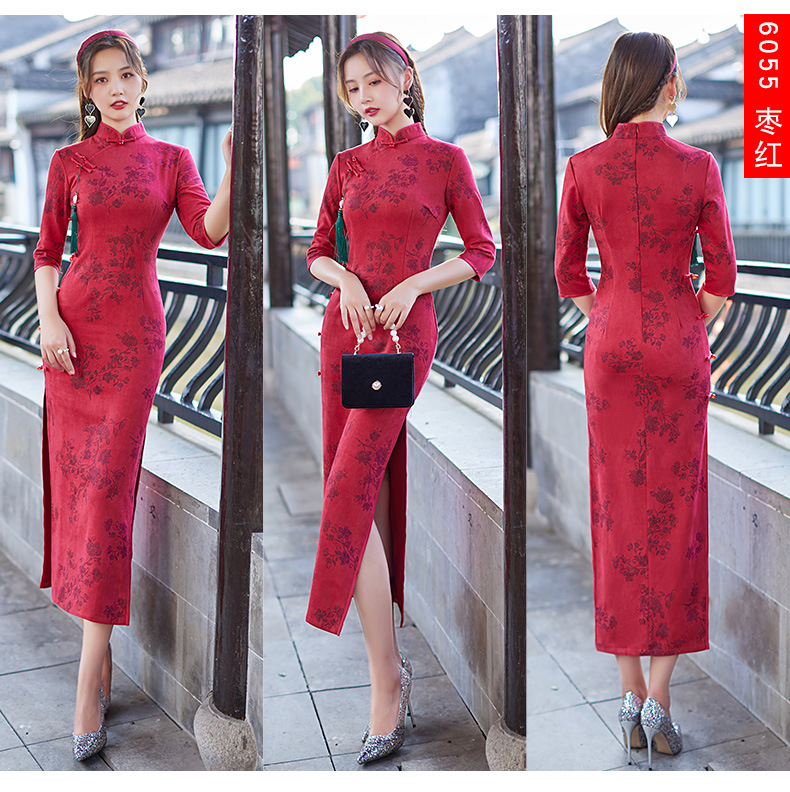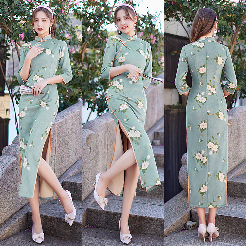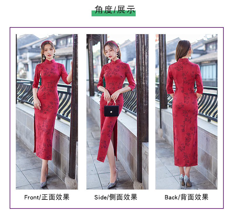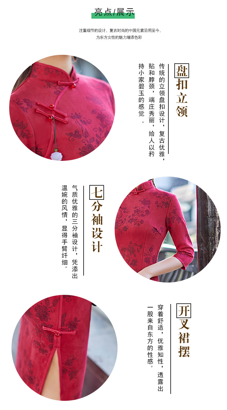 麂皮绒单层长款七分袖日常旗袍 新款改良秋冬装中国风连衣裙