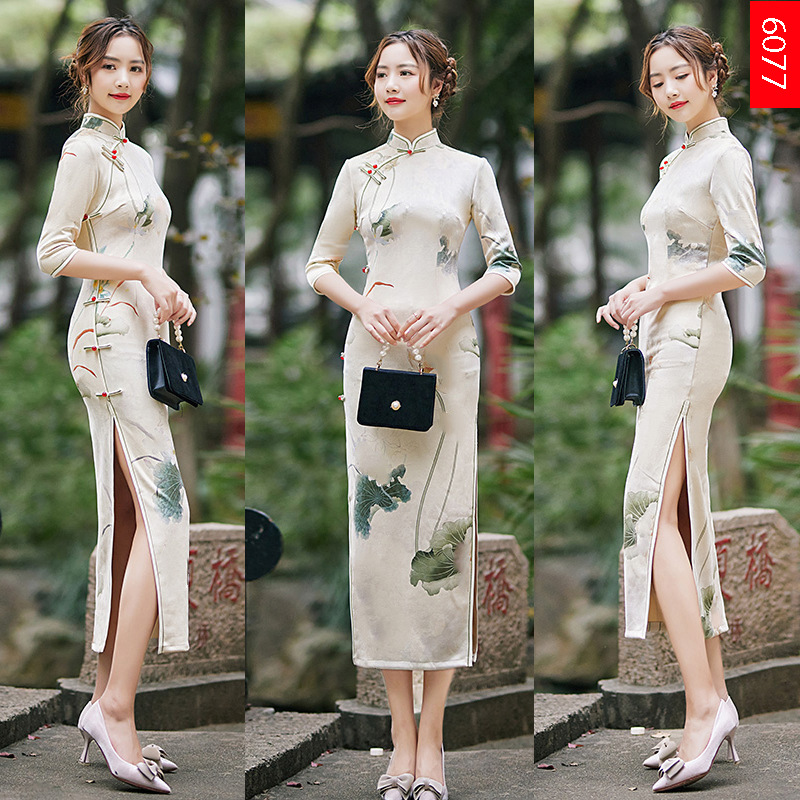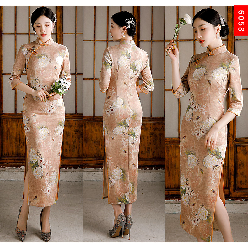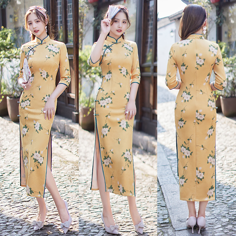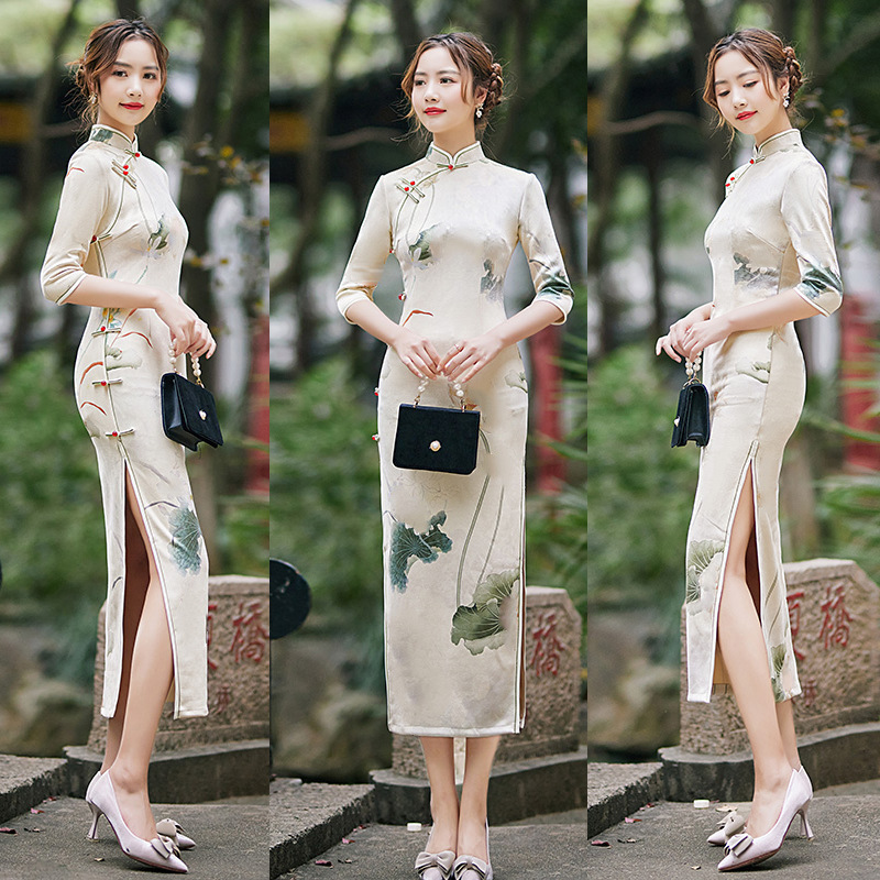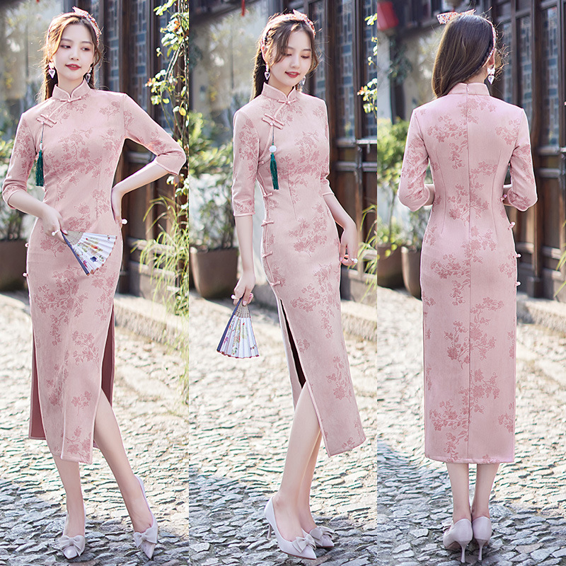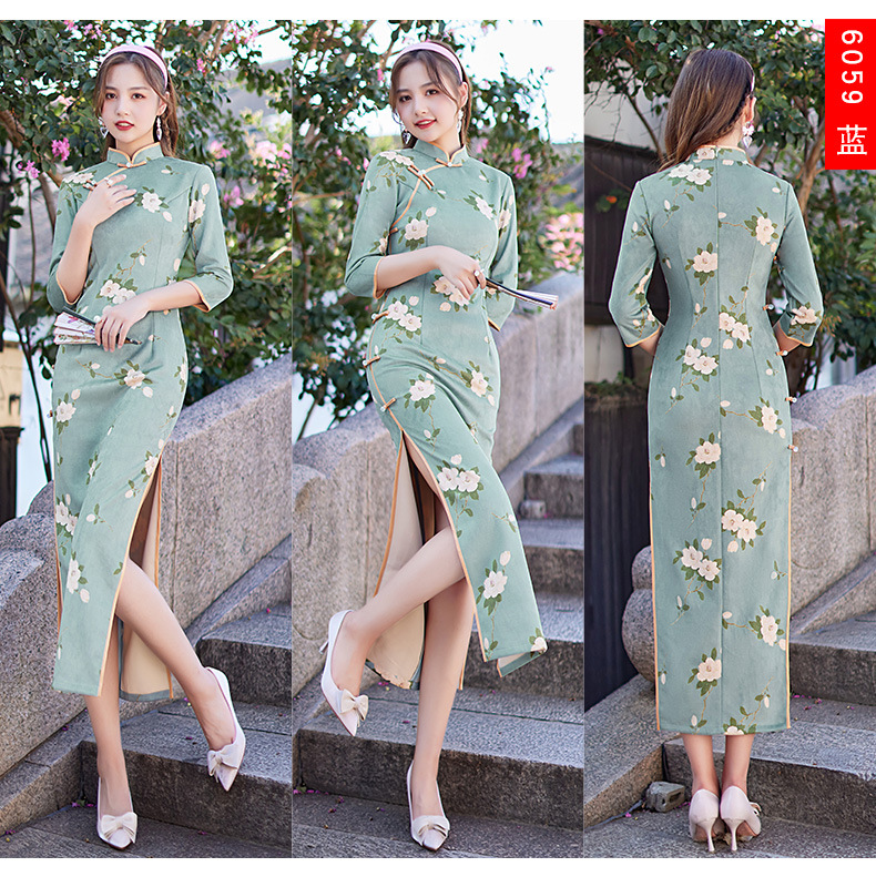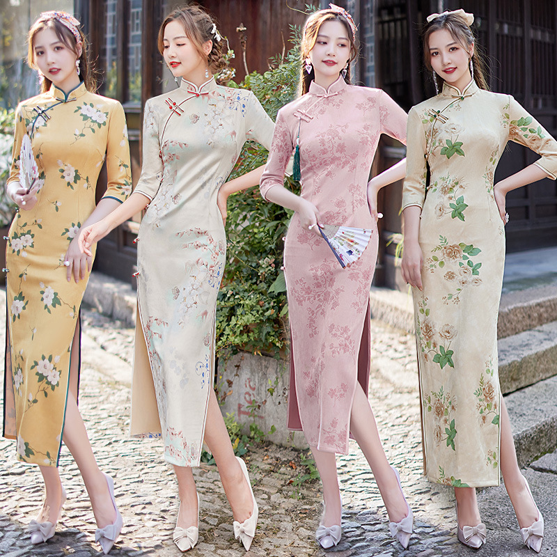 麂皮绒单层长款七分袖日常旗袍 新款改良秋冬装中国风连衣裙