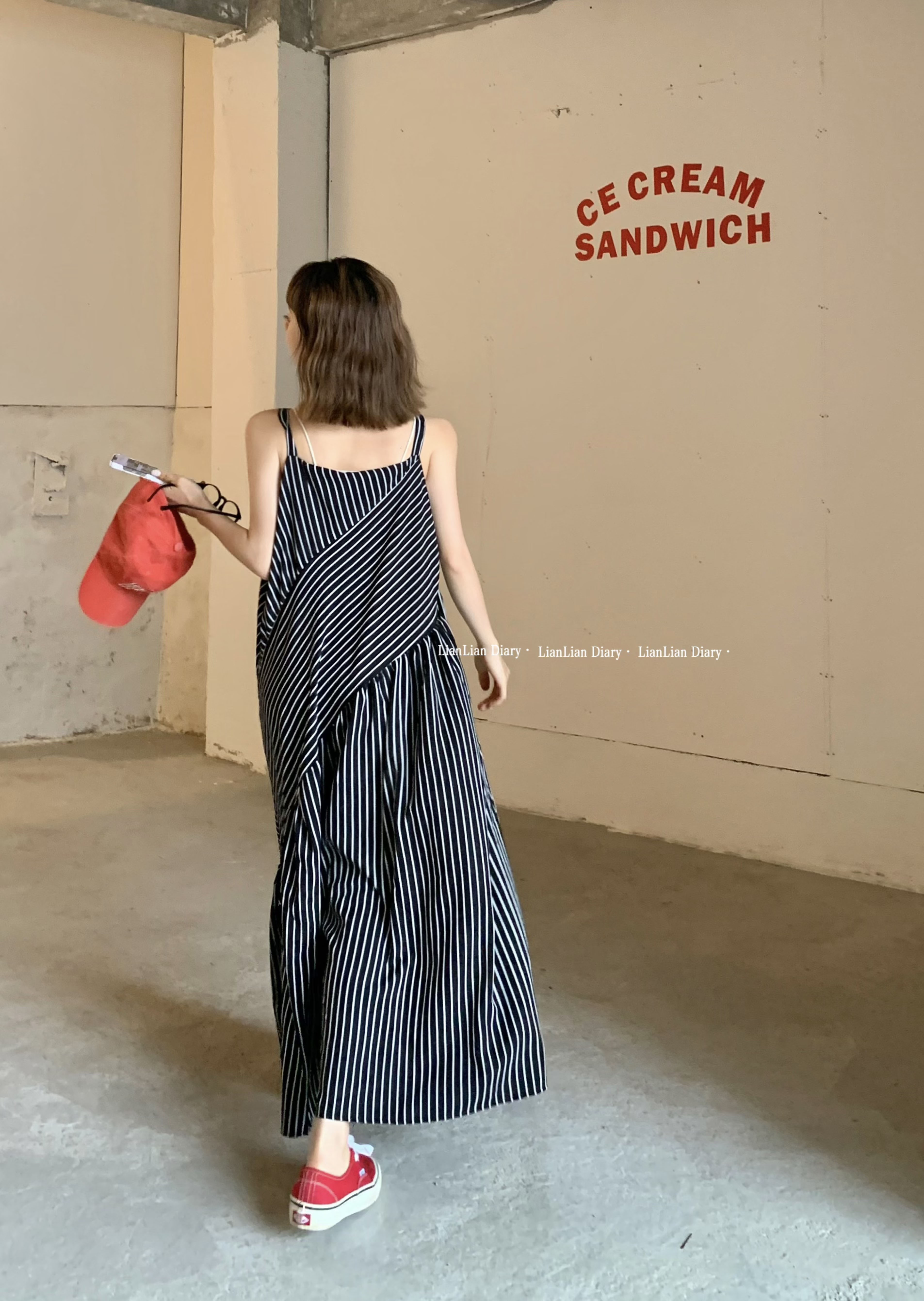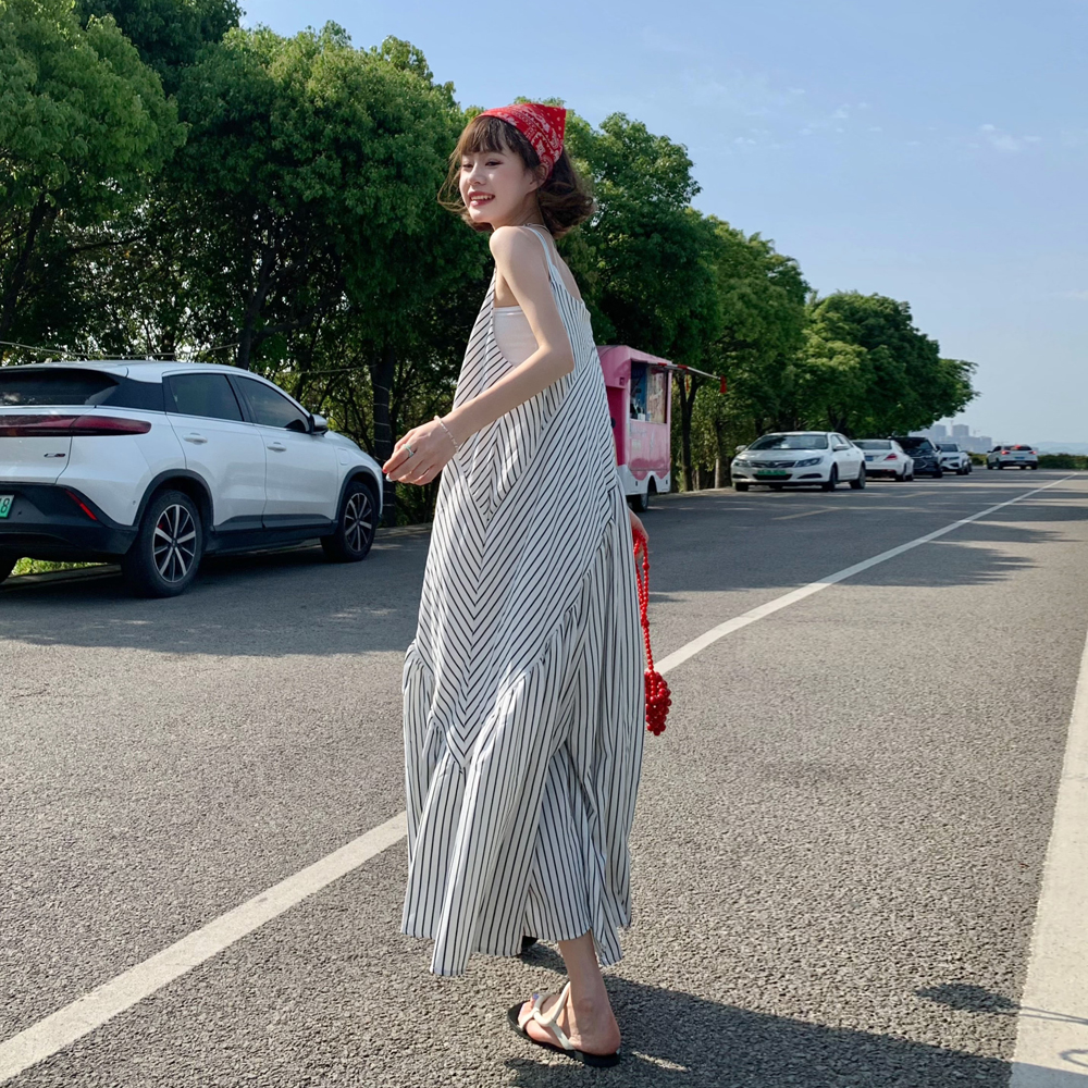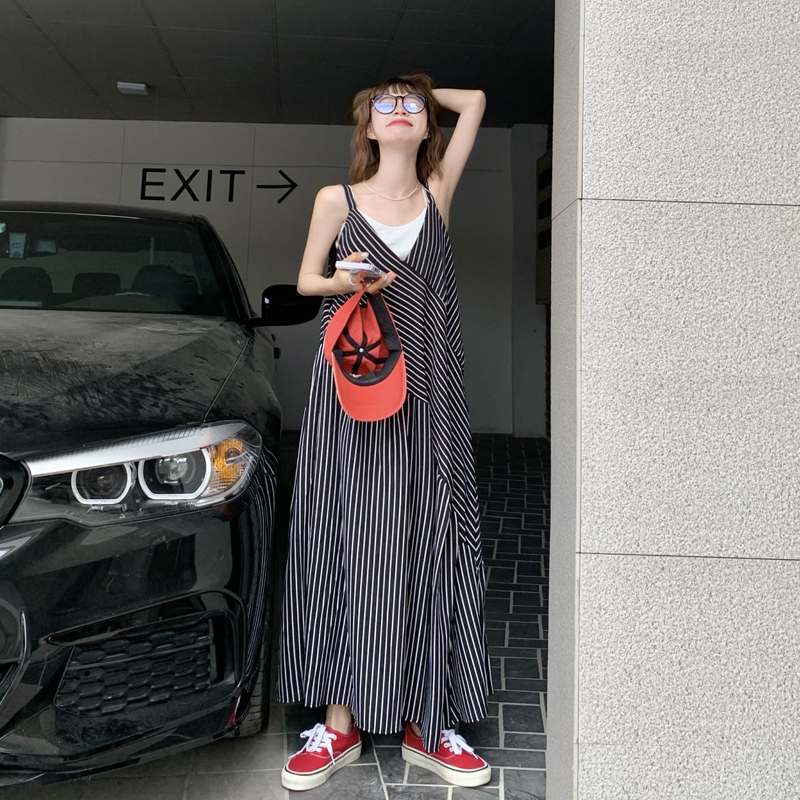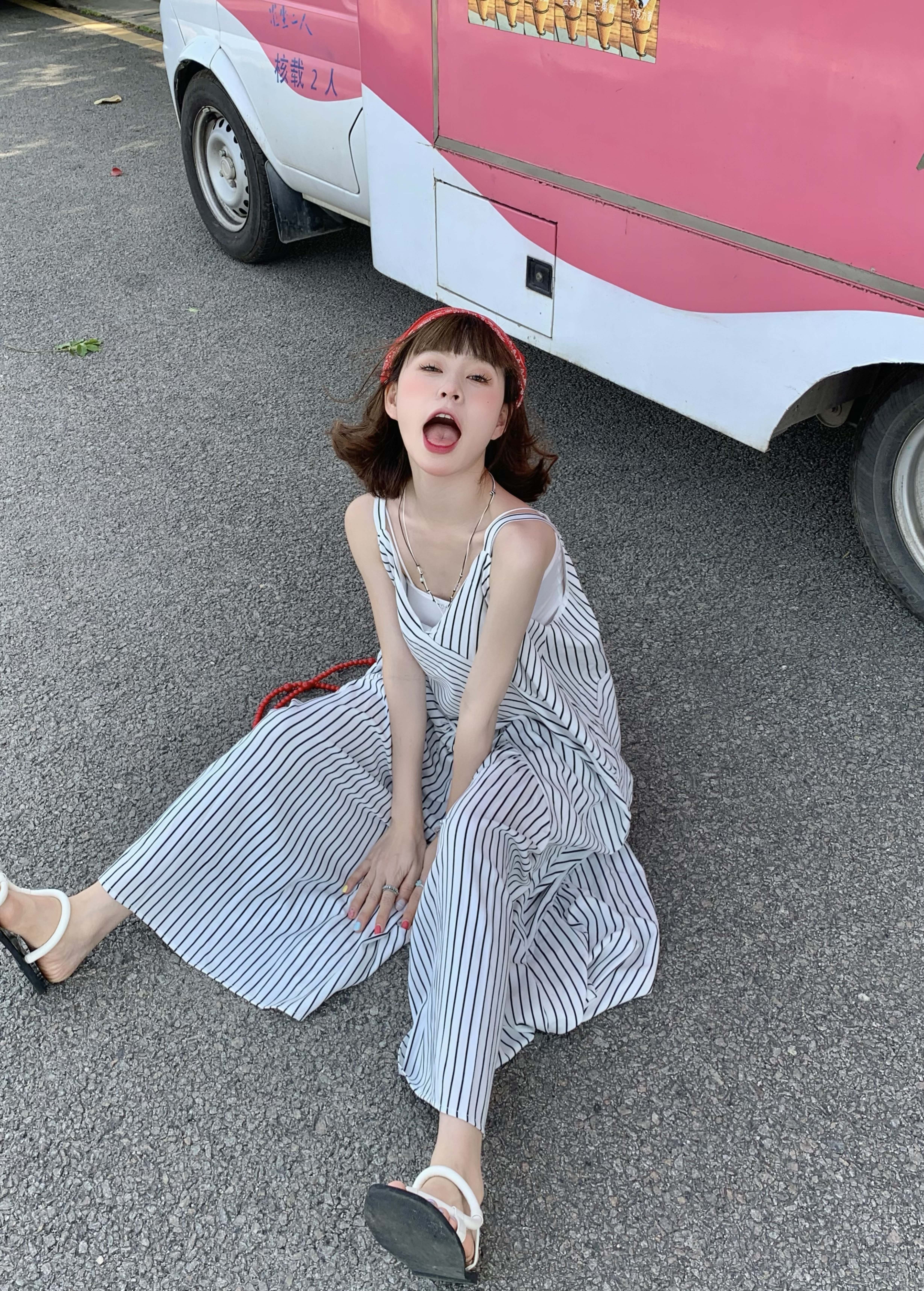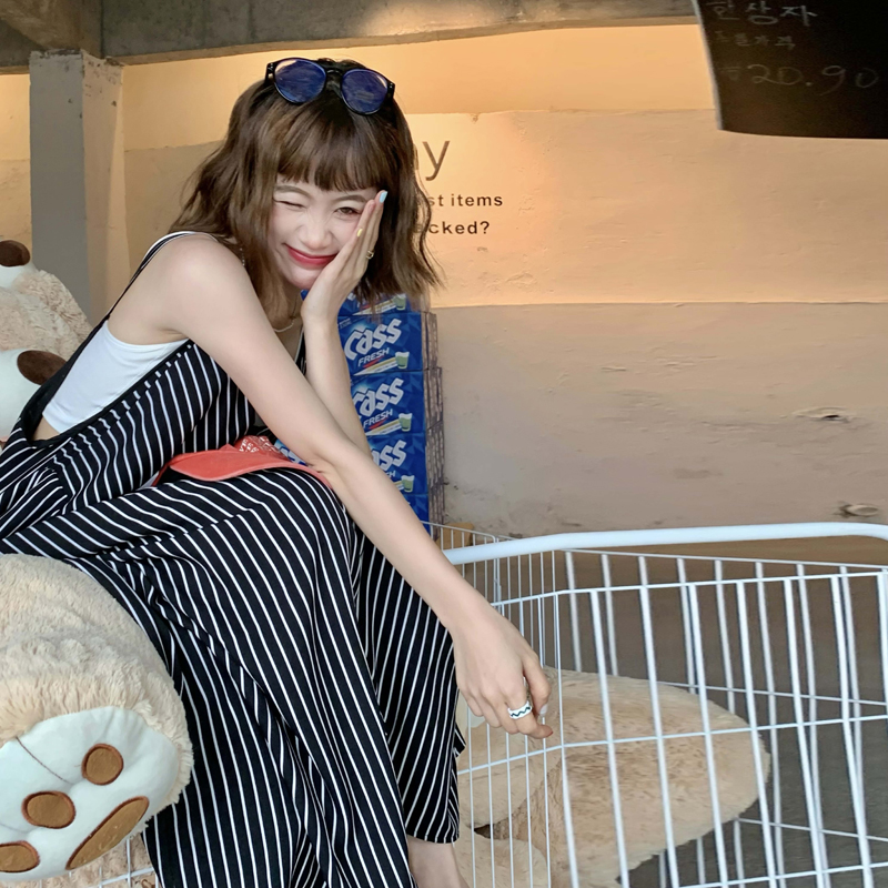 MZ原創/寬鬆休閒慵懶風oversize吊帶連身褲"女春夏條紋抱嬰袋闊腿褲