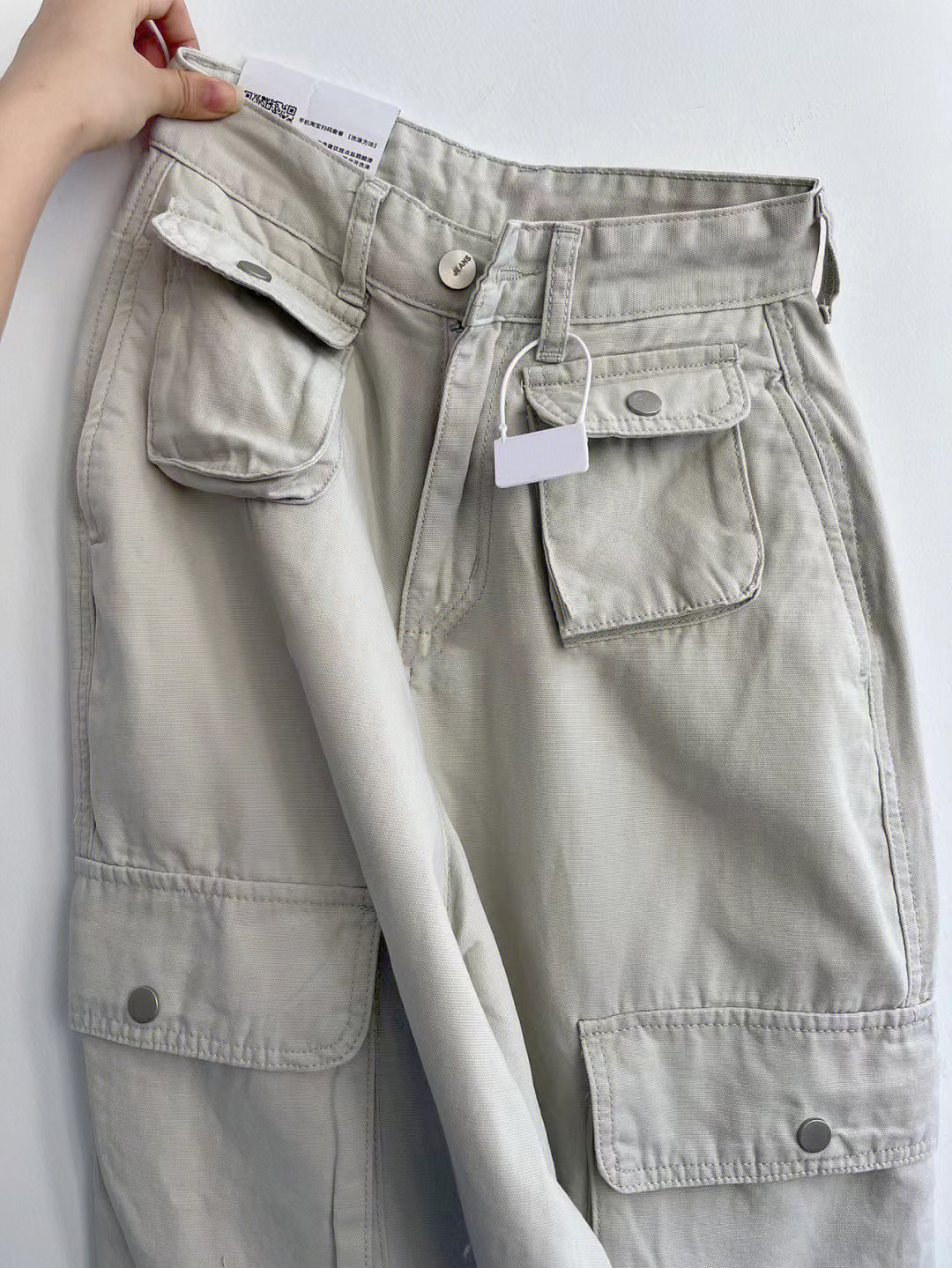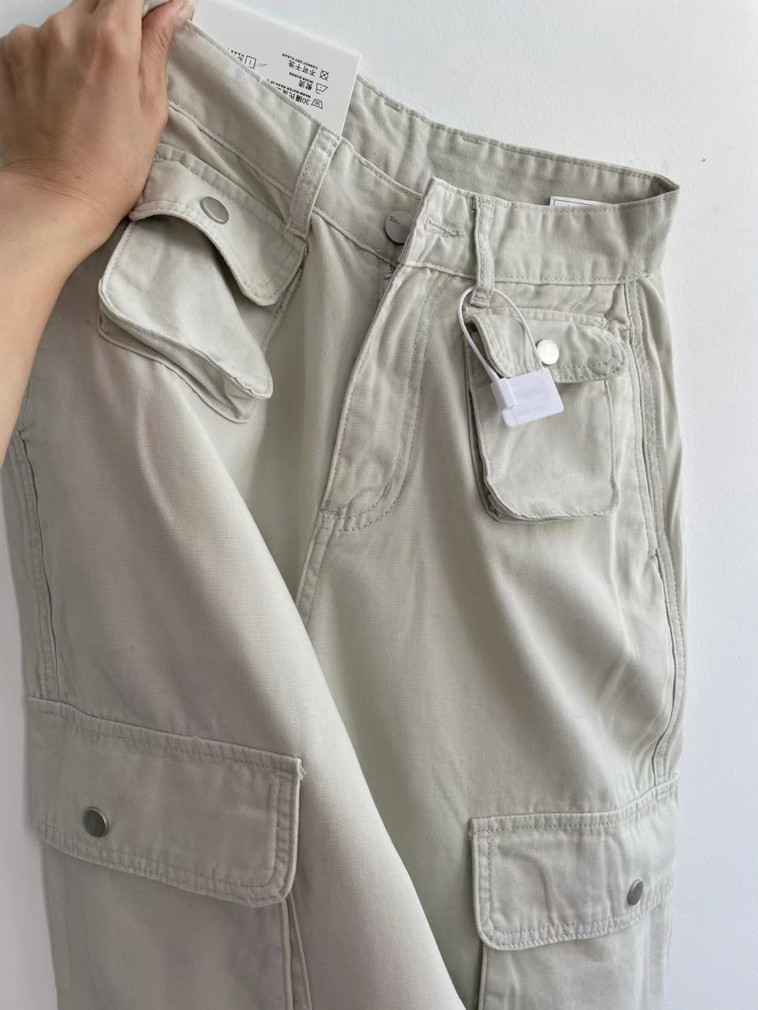 美式高街米白色工裝褲女秋季設計感寬鬆闊腿褲hiphop休閒運動褲子