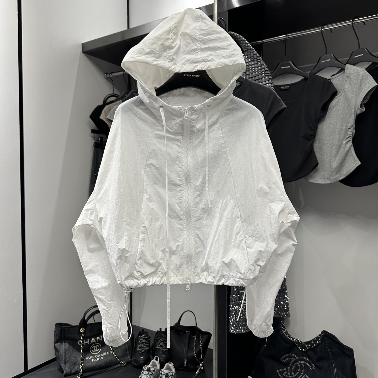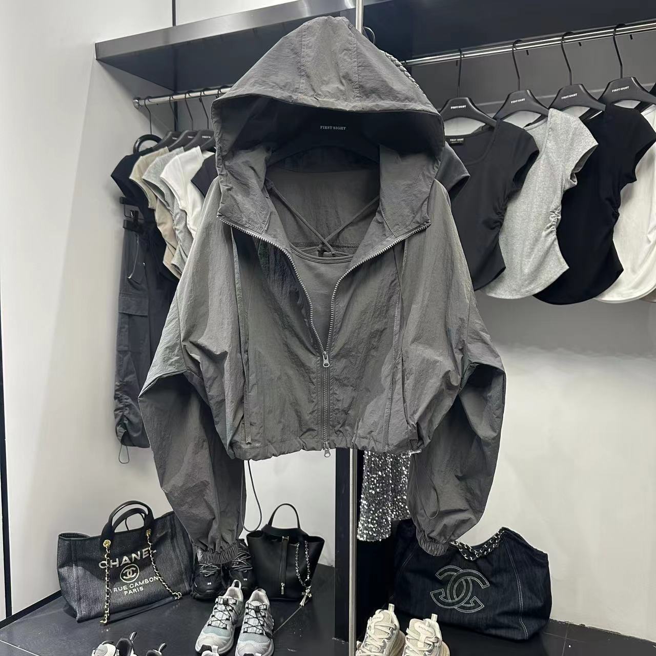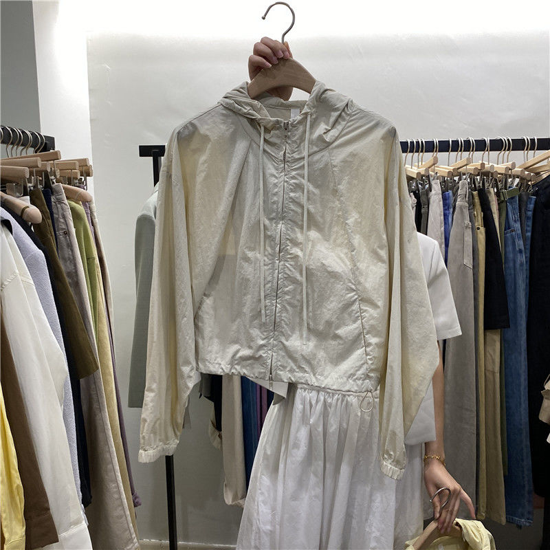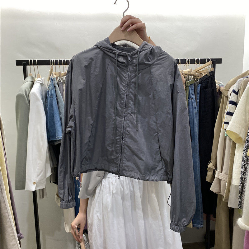 連帽防曬外套女薄款春夏寬鬆衝鋒衣抽繩廓形氣質甜酷短款夾克上衣