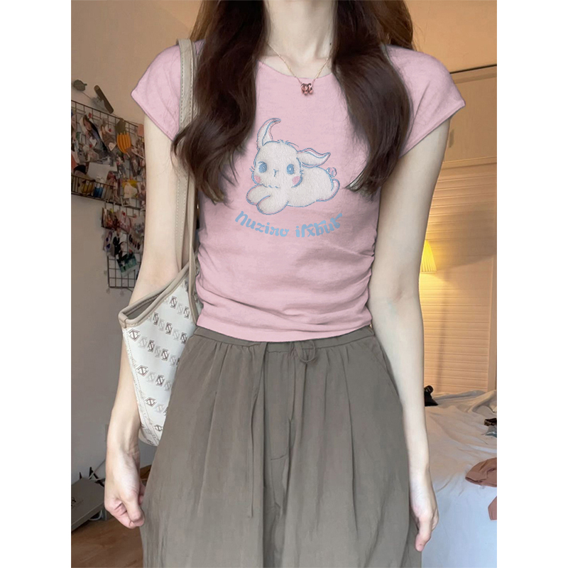 粉色正肩短袖t恤女夏季设计感小众小飞袖褶皱修身短款甜辣小上衣