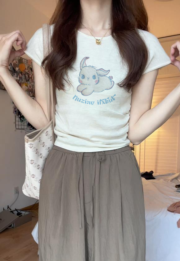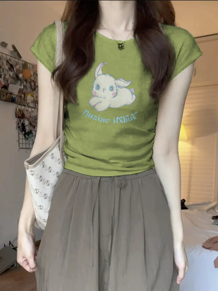 正肩小飞袖短袖t恤女夏季新款设计感小众收腰褶皱修身短款上衣