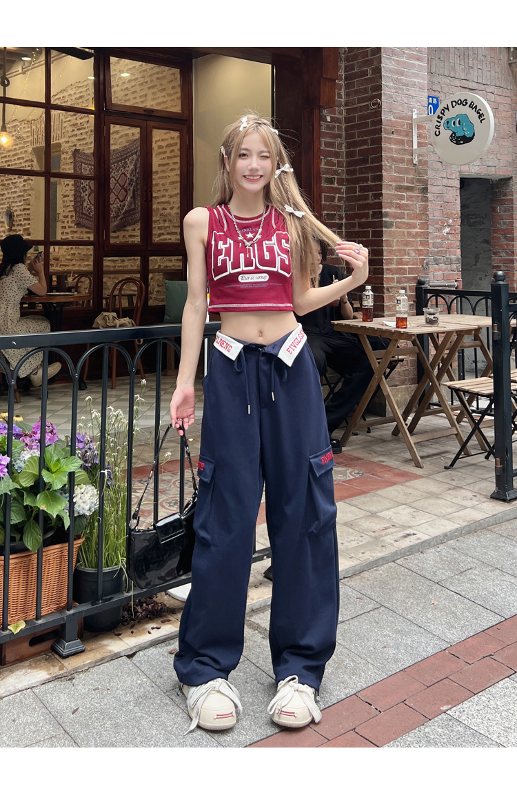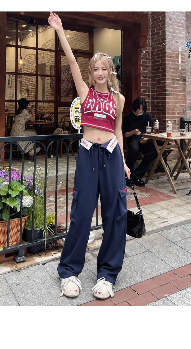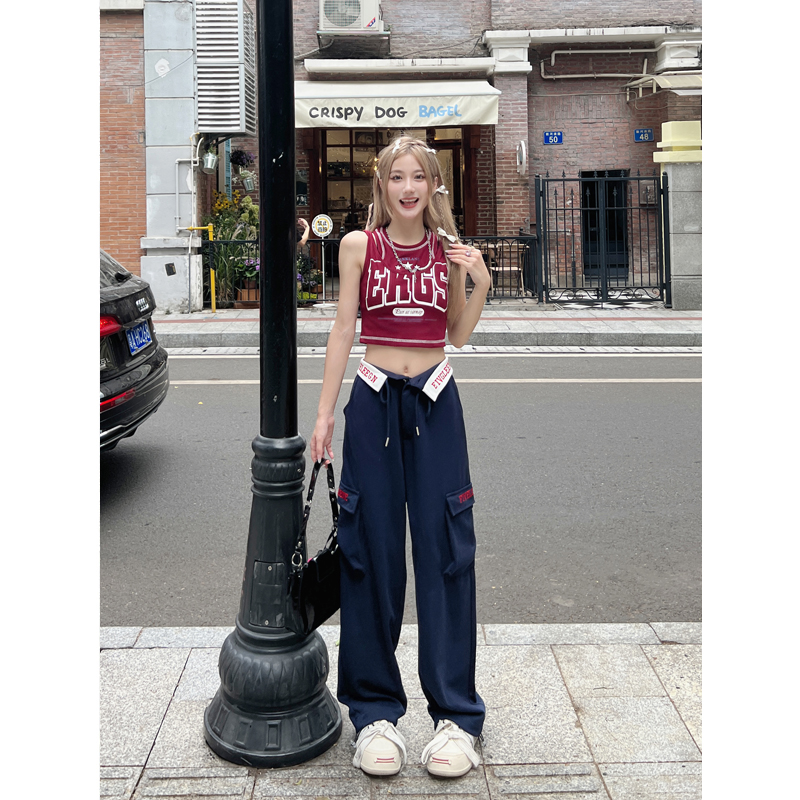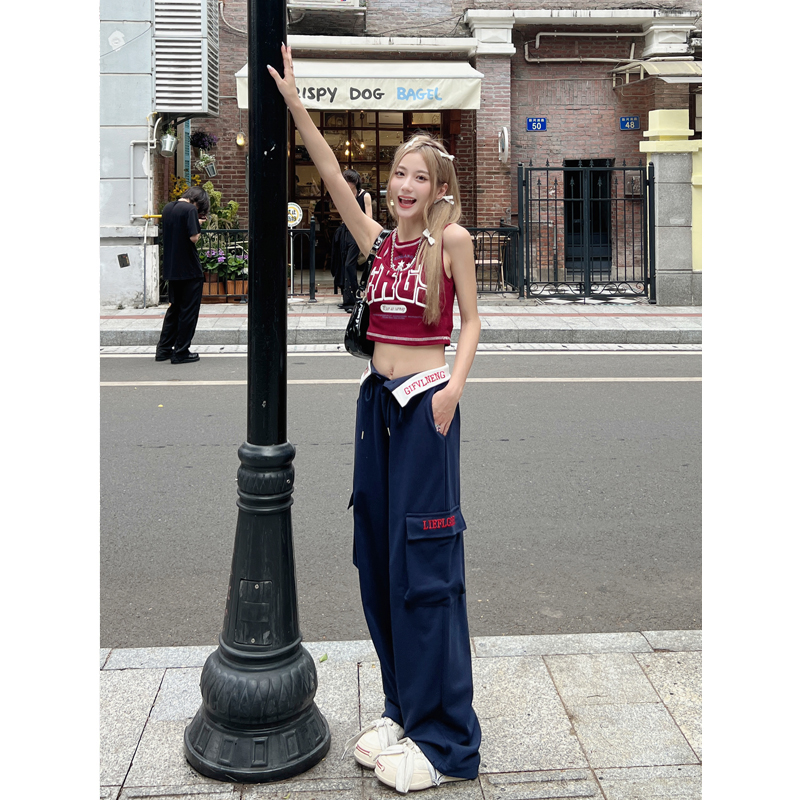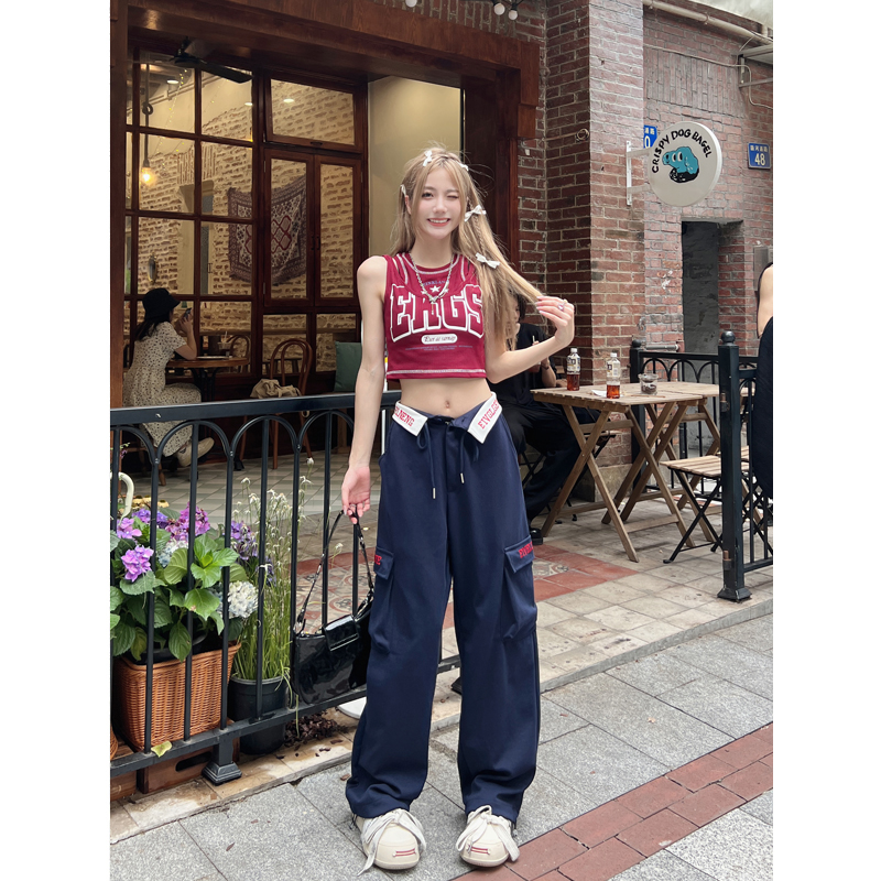 七七不是77/藍色辣妹工裝褲女夏天2023新款捲邊設計感闊腿痞雅褲