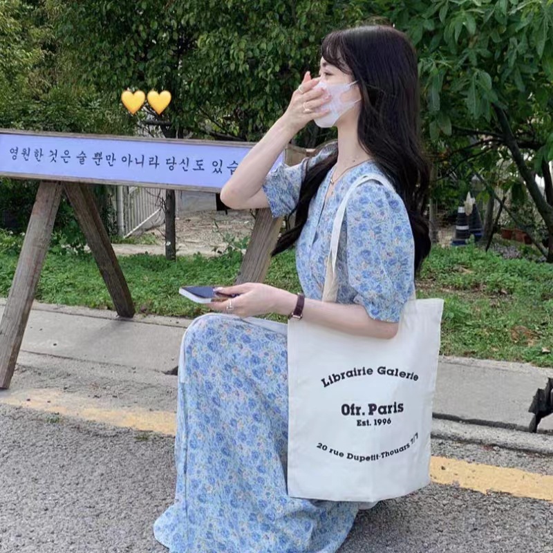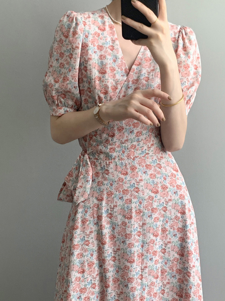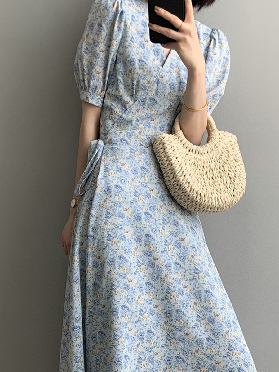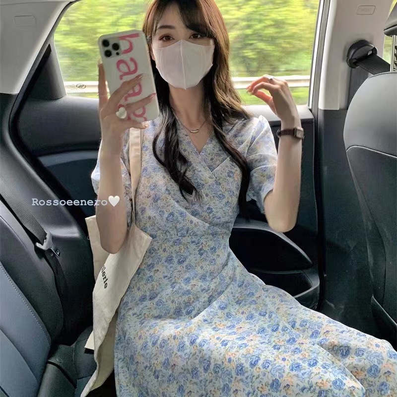 法式初恋桔梗v领连衣裙女夏新款高级感小清新奶甜超仙碎花长裙子