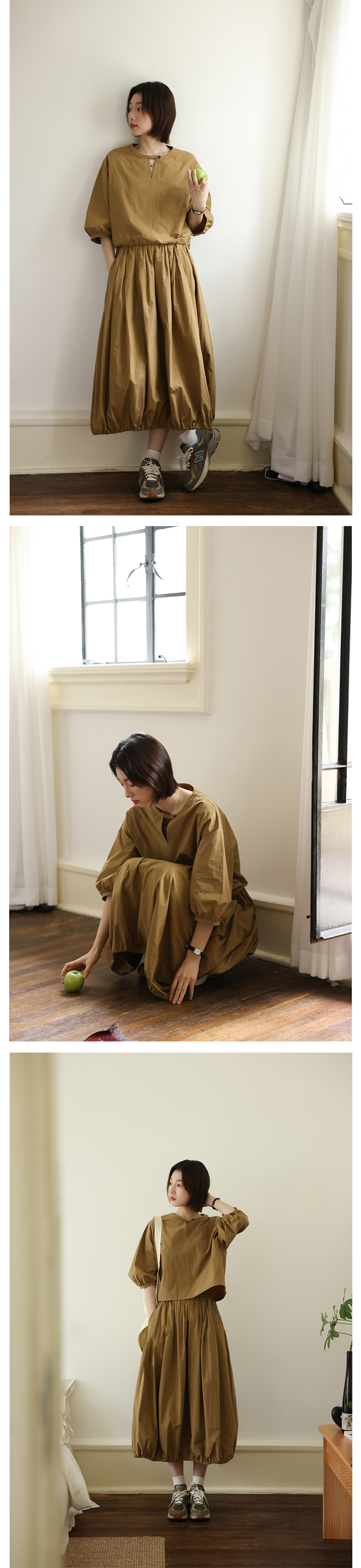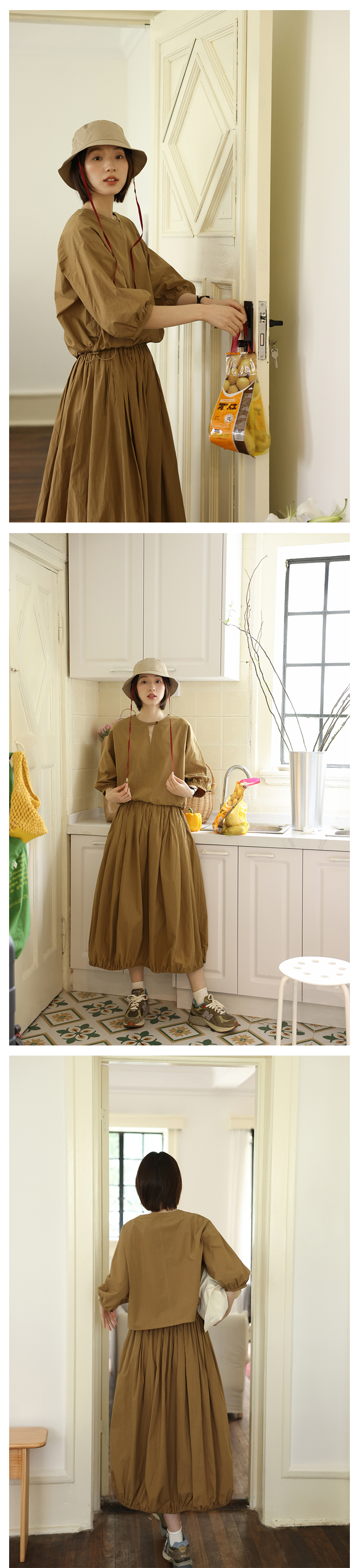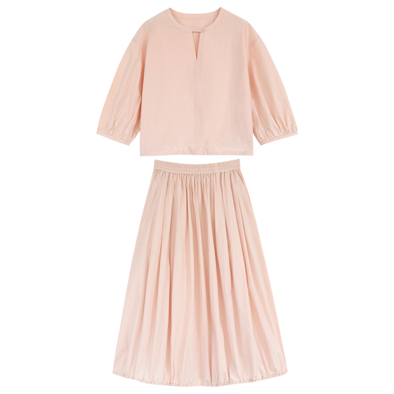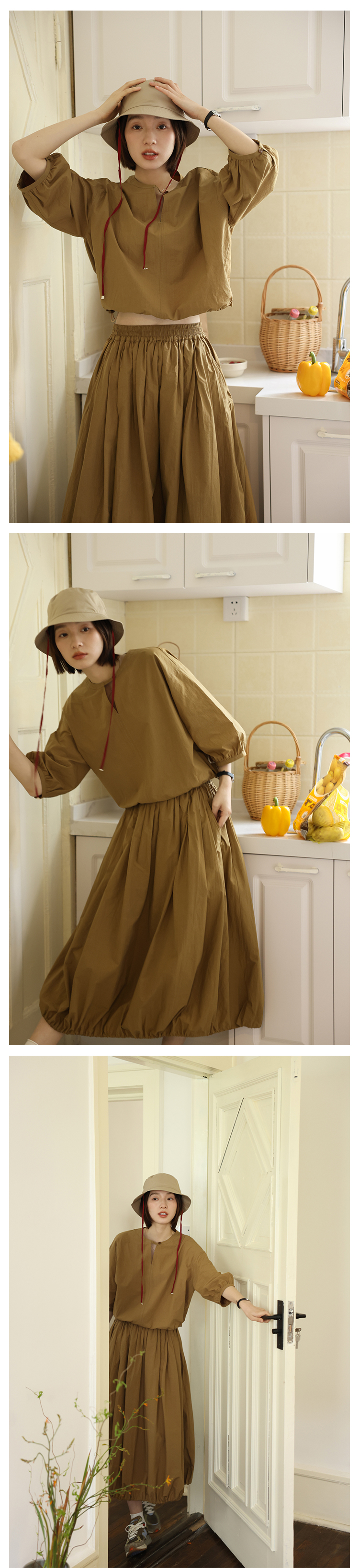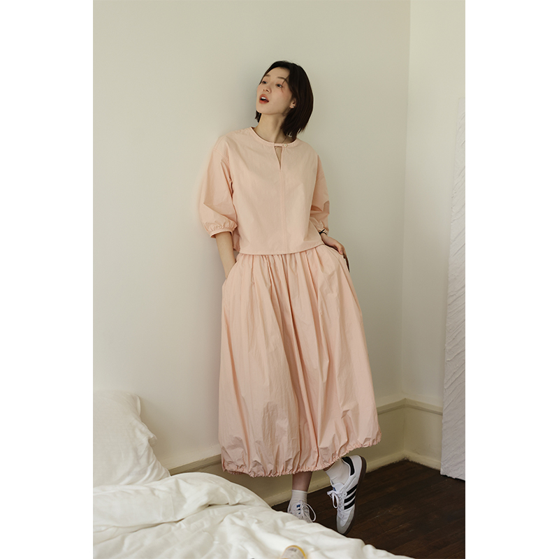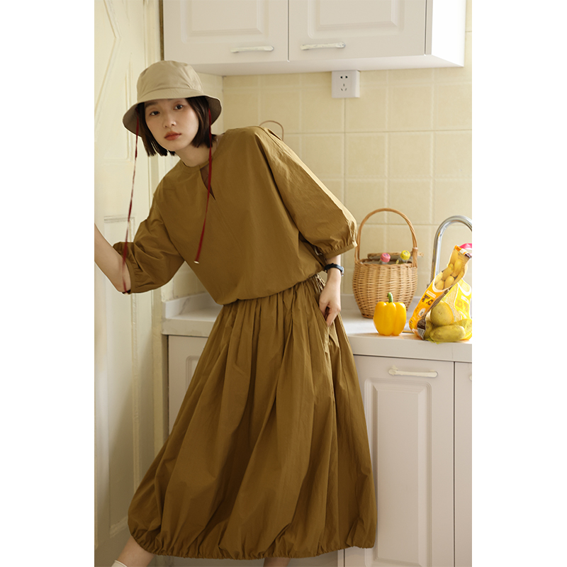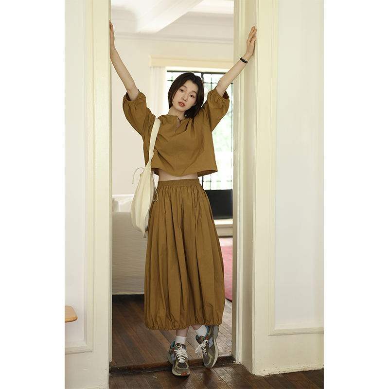 敘舊oldtimes紙感100棉砂洗工裝風短款燈籠袖襯衫/花苞半裙 C2116